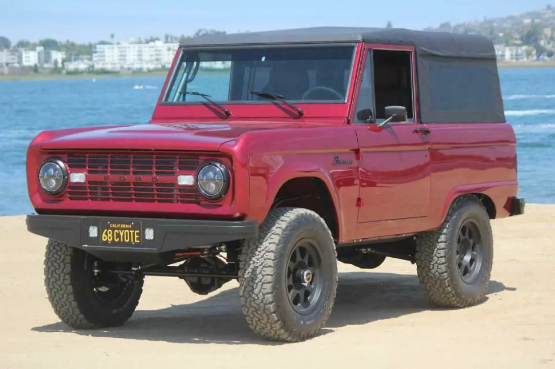 There are 71 Photos in this listing please scroll down to view all or click enlarge to open in new window Donor 1968 Bronco arrived from a local Bronco collector in early 2016. Since a restomod was planned, the initial task required stripping the donor down the frame and body. The Owner quickly enlisted the services of John Cole at Elite Broncos in El Cajon, CA. John is a highly experienced classic Bronco builder and Baja truck-racing enthusiast. John has built numerous high end Broncos, from street cruisers to rock crawlers. While we initially planned a nice restomod in the $60-70k range, the plan evolved as we ultimately decided to attempt to build one of the nicest classic Broncos in the world. All of the frame, body and paint work was completed by Braun Mollenhauer – highly respected fabricator in Alpine, CA. The frame and body were stripped completely. The body received new floors throughout, new firewall and “uncut” rear quarter panels were grafted into the existing “cut” quarter panels to restore the Bronco to its uncut originality. The frame was powder coated and reinforced throughout. Since we decided on a Coyote power plant, we upgraded the rear suspension from the traditional leaf springs to a quad link system sourced from Krawler’s Edge to provide better traction and stability for the increased Coyote power: krawlersedge .com quad-link-a-custom-4-link-system-by-krawlers-edge/ The frame was also reinforced for the front suspension – Bilstein Racing shocks with nitrogen reservoirs were installed. Total lift is approximately 4 and ½ inches – 2 “ body lift and 2 and ½” suspension lift. New front and rear axles were sourced from Bronco Connection – Dana 44 front axle and Ford 9” rear. Both were equipped with new Wilwood disc brakes (front and rear). The rear axle was narrowed 1” to ensure proper clearance for the rear uncut fenders. The front axle is equipped with premium Warn locking hubs. Following body fabrication, a Viewfinder windshield was sourced from a vendor in Canada (it was actually the last one in existence). Braun completed the fabrication of integrating the Viewfinder windshield into the body – this windshield allows for relocation of the windshield wipers and motor from the top of the windshield to the more traditional modern placement below the windshield, allowing for much improved visual clearance. It’s an extremely rare upgrade that isn’t seen on $300k Broncos. Braun also crafted a custom fuel door on the driver’s side rear quarter panel. A new fuel tank was also installed in the rear of the vehicle. We chose a modern Ford Ruby Red paint color (same color on Ford Raptor) for this build. It is a staged paint – base, followed by clear coat. Braun coated the floors with a paint matched Rhino Lining bed liner product to effectively seal the floors. The body, hood and engine bay were completed in Ruby Red. The interior floors and firewall then received Lizard Skin insulation throughout before final covering with custom carpeting. Braun also fabricated a custom mesh insert that sits behind the original grille – creating a mild modern feel upon inspection. Front and rear bumpers were sourced from Cal Auto Creations, a custom fabrication shop in Nebraska: Both bumpers were further modified locally to create a streamlined and leveled appearance. AMP Power Steps were installed – they run the entire length of both rocker panels – automatically open and close when the doors open/close and have under mount LED lighting for safety. A custom six-point family roll cage was fabricated, and powder coated in a silver vein finish. This roll cage ties into the frame as well as multiple anchor points on the body. A custom dash was fabricated – with relocation of the instrument cluster from the traditional left side of steering wheel to a more centered position on the dash. The instrument cluster is the most upgraded Dakota digital HDX option: A generation IV Vintage Air conditioning system was installed as well as 2 Switch Pro control units to accommodate all electronics and lighting. Extra USB ports were also added to the dash for accessory control. The emergency brake pedal was deleted – in favor of an electronic e-brake from e-stop. On/off button is under lip of dash. A custom steering wheel was ordered from Budnik in a complementary gray powder coat and wrapped with matching BMW leather. Howard McKee – a local well-known custom interior fabricator, completed all of the interior seating and aesthetic upgrades. The owner sourced front bucket seats from a salvaged BMW 650i convertible. Both seats have functional 18-way power control, 2 stage heating and the driver’s seat has 2 memory functions. The seats also have integrated 3 point seat belts. The donor seats were recovered in Dakota brown leather. The rear fold and tumble bench seat were sourced from a modern Jeep Wrangler 2 door. This was also recovered in the matching BMW leather. 3-point seat belts for the rear bench seat are secured into the roll cage for added safety. Custom door panels that span the entire interior door add a high-end custom feel to the interior. These panels are covered in the same BMW Dakota Brown leather and a gray leather accent stripe. The rear interior quarter panels are also covered in the BMW Dakota Brown leather. A center console from Icon 4x4 completes the aesthetics of the cockpit. This console houses a Pioneer Apple Carplay (satellite capable) head unit, power window controls for the front windows and seat heater switches. A backup camera was integrated into the rear bumper and connected to the Pioneer head unit. Front and rear speakers were installed and recessed into the front and rear quarter panels for a more stealth finish. For further customization control, we opted for an electronic transmission controller as it allowed a way to delete the usual column shift for the Ford automatic 4R70W transmission and provides more specific control for 