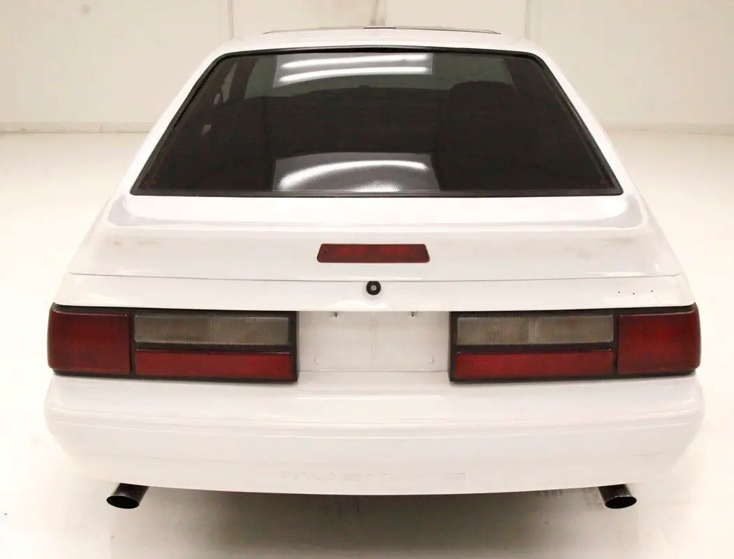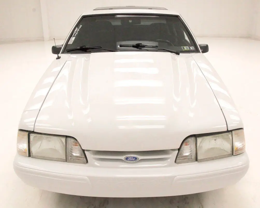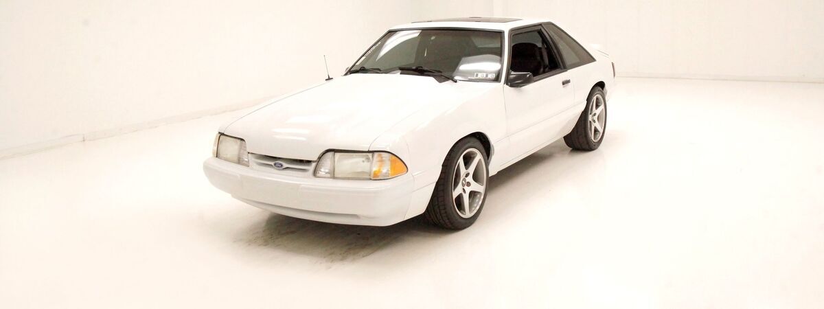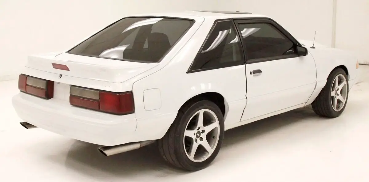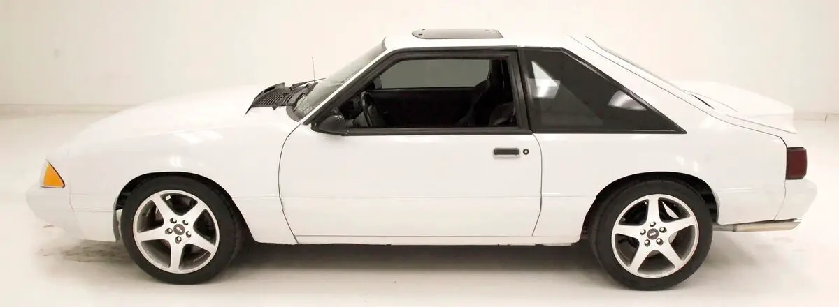 1993 Ford Mustang LX Hatchback For consignment, a car that is just as capable on the street as it is on the track. With a built up factory engine with speed and power upgrades a plenty, this car is now a pocket rocket Foxbody Stang, with a sting right out of 1993. A 325hp 302ci EFI fed engine graces the bay where the original 225hp 5.0 liter V8 used to sit, along with a 5-speed transmission, racy interior, new paint, and updated suspension. Street lethal if you will. Due to modifications of the emissions control devices installed by the manufacturer, please check your local, state, and federal laws to determine if this vehicle is applicable for use on public highways in your area.* Exterior This dual purpose hatchback is painted in a fresh application of crisp white paint and has straight steel panels which mind their gaps nicely. A few chip off are noted around the mid bodyline molding as well as a few scuffs on the bottom of the front fascia. A body matching integrated front bumper, dark tinted windows with black surrounds, and some rectangular headlights are framed by a fairly bold and muscular Cobra-R cowl induction style leading back to the rearward raked windshield. Slightly tinted factory wraparound tail lights are just below the rear trunk deck and above another body matching rear bumper. All of this resides in the shade of the factory rear spoiler. 17-inch SVT Cobra wheels are on all 4 corners, and up front wrapped by 245/45ZR17 tires, and on the rear, 275/40R17 rubber from 2022 and 2020 respectively. Save for the hood, this is a naturally occurring unassuming Fox Bodied Mustang LX. BUT! Interior A swing of the doors allows us to shake hands with a full on charcoal, gray, and black interior provided for your straight line enjoyment. Deeply bolstered articulated bucket seats grab you and hold you with a firm snuggle and both show with light outer upper bolster wear. These bolsters are smooth and have snappy red stitching and for the inserts we see some charcoal suede inserts for a little extra pizazz. The rear seat has been removed in the name of weight savings and gives us a view of the fully carpeted cargo area. Lightly soiled black carpet covers the flooring up front and floats not only the seats but the black plastic console with cupholders, a small storage tray and the leather wrapped shifter with its black and gray knob. The factory installed black airbag steering wheel sits atop the factory column and a factory instrument cluster floats just ahead. Dash central holds some heater vents, the heater and AC controls and just below is an opening where a radio once was. Hovering just above is a black felted headliner, tight and alright perfectly framing the pop up tinted sunroof. Drivetrain The 302ci V8, 5.0 liter V8 for those of you using the metric system, engine has all the fixings and is adorned with worked over ported Trick Flow aluminum cylinder heads, a fairly radical Trick Flow Stage 2 camshaft, and a Trick Flow intake manifold. Our consignor states that this combination makes a tire shredding 325hp, but no documentation has been provided to back up this claim. Feeding the proper and copious amount of air and fuel are light blue topped, (24lb/hr), fuel injectors and work with a cold air intake and a BBK mass air meter. On the back is a world class Tremec T5 5-speed manual transmission fitted with a Ram clutch. In charge of turning the rear tires is a 31 spline axle equipped Ford 8.8" with 3.55 gearing and TracLoc. Sheesh! I'm sweating with anticipation on the test track, which will be a straight-line version today! Buckle up! Undercarriage A 4 link and coil spring rear suspension with UPR chromoly tubular arms, KYB shocks and Eibach springs helps plant the ponies and subframe connectors are seen tying the unibody together and giving the chassis some extra stiffening. Up front is a UPR tubular K-member, and an independent front suspension with more chromoly UPR tubular arms and Eibach coil springs and KYB struts. All solid and rust free, nicely put together, and topped off with BBK equal length headers, a BBX off-road X pipe, (no catalytic converters), and Flowmaster mufflers with polished tips ending under the rear bumper. The whoah factor is provided by 5 lug 1998 cobra power disc brakes up front and 5 lug power drums in the rear. Drive-Ability It fired up with a thunderous roar, and our test driver, who doubles as my sidekick decoder, took her for a spin, and spin it did, especially for the rear tires. He said launching was awesome, and of course did not get close to any top speed, but it is reported it goes like hell. Racing aspect aside, this skate can still be driven as a hopped up street car with nearly all functions operational save power mirrors not moving, the passenger's power window not functioning, the driver's power lock not actuating, (it does lock manually), and the reverse lights not lighting up. We also noted that the heater core has been bypassed and the AC lines have been removed. Take a Fox body and spend some cash on it to make it go straight, and you now have a super 'Stang, a Muscle Mustang, and a powerful pony. A few faults and flaws on the functionality, but overall an excellent build with quality parts, and capable of being a multi-purpose tool. Smoke the competition on the straight line and look good at the local shows. 1FACP41EXPF186590 1-USA F-Ford Motor Company A-Passenger Car C-Manual Belts, Driver's Airbag P41-LX Hatchback E-5.0 Liter V8 EFI 205hp X-Check Digit P1993 F-Dearborn, MI Assy Plant 186590-Sequential Unit Number