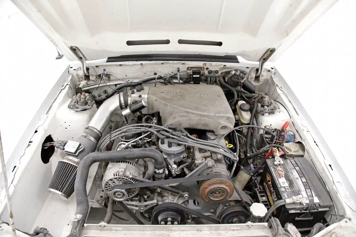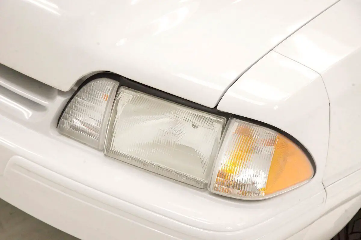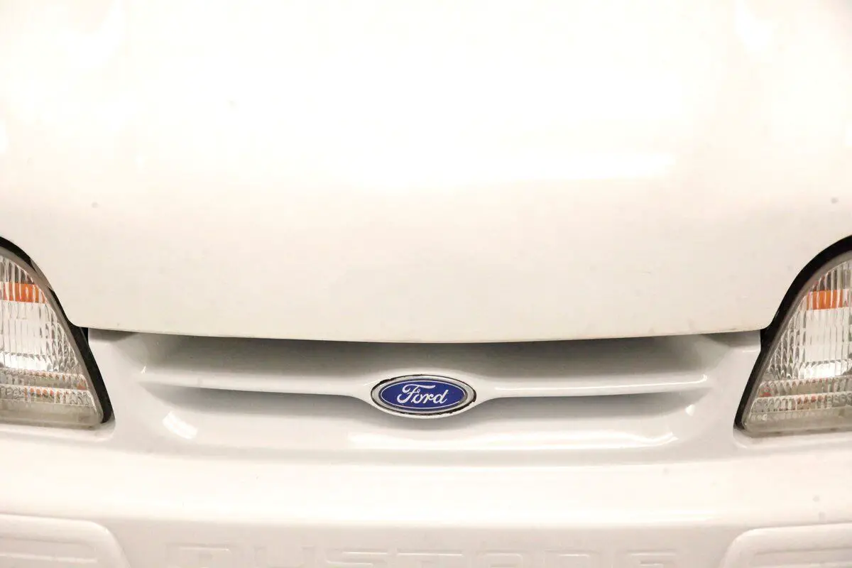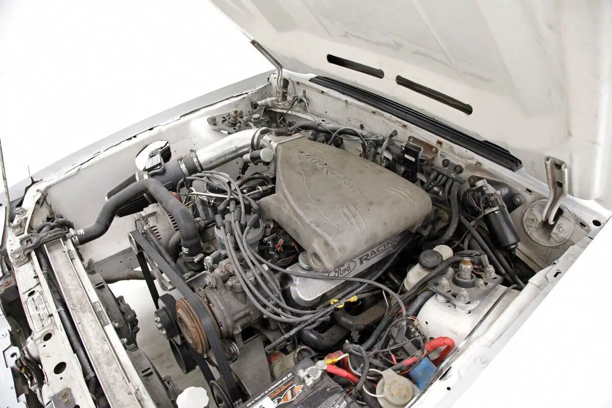 This dual purpose hatchback is painted in a fresh application of crisp white paint and has straight steel panels which mind their gaps nicely. A few chip off are noted around the mid bodyline molding as well as a few scuffs on the bottom of the front fascia. A body matching integrated front bumper, dark tinted windows with black surrounds, and some rectangular headlights are framed by a fairly bold and muscular Cobra-R cowl induction style leading back to the rearward raked windshield. Slightly tinted factory wraparound tail lights are just below the rear trunk deck and above another body matching rear bumper. All of this resides in the shade of the factory rear spoiler. 17-inch SVT Cobra wheels are on all 4 corners, and up front wrapped by 245/45ZR17 tires, and on the rear, 275/40R17 rubber from 2022 and 2020 respectively. Save for the hood, this is a naturally occurring unassuming Fox Bodied Mustang LX. BUT!