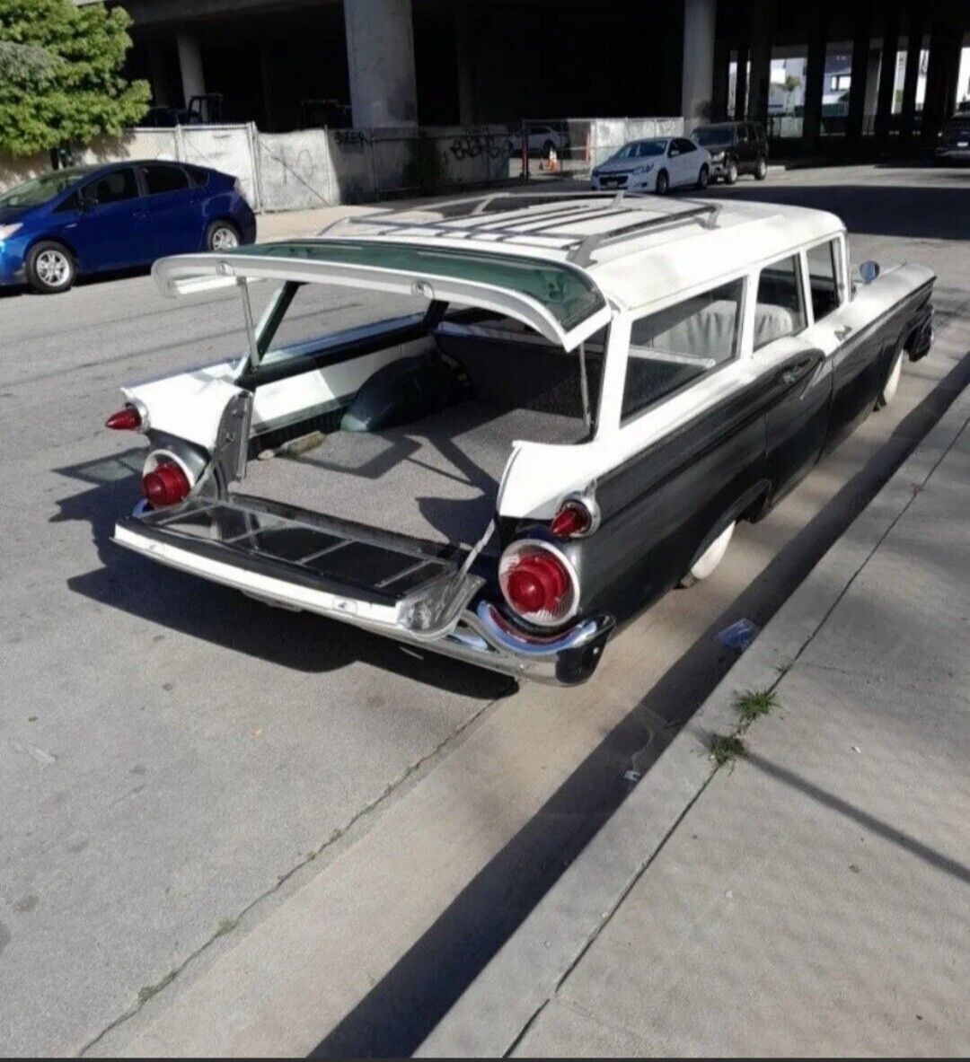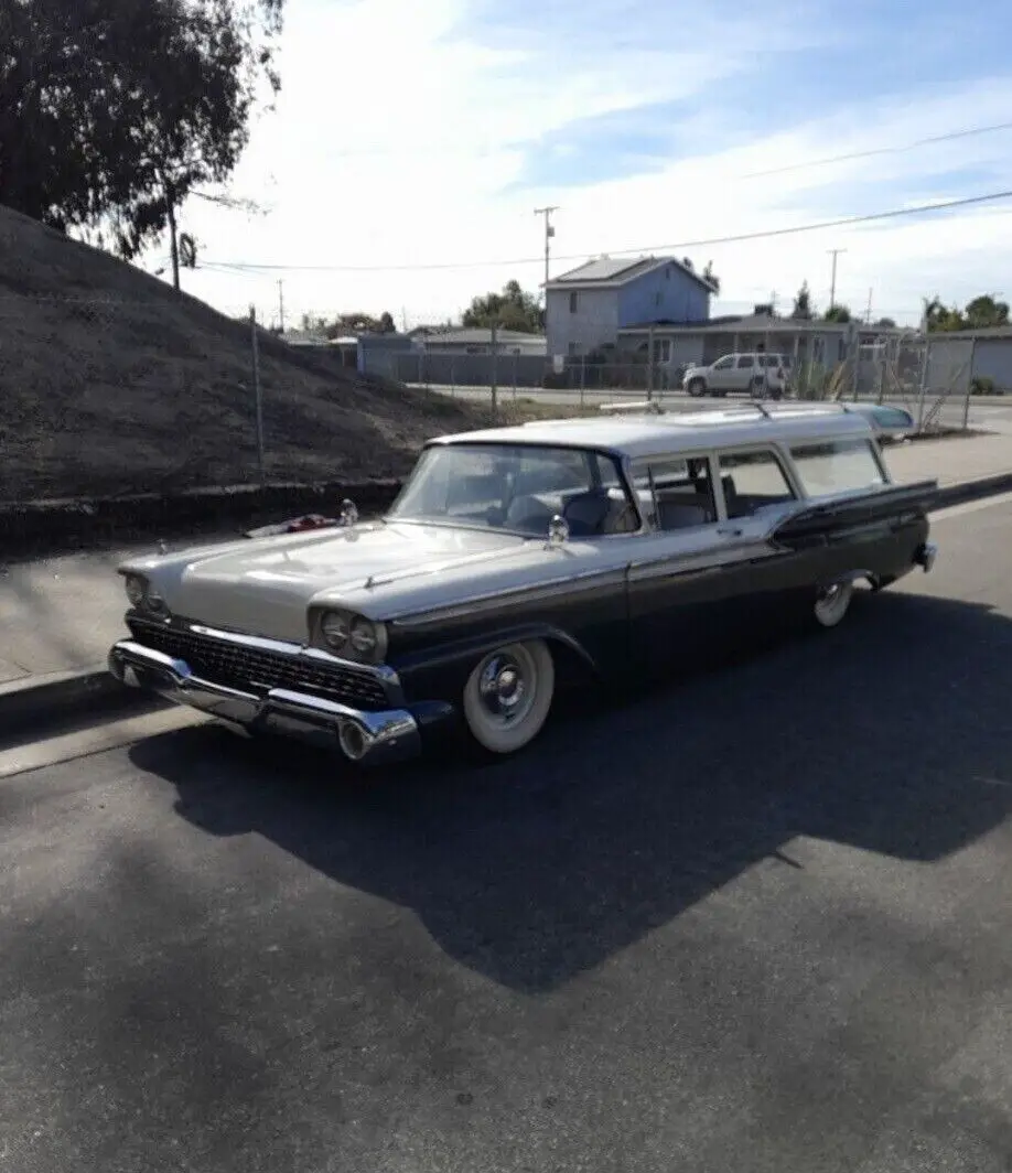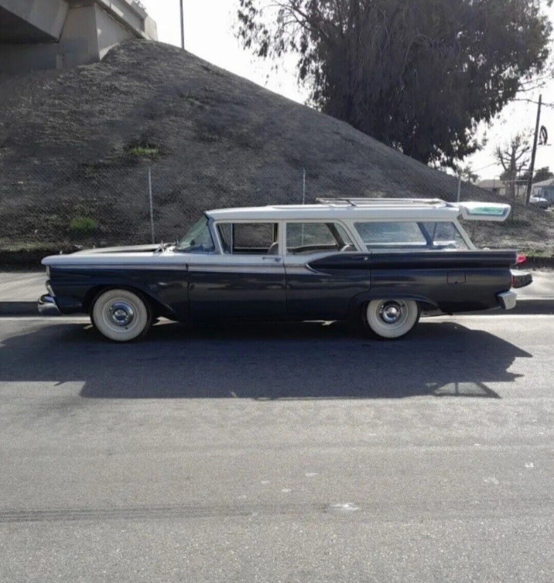 1959 Ford Country Wagon. 302 Ford motor . Motor/trans just rebuilt. Auto trans. New brake system. New radiator. New carburetor. New gas tank and system. New upholstery. Interior is black, white & grey. All glass in great condition. Fresh paint. Paint colors are Charcoal Grey with small flake & Wimbledon White.Electric radiator fan. Good tires. Wagon has air ride suspension system. Frame touches the ground when lowered, or goes up off the ground a foot to get over speed bumps or to get through driveways. Wagon has shocks all around for a smoother ride. Bumpers and grill chromed all around. New wiring harness installed by pro auto electrician. Paperwork new and up to date.