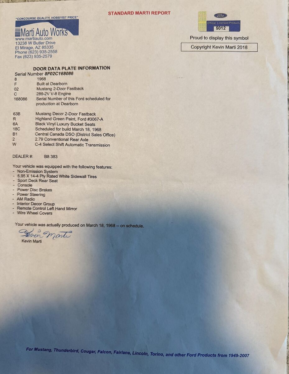Vehicle Original VIN : 8F02C168086SUPER SHARP BULLITT THEME 1968 FASTBACK C-CODE 289 5SPD POWER STEERING POWER DISC BRAKES TACH FOLD DOWN REAR SEAT SOLID & STRAIGHT FACTORY CORRECT EXCELLENT COLOR COMBO BEAUTIFUL HIGHLAND GREEN WITH FACTORY DELUXE BLACK BUCKETS INTERIOR NICE AND SHARP DESIRABLE 68 FASTBACK WELL OPTIONED CARVERY DESIRABLE FACTORY CODE “R” HIGHLAND GREEN CAR!VERY GOOD CAR…. READY TO ENJOY FASTBACK WITH BULLITT THEMELONG TERM OWNERSHIP GOOD CARORIGINAL DOOR TAG INPLACEFENDER APRON VIN STAMPING INPLACEDOCUMENTED WITH MARTI REPORTWELL OPTIONED CAR: ? C-CODE 289 ENGINE UPGRADED TO 4BBL ? 5 SPEED MANUAL ? POWER STEERING ? POWER DISC BRAKES ? INDASH TACH ? DELUXE STEERING WHEEL ? SPORT DECK REAR FOLD DOWN SEAT ? INTERIOR DECOR GROUP ? FACTORY DELUXE BLACK INTERIOR ? FACTORY HIGHLAND GREENNICE FACTORY CORRECT DELUXE BLACK BUCKETS INTERIOREXCELLENT DELUXE SEATSSEAT BELTSEXCELLENT DELUXE DOOR PANELSEXCELLENT DASH AND DASH PADEXCELLENT DASH DELUXE WOODGRAIN TRIM BEZEL AND DASH TRIMEXCELLENT FOLD DOWN REAR SEATSTRONG AND SMOOTH FACTORY C-CODE 289 ENGINE UPGRADED TO 4BBL NICE CLEAN AND DETAILED ENGINE AND ENGINE BAYUPGRADED 5SPD TRANSMISSION DESIRABLE POWER STEERINGDESIRABLE POWER DISC BRAKESVERY STRAIGHT SOLID NICE BODY….GREAT FIT AND GAPS…DOORS, TRUNK AND HOOD OPEN CLOSE GREATNICE ROCKERSNICE TRUNK DROP OFFSNEW GAS TANKSOLID NICE TRUNK DETAILED WITH BLACK CARPET MATVERY NICE CHROME BUMPERS AND TRIM AND EMBLEMSBRAND NEW CORRECT TORQUE THRUST "D” 15" WHEELS WITH PERFORMANCE TIRES EXCELLENT LOOK AND STANCE FULL DUAL EXHAUST ALL WAY OUT BACK WITH CHROME TIPS…SOUNDS AWESOME SHARP FACTORY CORRECT VERY DESIRABLE HIGHLAND GREEN PAINT…..BUFFED SMOOTH..DEEP COLOR AND SHINE…..FEW IMPERFECTIONS TOP OF QUARTER PANEL BELOW LOUVERS AREAGREAT COLOR ON A 68 FASTBACKRUNS AND DRIVES BEAUTIFULLY…A PLEASURE TO CRUISE! VERY GOOD CAR!LIGHTS, TURN SIGNALS, DASH LIGHTS, BRAKE LIGHTS, WIPERS, SPEEDO TACH & GAUGES PARKING BRAKE, STEREO RADIO ALL WORK AS THEY SHOULDCOMPLETE WELL KEPT READY TO ENJOY FASTBACK WITH GREAT OPTIONSFOR WALK AROUND VIDEO……. EMAIL…… OR CALL 513-615-5755 PLEASE EMAIL OR CALL 513-615-5755 WITH ANY QUESTIONSEASY FINANCING IF NEEDED THRU JJ BESTCALL CHRIS @ 508-415-1035 OR FOR MORE PICTURES……. EMAIL…… OR CALL 513-615-5755FOR WALK AROUND VIDEO OF CAR RUNNING PLEASE…..EMAIL..…513-615-5755 PLEASE EMAIL OR CALL 513-615-5755 WITH ANY QUESTIONS IF YOU NEED SHIPPING I HAVE A SHIPPING SOURCE THAT HAS VERY REASONABLE RATES AND SHIPS IN A TIMELY MANNER. POSSIBLE OTHER CLASSIC CAR LOAN OPTIONS: TERMS:Notice To Bidders: High Bidder To Send $800.00 Non-Refundable Deposit Within 24 Hours Of The Close Of This Auction. Funds To Be Paid With Certified Check, Bank Transfer, Or Cash In Person Within 5 Days Of Auction Ending. All Sales Final. Mileage Is Exempt. The Sale Is Subject To The Following Conditions And RepresentationsThis Vehicle Is Being Sold As Is, Where Is With No Warranty In Connection Therewith. The Seller Shall Not Be Responsible For The Correct Description, Authenticity, Genuineness, Or Defects Herein, And Make No Warranty In Connection Therewith. No Allowances Or Set Aside Will Be Made On Account Of Any Incorrectness, Imperfection, Defect Or Damage. Any Descriptions Or Representations Are For Identification Purposes Only And Are Not To Be Construed As A Warranty Of Any Type. It Is The Responsibility Of The Buyer To Have Thoroughly Inspected The Vehicle, And To Have Satisfied Himself Or Herself As To The Condition And Value Based Upon That Judgment Solely. Seller Assumes No Responsibility For Any Repairs Regardless Of Any Oral Statements About The Vehicle.May Sell To The Highest Bidder If Reserve Is Not Met And Will Entertain Offers Before End Of Auction. I Reserve The Right To Terminate This Auction At Any Time. Shipping Costs Are The Responsibility Of The Purchaser But I Will Try To Help Anyway I Can. Negative Feedback Bidders Or 5 Feedback Bidders Or Less Please Contact Me Before Bidding. Do Not Bid Unless You Intend To Buy. Thank You And Good Luck! You Are Entering Into A Legal Binding Contract To Purchase The Vehicle Described Above. If You Do Not Intend To Purchase This Item, Do Not Bid! Thank You Very Much For Your Understanding. EMAILS TO OR CALL 513-615-5755 THANKSNOTE: PLEASE CALL ME AT 513-615-5755 WITH ANY QUESTIONS OR OFFERS THANKSPLEASE NOTE THERE IS A TYPO ABOVE….I WILL SELL WORLDWIDE….PLEASE EMAIL IF INTERESTED…..HAVE SOLD MANY CARS TO OVERSEASNOTE: LOW RESERVE......READY TO SELL.....CALL OR EMAIL WITH QUESTIONS OR OFFERS.......CALL 513-615-5755