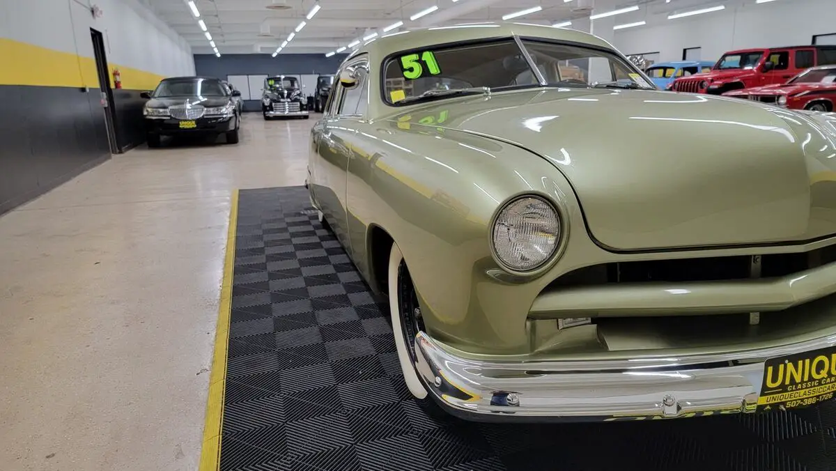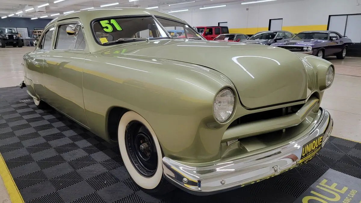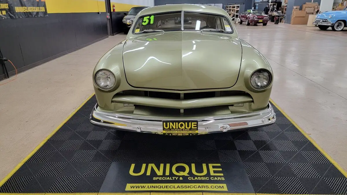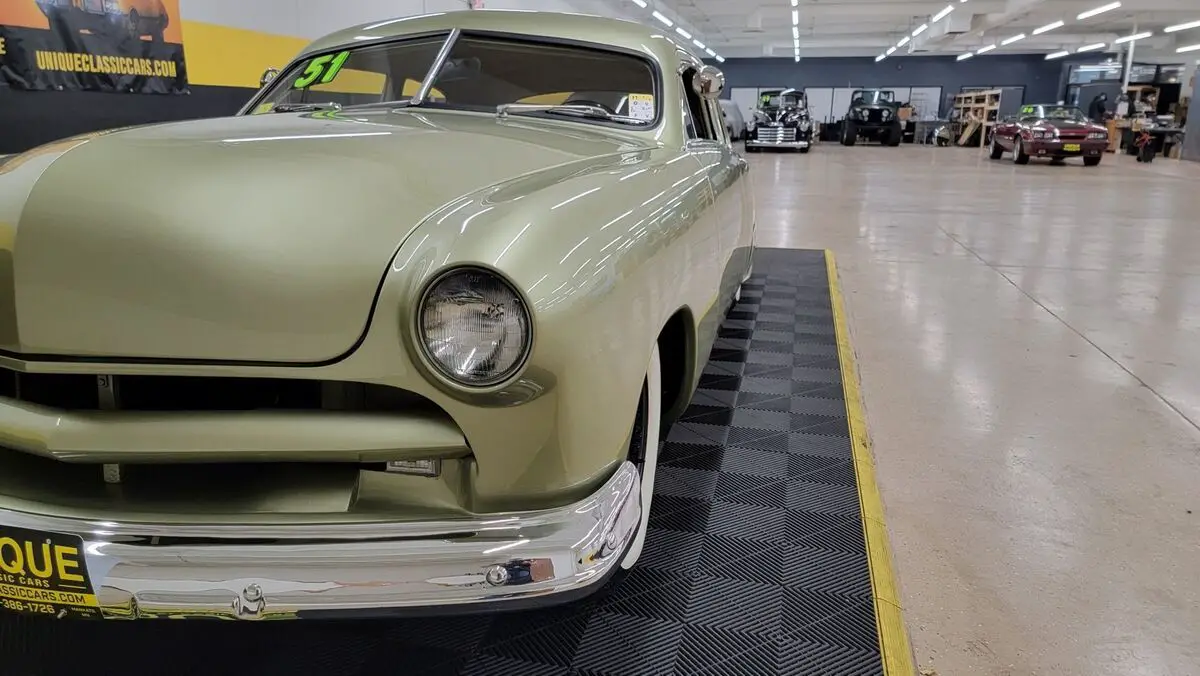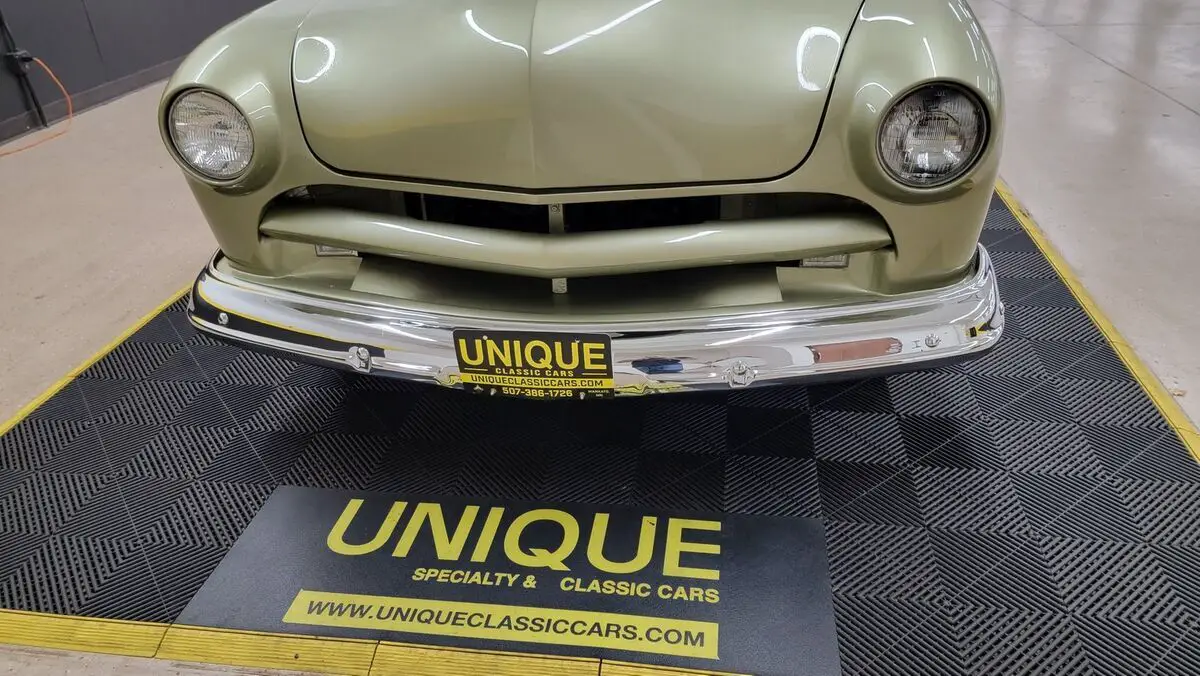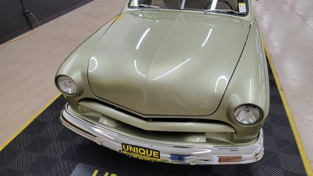 1951 Ford Custom in light green paint. Flathead V8 under the hood with a 3-speed manual transmission. Chrome bumpers look good with the painted front grille. Frenched in headlights and tail lights as well as all emblem removed. Door handles have been shaved and replaced with door poppers activated via key fob. There are a few spots in the in the hood where the paint has some checking, see still photos. Riding on painted black steel wheels with wide white walls, rear fender skirts included. An extra set of wheel covers will be included with purchase as well as a full size spare. Custom neutral cloth/vinyl bucket seat interior with aftermarket gauge cluster and stereo added. Equipped with electric fan and electric fuel pump. Fuel pump switch is under the dash.