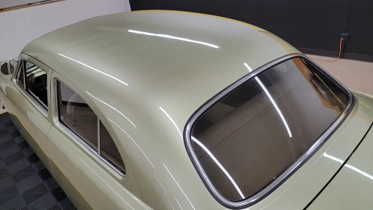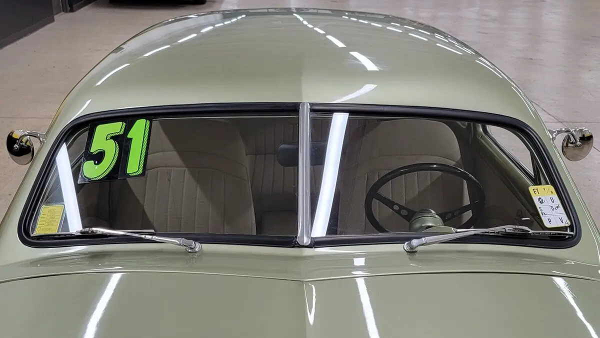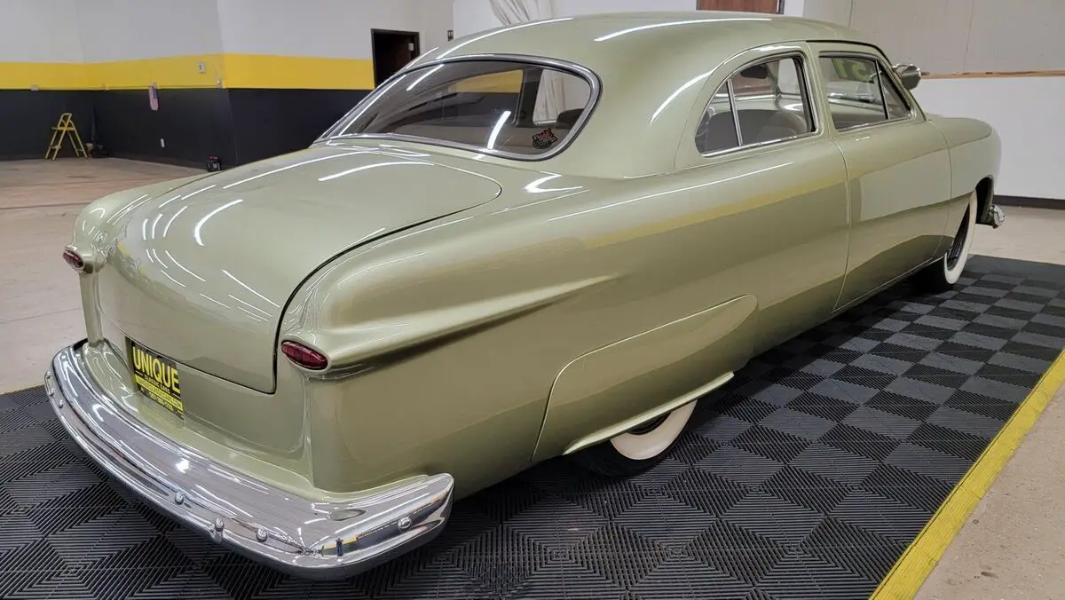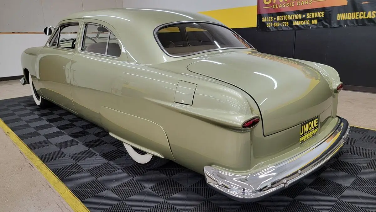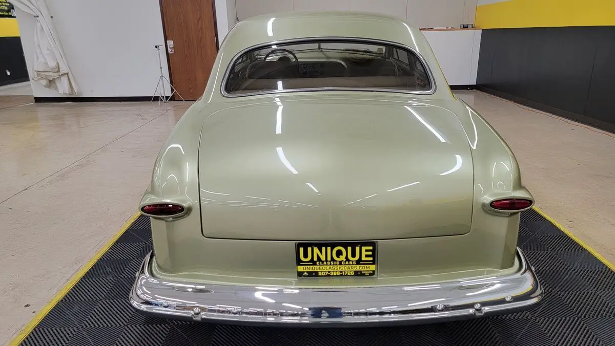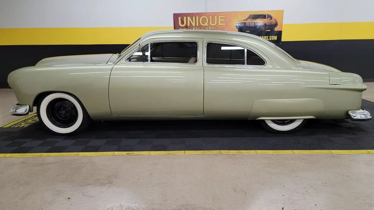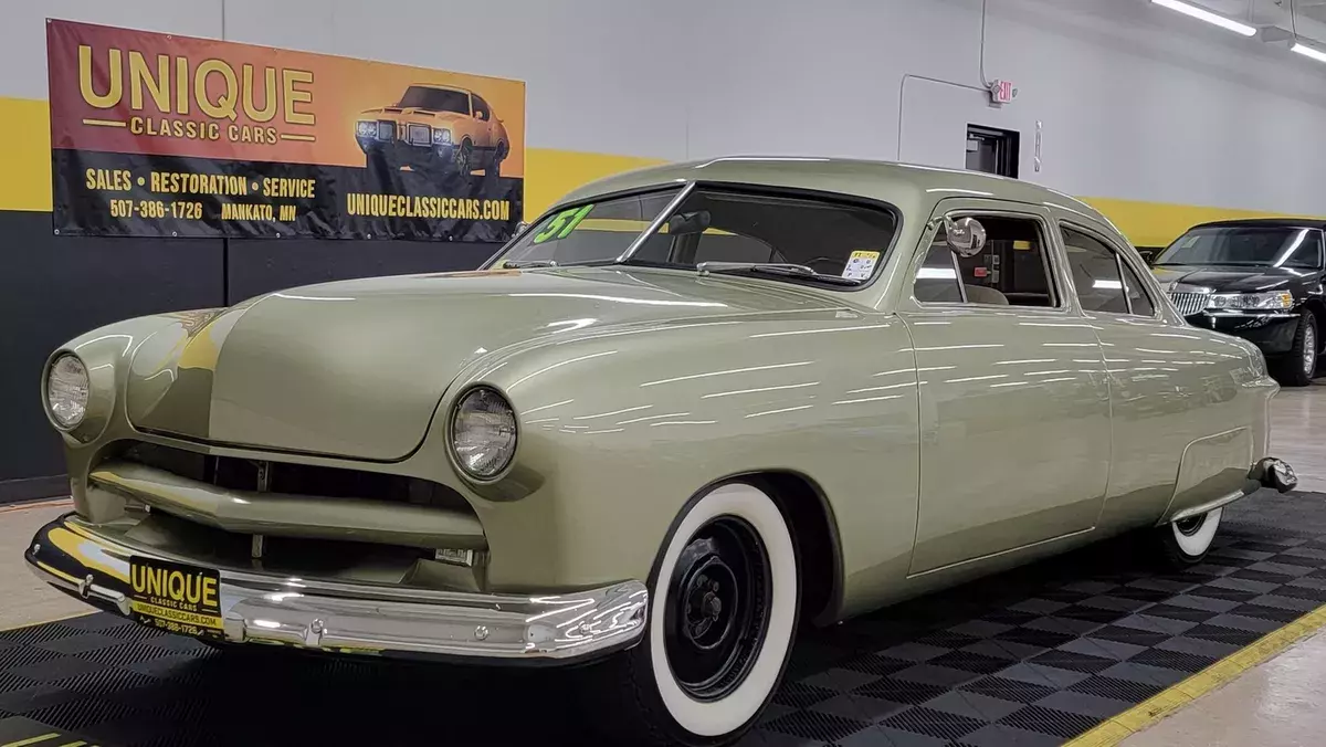 1951 Ford Custom in light green paint. Flathead V8 under the hood with a 3-speed manual transmission. Chrome bumpers look good with the painted front grille. Frenched in headlights and tail lights as well as all emblem removed. Door handles have been shaved and replaced with door poppers activated via key fob. There are a few spots in the in the hood where the paint has some checking, see still photos. Riding on painted black steel wheels with wide white walls, rear fender skirts included. An extra set of wheel covers will be included with purchase as well as a full size spare. Custom neutral cloth/vinyl bucket seat interior with aftermarket gauge cluster and stereo added. Equipped with electric fan and electric fuel pump. Fuel pump switch is under the dash.