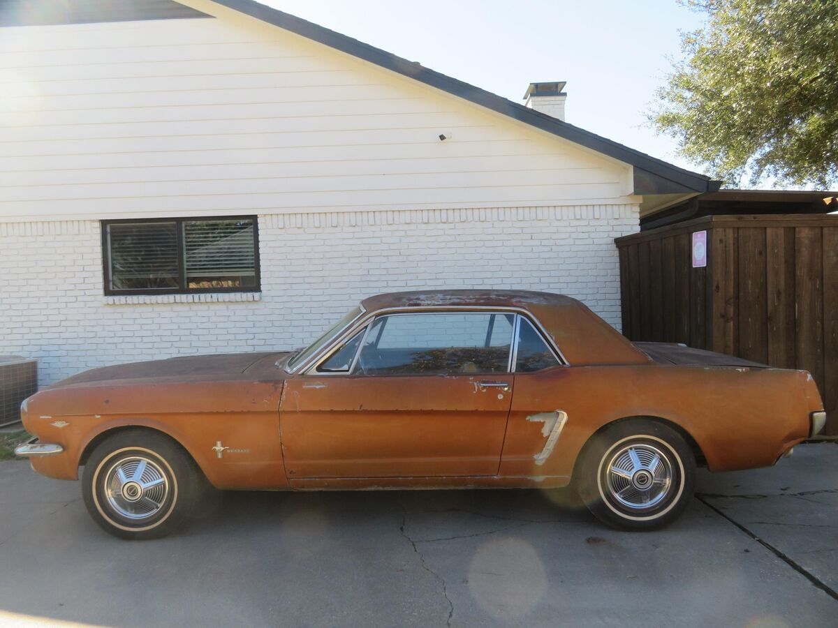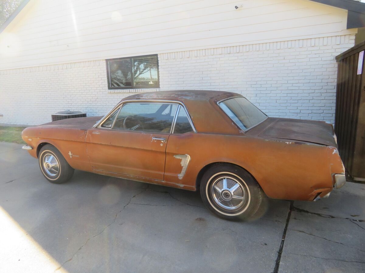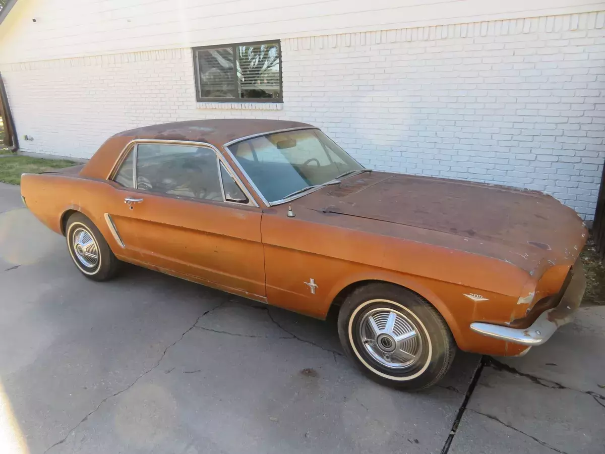 This classic pony is up for auction..... Spent it's life in California and Texas.... A true blue plate classic car from California......Car was sitting for 15+ years....... We got it running again........ Runs and drives now..........Car was originally blue and original owner changed everything to brown/tan as you can see in all the pictures so everything shows to be original which is ideal in restoring a classic vehicle.......The hard part is done (got it running again and installed a new headliner for new owner)........The engine compartment shows all original ........The 289 V8 engine runs and drives.........This pony has a factory 4speed manual transmission.......Factory A code meaning 289 V8 with a 4v carburetor.......Trunk area has a good spare and clean original metal as shown ............. Mustang rides on a matching set of white wall tires w/ factory correct 65' mustang hubcaps ........... Undercarriage shows clean / original 1965 metal .......... Has a new gas tank, new carburetor, new dual exhaust system........In summary this classic pony is a nice investment as it's only going up in value......... Let the pictures speak for themselves ............ Can't go wrong with this car as it's a true first generation 65 mustang that is ready for new owner to restore to their liking..........