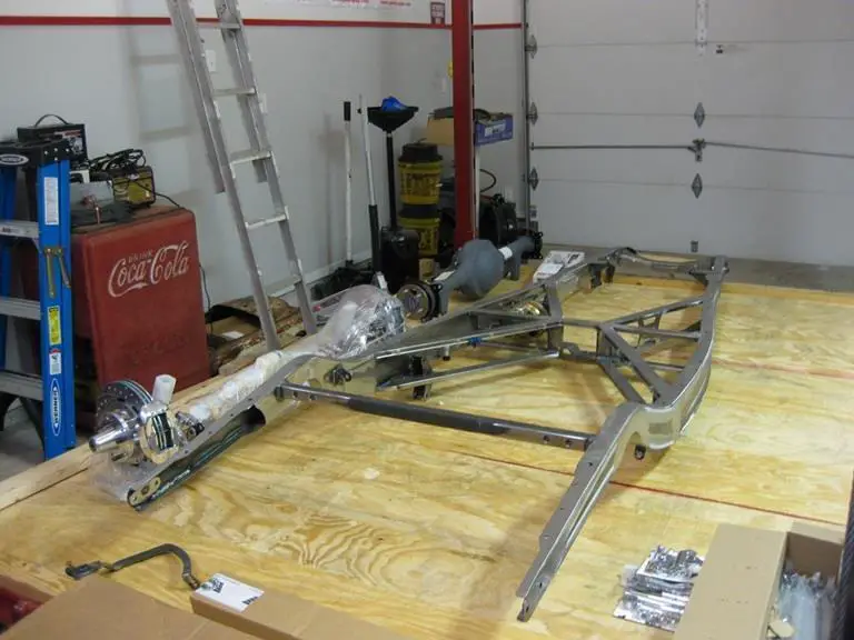 The body is manufactured by N & N Fiberglass Reproductions out of Belleville, AR. They specialize in 32 and 34 bodies. The hood is steel and was manufactured by Rootlieb and the front grill and grill shell are steel and are by Brookville. This is a High Boy because as you can see in the photos, the body sits on top of the frame and was not cut to drop down over the frame.
