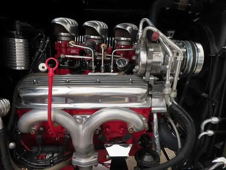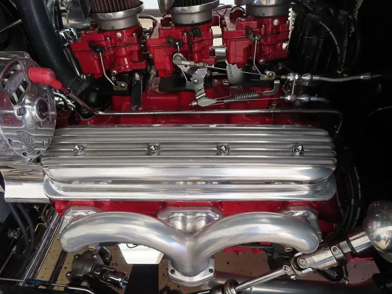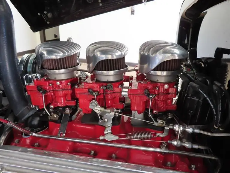 The engine is a crate ZZ4 350 GM long block with 355 HP. The GM ZZ4 longblock features a cast-iron block with 4-bolt main caps, a forged steel crankshaft, and aluminum cylinder heads. This one is fitted with an Offenhauser intake and 3 Rochester carburetors.