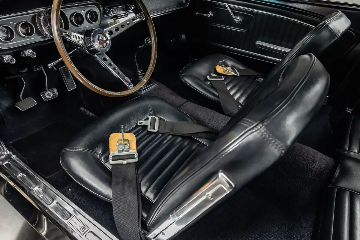 The interior has undergone the same level of restoration as well! The interior has been finished back to its stock spec! Inside, you'll find the stock vinyl bucket seats with the safety harnesses, floor shifter, & fresh black carpeting! On the dash is stock gauges, dash-mounted Cobra tachometer, 3-spoke wood steering wheel, & stock appearing radio! This Mustang is beautiful inside & out and is ready to race!