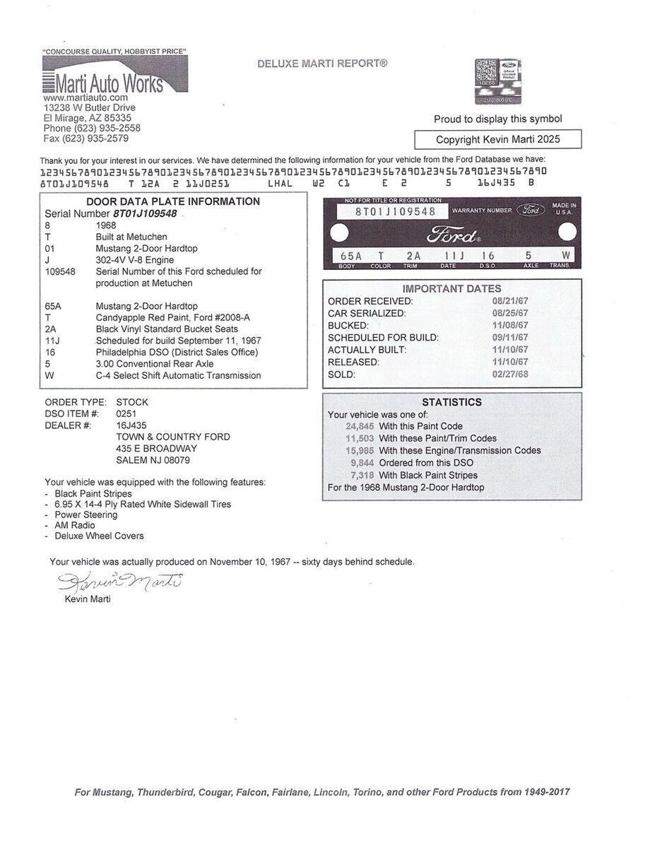 Finished in its factory-correct T-Code Candyapple Red (Ford #2008-A), this Mustang was repainted once in its original color, maintaining the striking look that made these cars so iconic. The body is believed to retain its original sheet metal, a testament to its solid condition. While the car does have minor flaws and chips (see photos), it remains a well-preserved, unrestored example that stands out in any crowd. The Deluxe Marti Report confirms its authenticity, and the original build/broadcast sheet was even found under the seat, providing a rare and valuable piece of documentation.