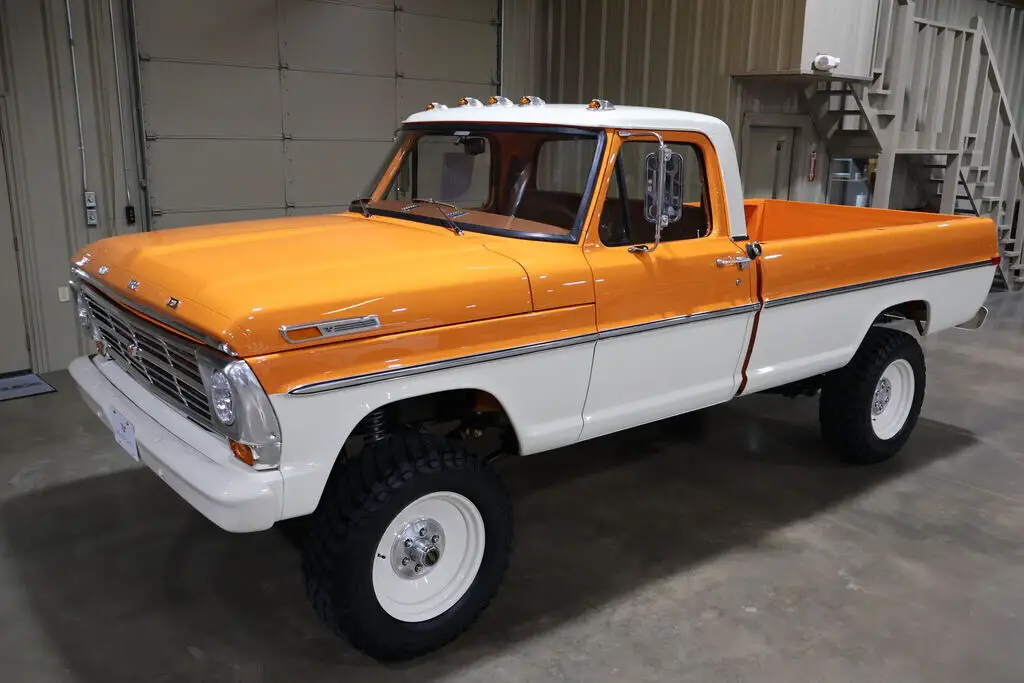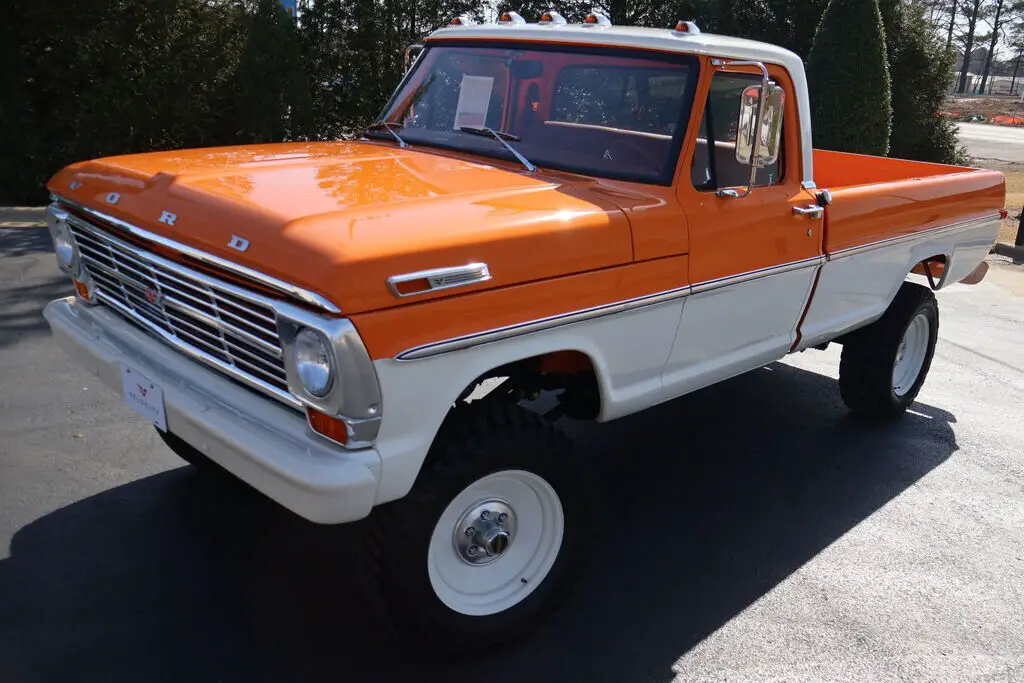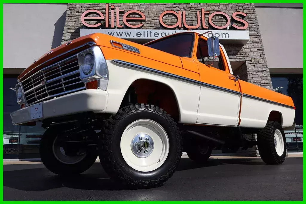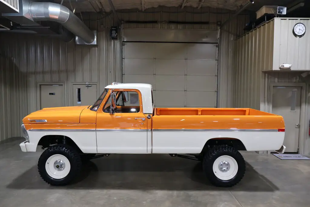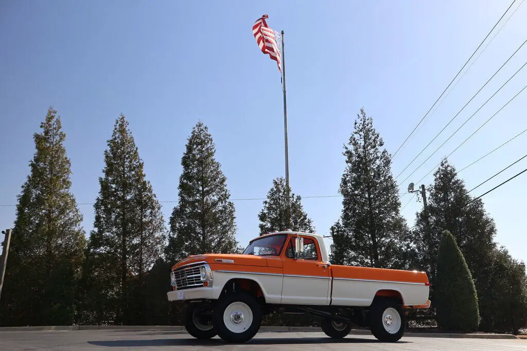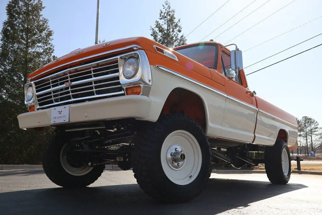 1972 Ford F250Exterior: Orange Creamsicle + Wimbledon WhiteInterior: Woven Cognac with Fondotinta LeatherEngine: Gen III Ford 5.0 Coyote Crate EngineTransmission: 10 Speed AutomaticStandard Equipment & Features:Exterior: - BASF Glasurit Paint- Chrome Accessories- LED Headlights- New Glass and Weather Seals- 18" Alloy Wheels- 33' BFGoodrich Tires- Power Steps- Raptor-Lined Undercarriage and Bedliner- Chrome BumpersInterior:- Velocity Signature Interior with Custom Bench Seat- Vintage Air A/C System - Dakota Digital Gauges- BT Stereo- Classic Wood Steering Wheel- Power Windows- Focal Sound System- Ididit Tilt Steering ColumnChassis:- New VR Chassis- New Dana 44 Front Axie with Warn- Locking Hubs- New Dana 60 Rear Axle- Fox Coilovers- 4-Wheel Wilwood Disc Brakes- Front & Rear Sway Bars- Velocity Fuel TankDrivetrain:- Gen Ill Ford 5.0 Coyote Crate Engine- 10-Speed Automatic Transmission- Velocity Serpentine System- Velocity Performance ExhaustWarranty:- Two-Year Limited WarrantyINSTALLED UPGRADES:Heritage Series Upgrade- Two-Tone Custom Paint (Exterior, Roof, Interior Dash)- Sparc Leather Wrapped Steering Wheel- Velocity Exterior Billet Accessories- Chrome Belt Line Trim (Cab, Tailgate, Grill Trim)- Color Matched Bumpers- Classic Steel Wheel (Powdercoated / Painted to match)- 33" Toyo Open Country Tires- Color Matched Painted Engine Bay- Color Matched Raptor Lined Bed- Wet Sand and Polish- Back Up Camera- Apple CarplayWoven Italian Leather UpgradeCall OR Text 8709318004 to inquire.