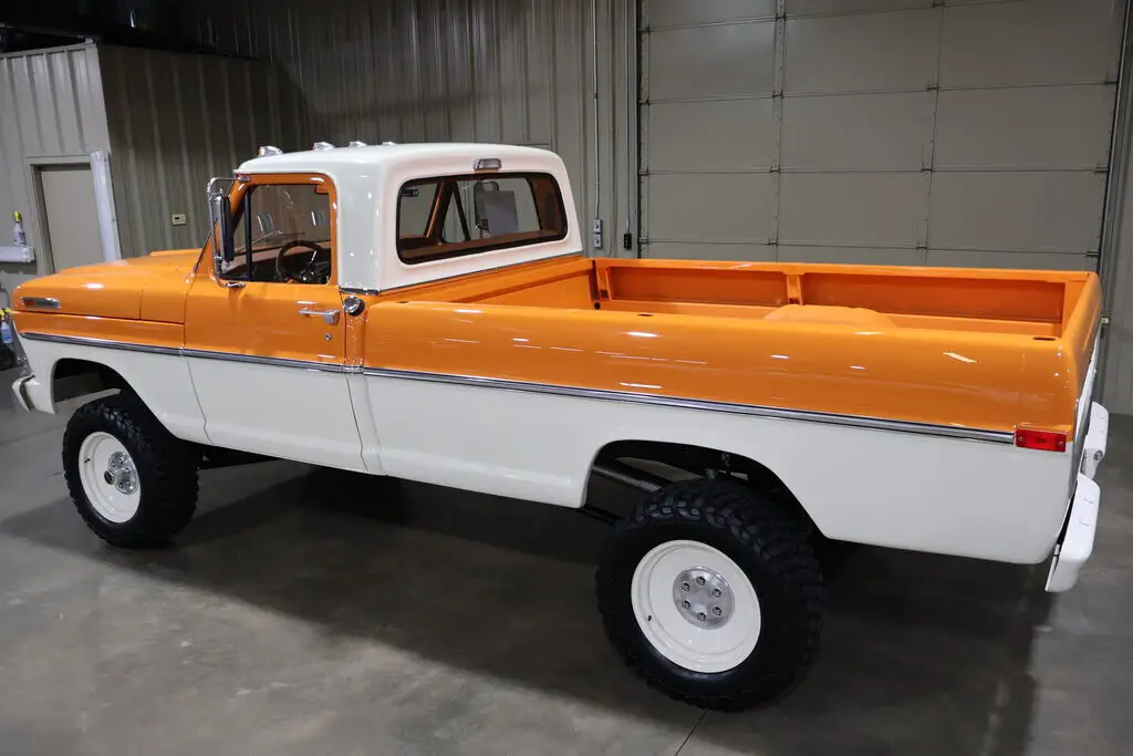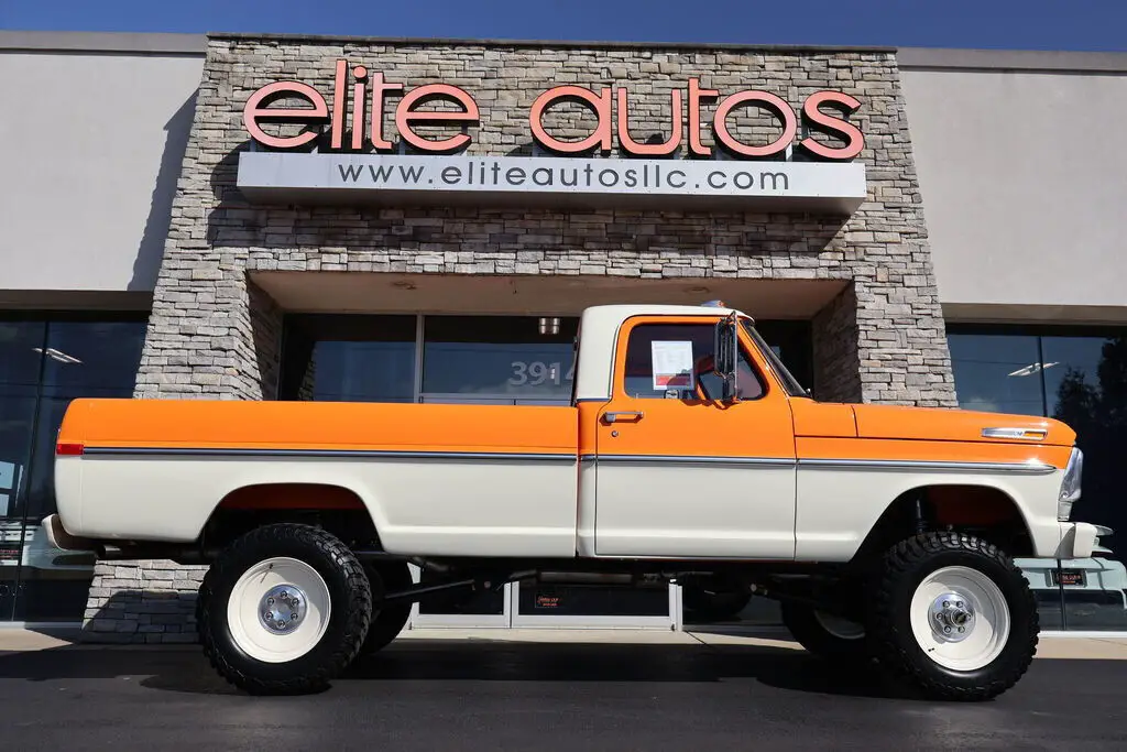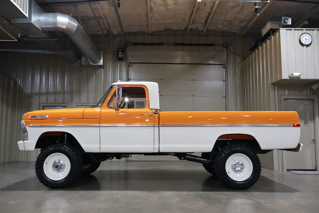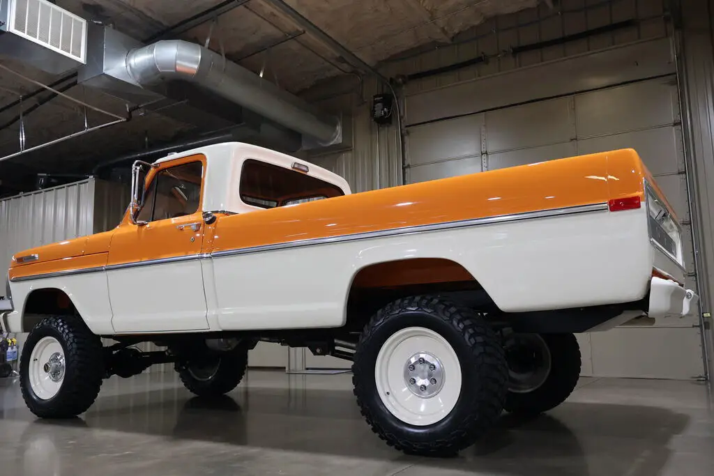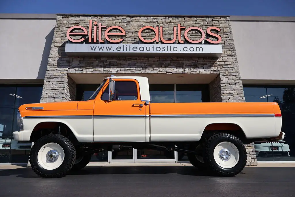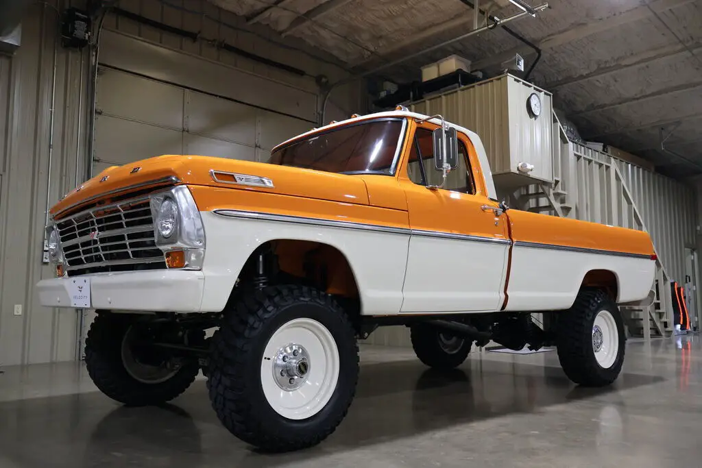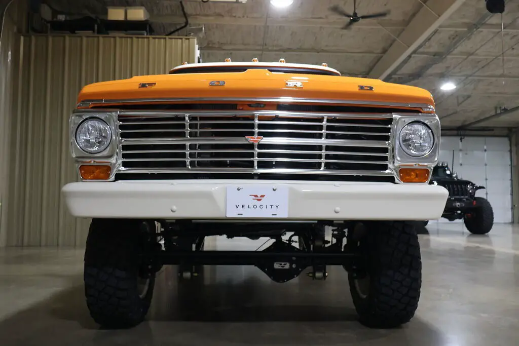 1972 Ford F250 Exterior: Orange Creamsicle + Wimbledon White Interior: Woven Cognac with Fondotinta Leather Engine: Gen III Ford 5.0 Coyote Crate Engine Transmission: 10 Speed Automatic Standard Equipment & Features: Exterior: - BASF Glasurit Paint - Chrome Accessories - LED Headlights - New Glass and Weather Seals - 18" Alloy Wheels - 33' BFGoodrich Tires - Power Steps - Raptor-Lined Undercarriage and Bedliner - Chrome Bumpers Interior: - Velocity Signature Interior with Custom Bench Seat - Vintage Air A/C System - Dakota Digital Gauges - BT Stereo