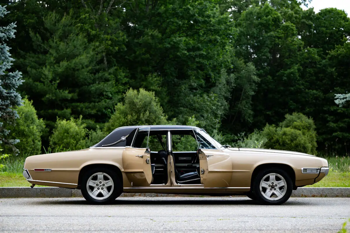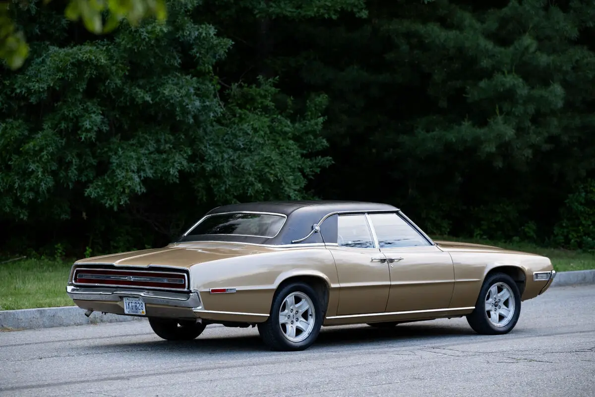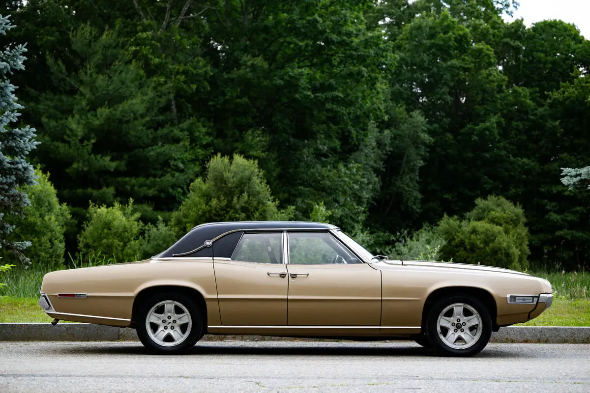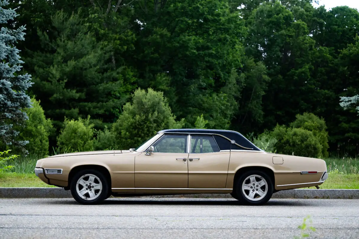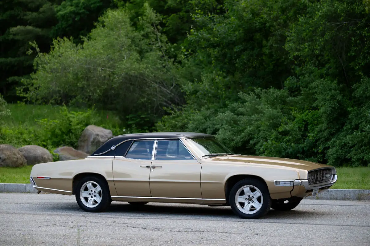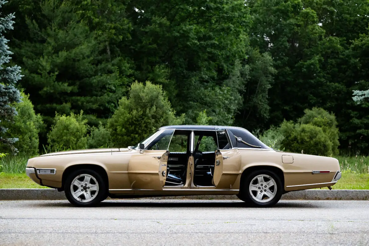 This 1968 Ford Thunderbird Landau sedan spent time in Ohio before it was acquired me in December 2023. Subsequent work included overboring and rebuilding the 429ci “Thunder Jet” V8 with a re-ground crankshaft, .030″-oversized pistons, .010″-oversized main bearings and rod bearings, and a replacement camshaft, oil pump, timing chain, timing gears, valves, lifters and springs, and gaskets in addition to re-coring the radiator, repainting various external engine components, and installing LED light bulbs, replacement rear sequential turn signal hardware, and Crown Victoria-sourced 17″ wheels. Finished in gold over black vinyl, the car features hideaway headlights, reverse-hinged rear coach doors, front disc brakes, a JVC CD stereo, and aftermarket speakers. This Thunderbird sedan is offered with manufacturer’s literature, spare parts, and a clean Rhode Island title in my name.The car left the factory finished in Gold Metallic (Y). Exterior details include a driver-side mirror, hideaway headlights, sequential rear turn signals, reverse-hinged rear coach doors, a black “Alligator-Grain” vinyl roof with landau bars, and chrome-finished bumpers. The passenger-side headlight shaft seal was replaced in preparation for the sale, and additional work under current ownership includes installing a replacement electronic sequential turn signal relay and an aftermarket electronic turn signal sequencer kit as well as fitting the taillight assembly, front turn signals, and corner lamps with LED bulbs. Silver-finished 17″ wheels that were reportedly sourced from a later-model Crown Victoria are mounted with 235/55 Cooper Zeon RS3-G1 tires. Stopping power is provided by power-assisted front disc brakes and rear drum brakes. A wheel alignment was performed in preparation for the sale.The seating surfaces are upholstered in black vinyl. A crack is visible in the dashboard, which houses a JVC CD stereo with Bluetooth connectivity. Kenwood speakers were fitted to the rear deck, while the dashboard speaker was replaced with a RetroSound dual-voice component. The headlight switch, heater core, and heater valve were reportedly changed in preparation for the sale. A manual shut off valve for the heater core has been installed. Not shown is the start of a modern AC retrofit. This car was a factory Non AC Car. The following has been fitted to the engine, original AC Compressor mounts,water pump pulley and Idler Pulley, new York AC Compressor, rebuilt AC Clutch pulley, new parallel flow condenser, new AC Dryer, new Lines and switch. New Fan Clutch and 6 Blade Fan. No further AC work will be done. The only things left for the new buyer if they wished would be fitting any aftermarket evaporator unit from makers like vintage air, restomod air or classic auto air. The two-spoke steering wheel frames a 120-mph speedometer, an analog clock, and supplementary readouts. The five-digit mechanical odometer shows 51k miles, approximately 250 of which were added under current ownership. LED backlight bulbs were fitted to the dashboard in preparation for the sale.