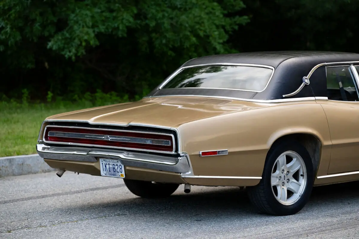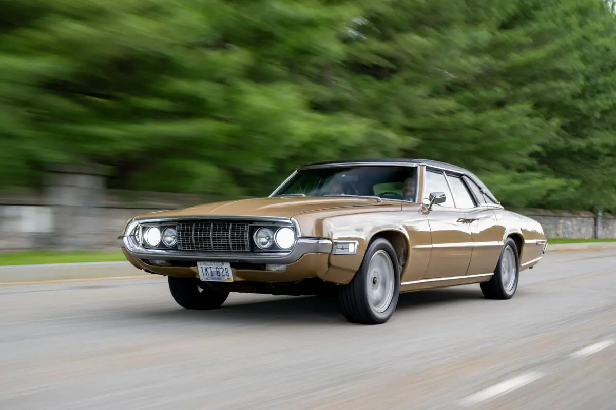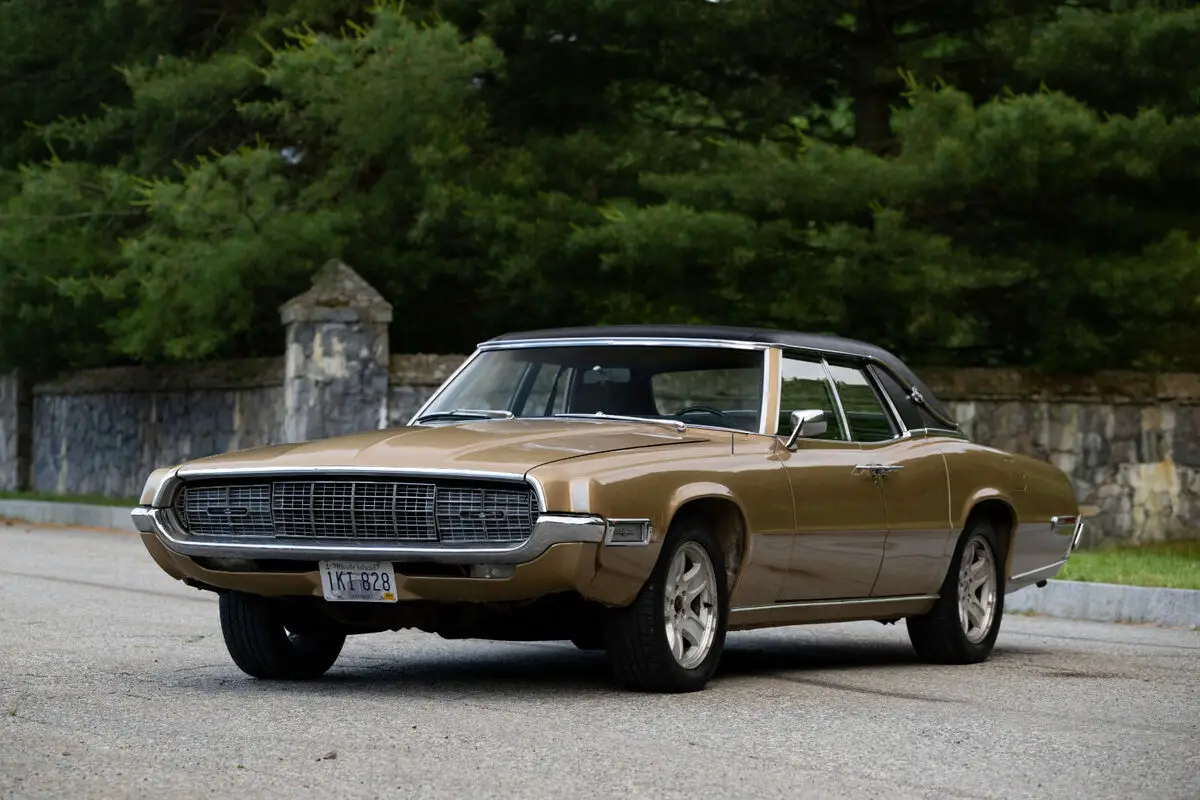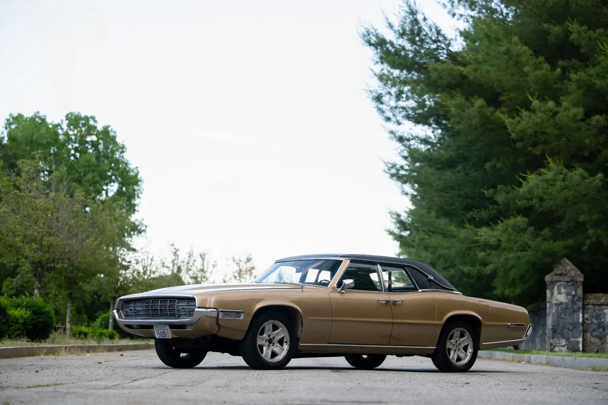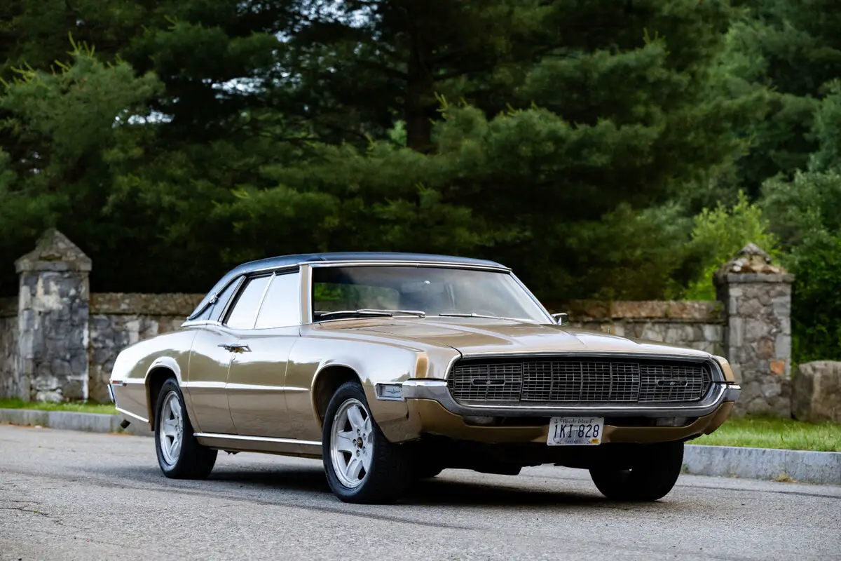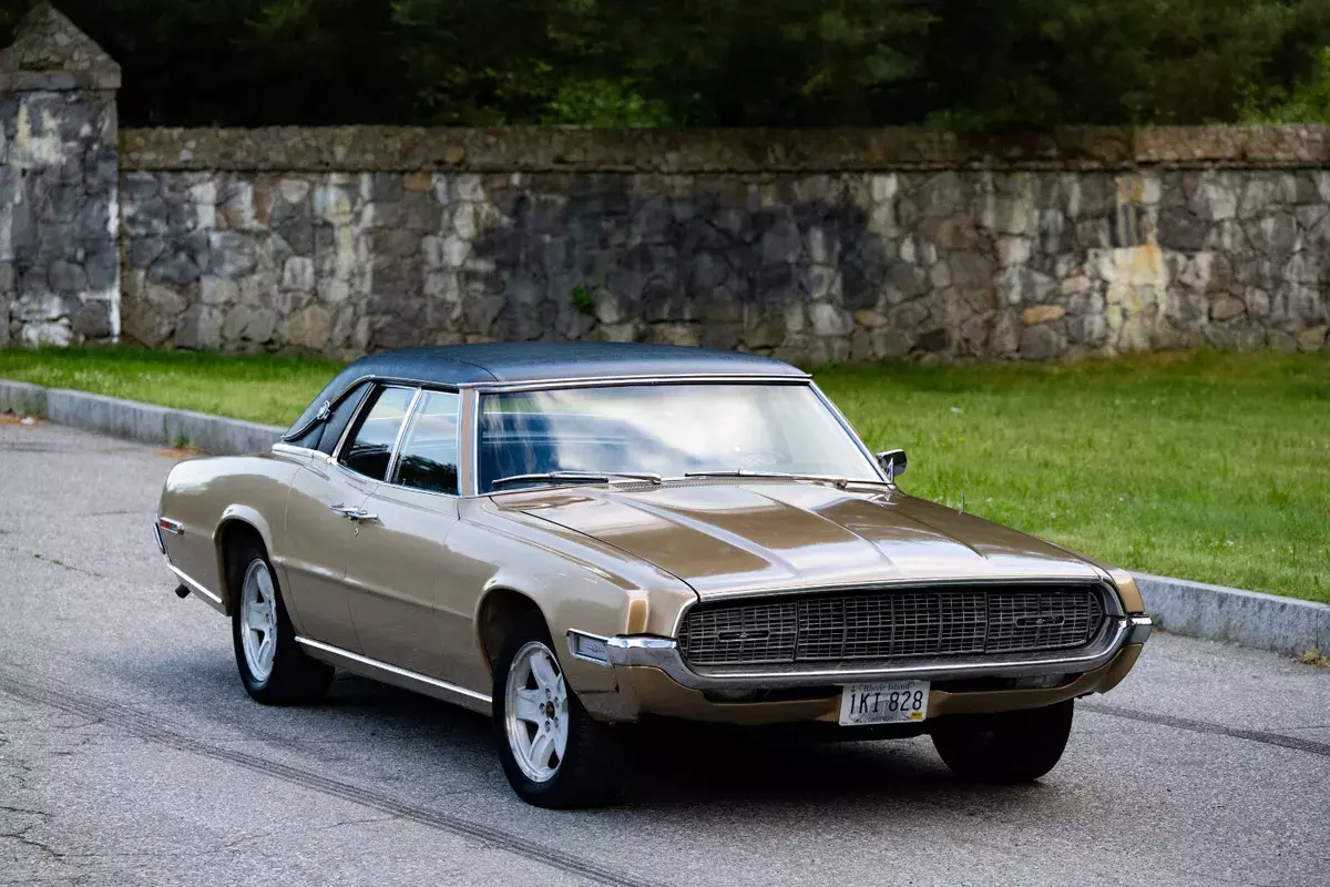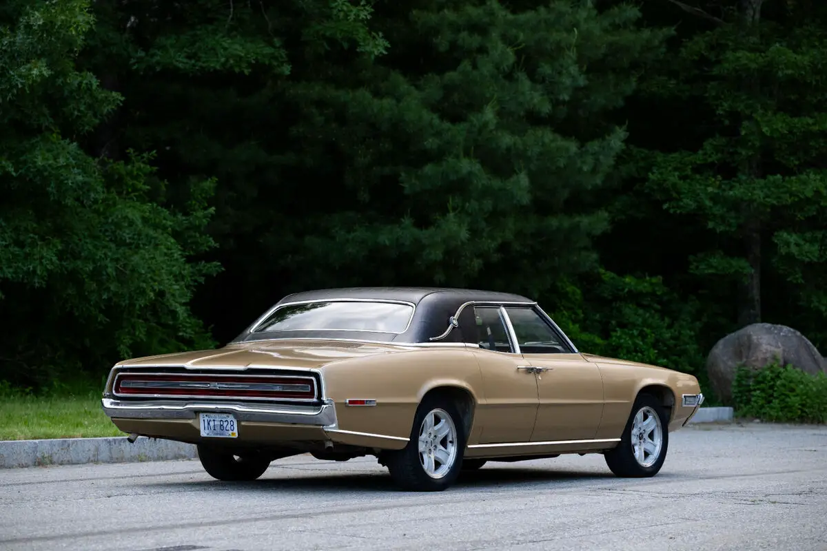 This 1968 Ford Thunderbird Landau sedan spent time in Ohio before it was acquired me in December 2023. Subsequent work included overboring and rebuilding the 429ci “Thunder Jet” V8 with a re-ground crankshaft, .030″-oversized pistons, .010″-oversized main bearings and rod bearings, and a replacement camshaft, oil pump, timing chain, timing gears, valves, lifters and springs, and gaskets in addition to re-coring the radiator, repainting various external engine components, and installing LED light bulbs, replacement rear sequential turn signal hardware, and Crown Victoria-sourced 17″ wheels. Finished in gold over black vinyl, the car features hideaway headlights, reverse-hinged rear coach doors, front disc brakes, a JVC CD stereo, and aftermarket speakers. This Thunderbird sedan is offered with manufacturer’s literature, spare parts, and a clean Rhode Island title in my name.The car left the factory finished in Gold Metallic (Y). Exterior details include a driver-side mirror, hideaway headlights, sequential rear turn signals, reverse-hinged rear coach doors, a black “Alligator-Grain” vinyl roof with landau bars, and chrome-finished bumpers. The passenger-side headlight shaft seal was replaced in preparation for the sale, and additional work under current ownership includes installing a replacement electronic sequential turn signal relay and an aftermarket electronic turn signal sequencer kit as well as fitting the taillight assembly, front turn signals, and corner lamps with LED bulbs. Silver-finished 17″ wheels that were reportedly sourced from a later-model Crown Victoria are mounted with 235/55 Cooper Zeon RS3-G1 tires. Stopping power is provided by power-assisted front disc brakes and rear drum brakes. A wheel alignment was performed in preparation for the sale.The seating surfaces are upholstered in black vinyl. A crack is visible in the dashboard, which houses a JVC CD stereo with Bluetooth connectivity. Kenwood speakers were fitted to the rear deck, while the dashboard speaker was replaced with a RetroSound dual-voice component. The headlight switch, heater core, and heater valve were reportedly changed in preparation for the sale. A manual shut off valve for the heater core has been installed. Not shown is the start of a modern AC retrofit. This car was a factory Non AC Car. The following has been fitted to the engine, original AC Compressor mounts,water pump pulley and Idler Pulley, new York AC Compressor, rebuilt AC Clutch pulley, new parallel flow condenser, new AC Dryer, new Lines and switch. New Fan Clutch and 6 Blade Fan. No further AC work will be done. The only things left for the new buyer if they wished would be fitting any aftermarket evaporator unit from makers like vintage air, restomod air or classic auto air. The two-spoke steering wheel frames a 120-mph speedometer, an analog clock, and supplementary readouts. The five-digit mechanical odometer shows 51k miles, approximately 250 of which were added under current ownership. LED backlight bulbs were fitted to the dashboard in preparation for the sale.