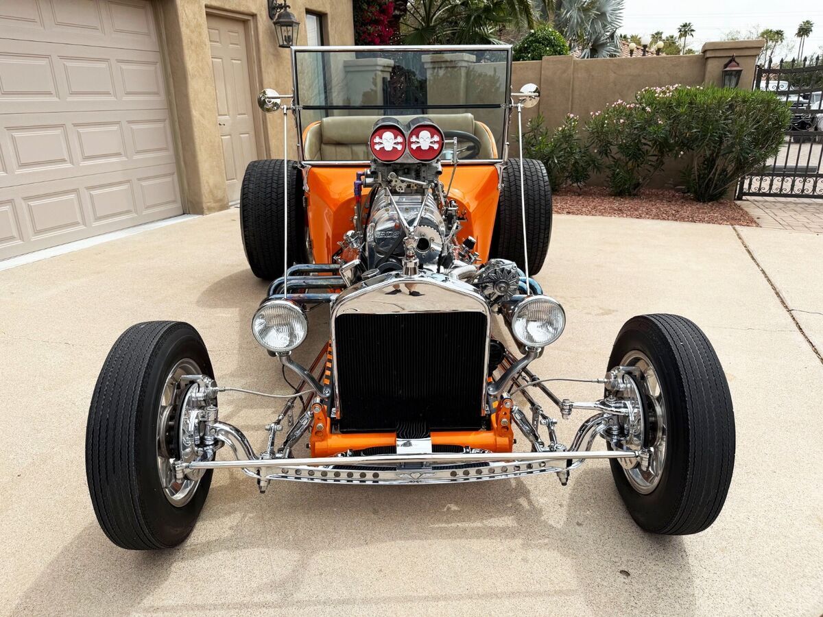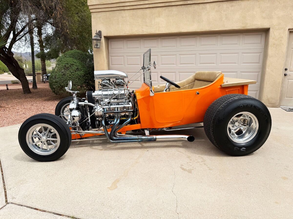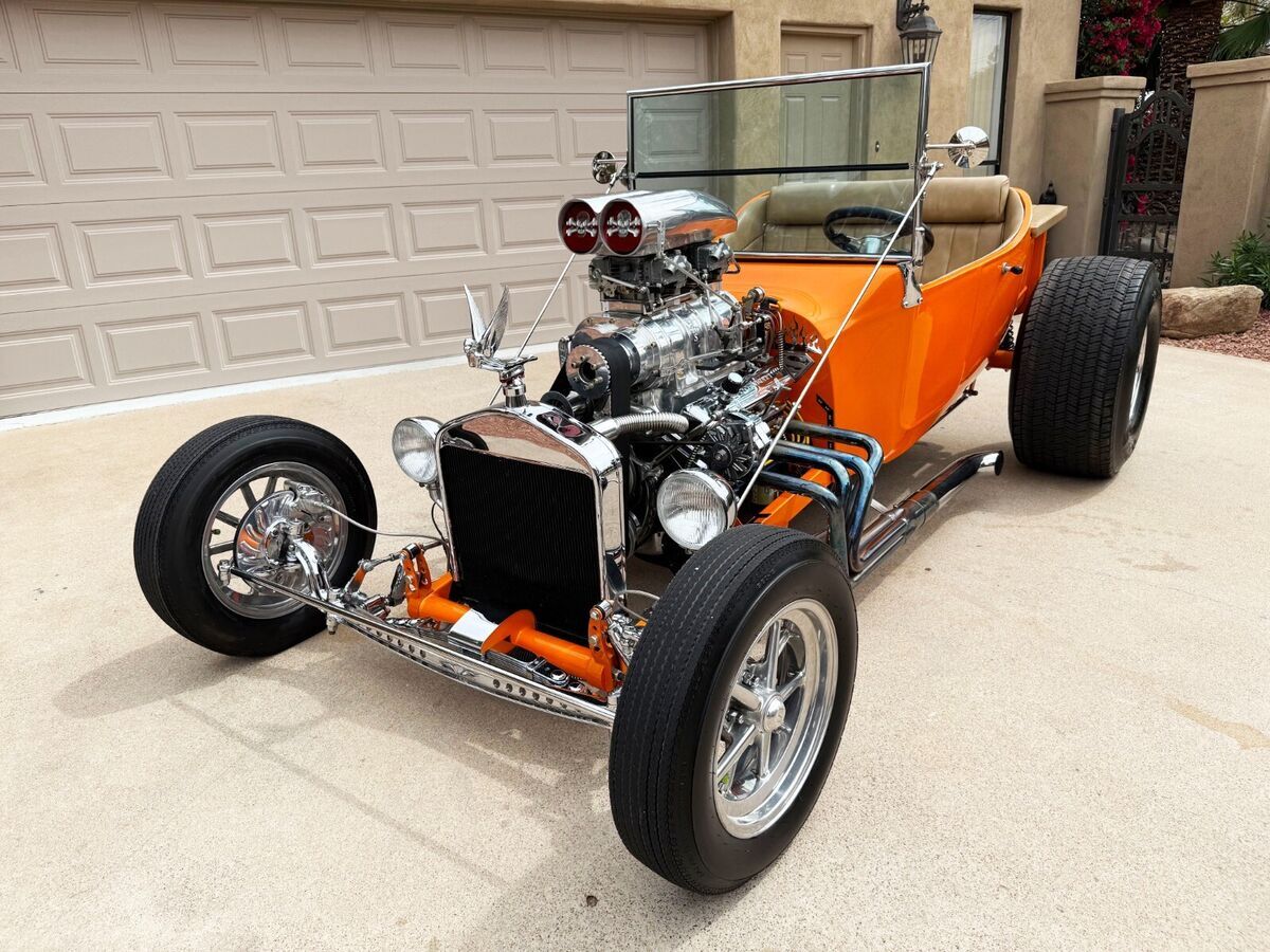 Highlights:ASVE 1927 T-Bucket modern build (circa 2013)Metallic orange paint with matching painted custom frameBlown 350 V8 with 671 BDS blower & dual Holley carbsTurbo 350 automatic transmissionOnly 1,000 miles since buildFour-wheel disc brakesBillet aluminum wheels with Pro Touring rear tiresLight-up rear skull, skull butterflies & custom decorDual chrome side pipes sounds incredibleDynamatted interior for sound/heatFun, fast, and ready to impress!