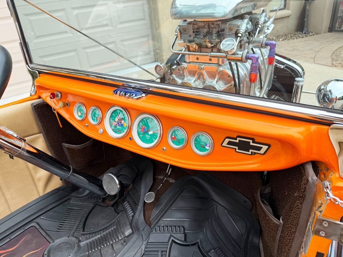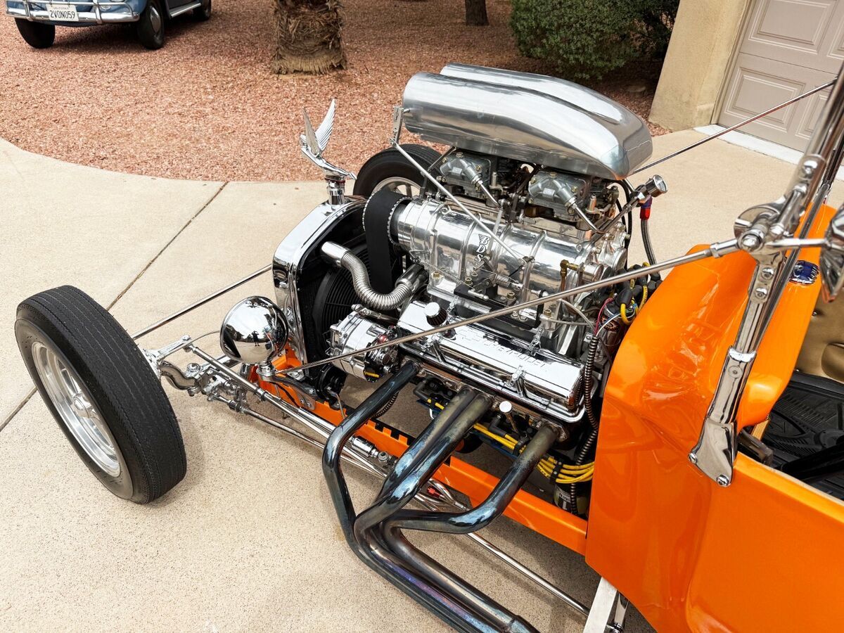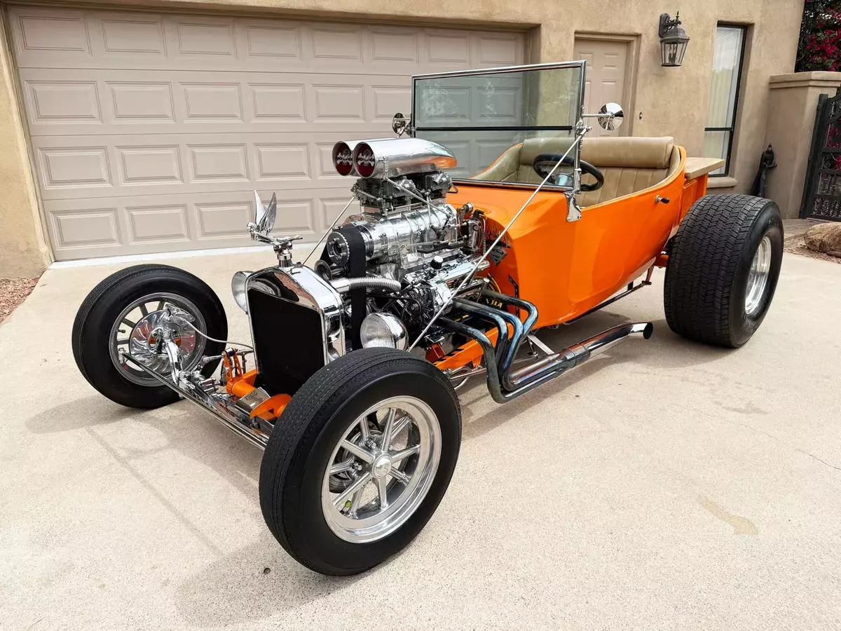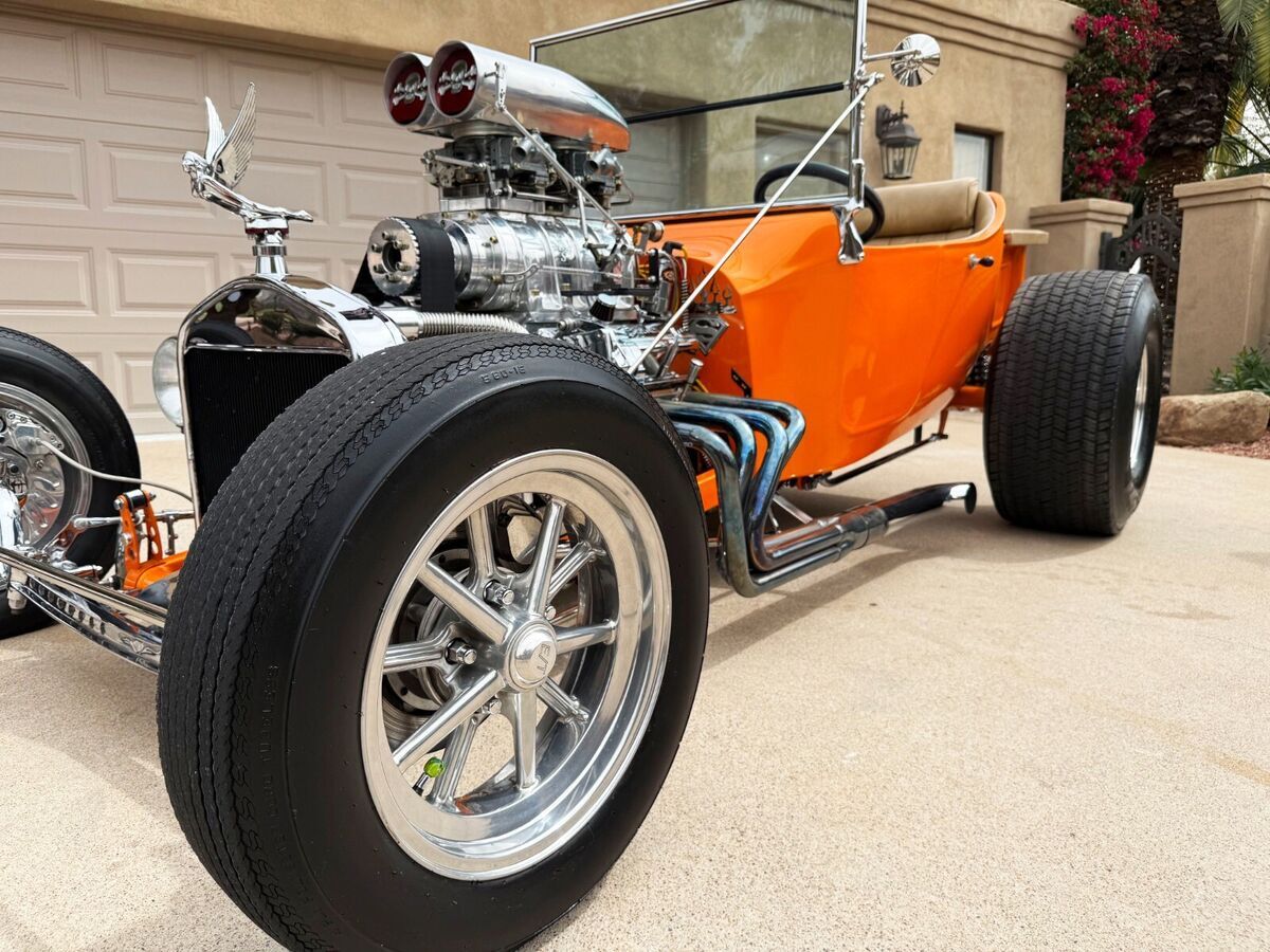 Highlights:ASVE 1927 T-Bucket modern build (circa 2013)Metallic orange paint with matching painted custom frameBlown 350 V8 with 671 BDS blower & dual Holley carbsTurbo 350 automatic transmissionOnly 1,000 miles since buildFour-wheel disc brakesBillet aluminum wheels with Pro Touring rear tiresLight-up rear skull, skull butterflies & custom decorDual chrome side pipes sounds incredibleDynamatted interior for sound/heatFun, fast, and ready to impress!