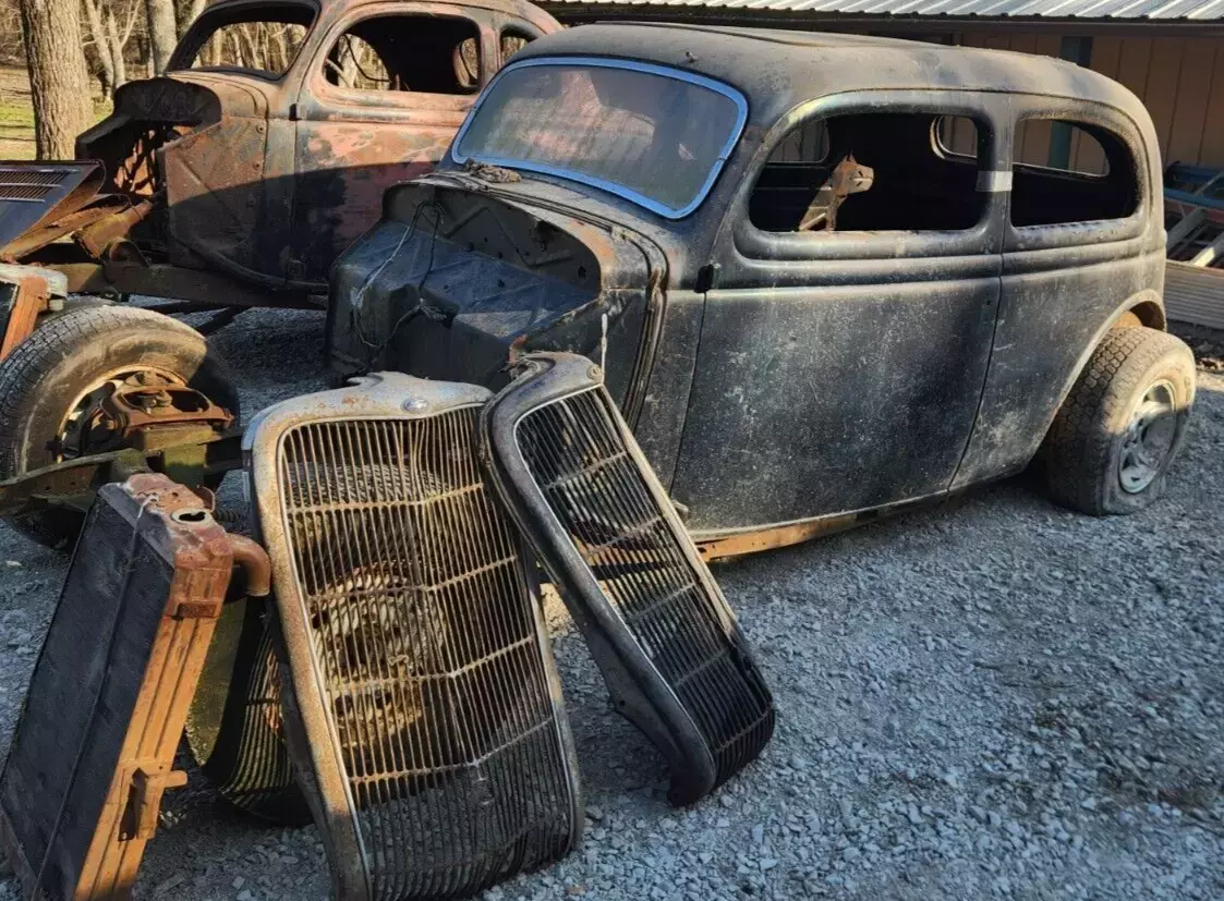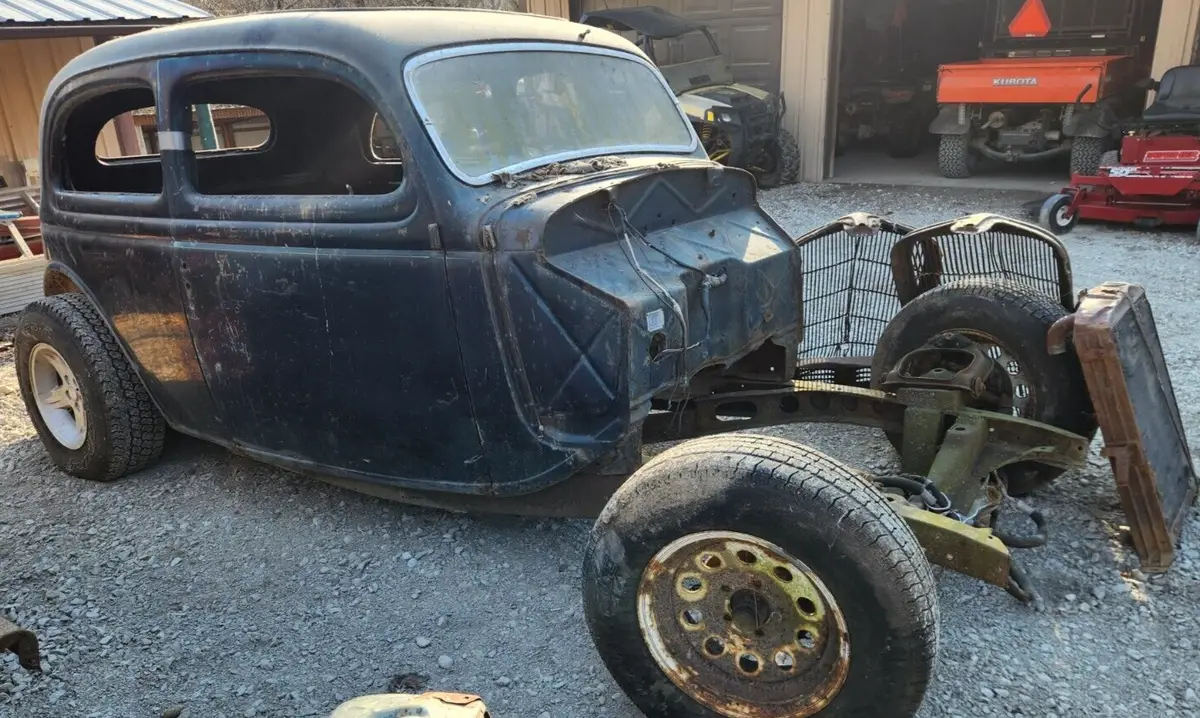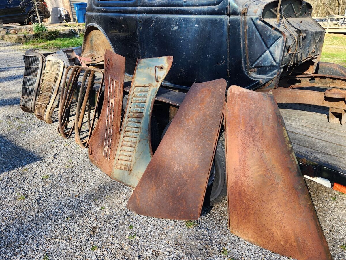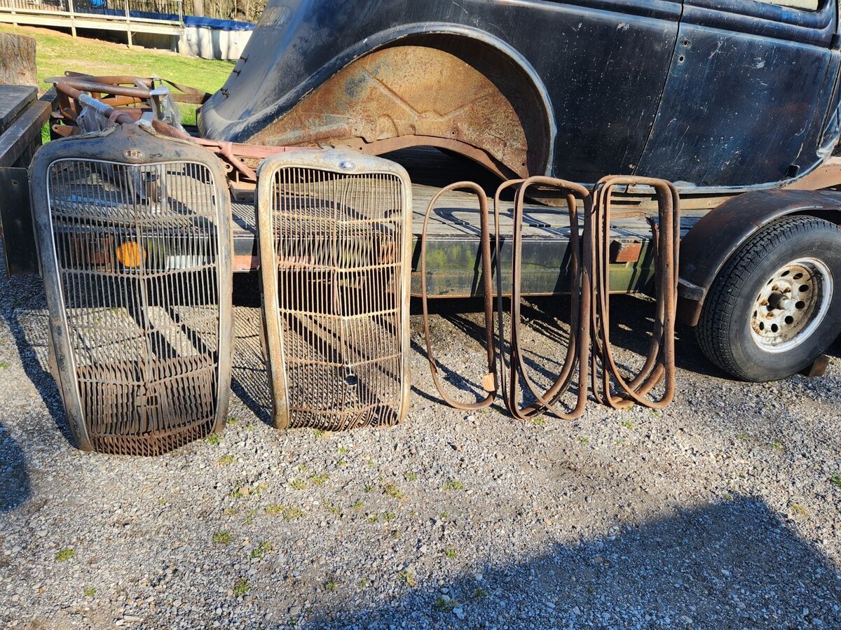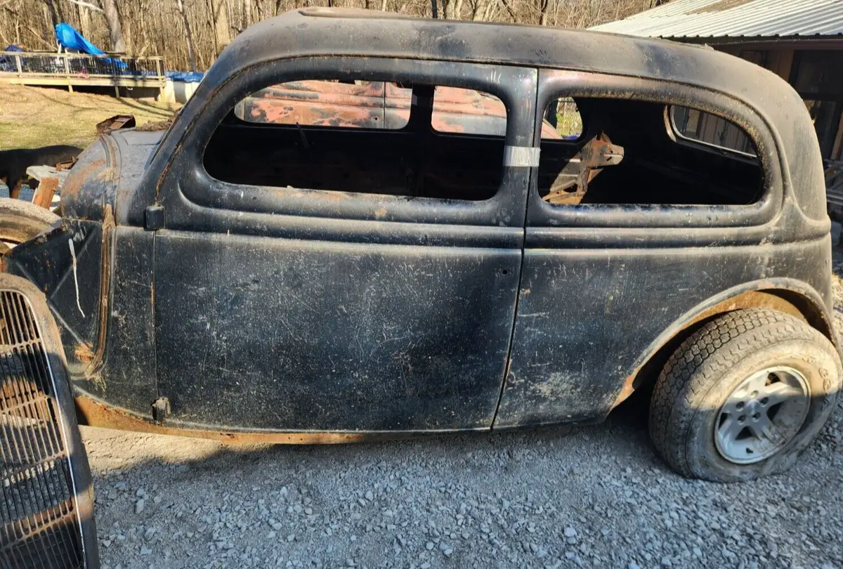 1935 Ford Slantback 2 Dr Sedan. Pretty solid body. Comes with two grilles and hood. No fenders available. Filled vinyl roof panel. Set up for Mustang II front suspension and sitting on 9" rear axle (not bolted in place). Clear title.Sold as is no warranties implied. $500 down upon end of auction and full payment due when picked up. Can assist with loading vehicle.