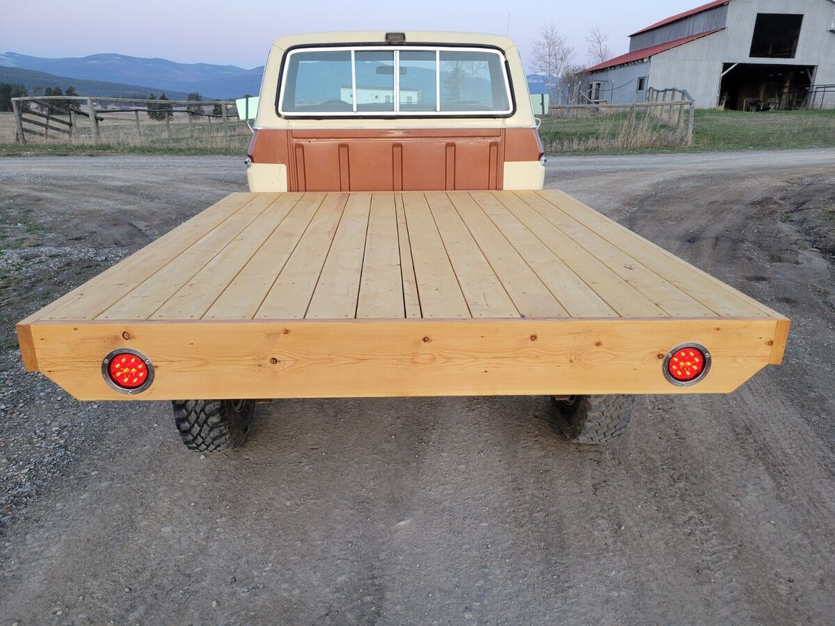 The body is very clean, solid and straight. The paint looks original. The paint matches the paint codes on the tag. There is no rust-thru on the truck. There was a little rust that I had repaired. A new metal floor panel was properly butt-welded in on the drivers side. The floor, floor supports, cab mounts, cab corners, rockers, etc etc have no rust. Hood and doors operate as they should. I believe the windshield has a crack. New front bumper. New grille and headlight bezels. New flatbed. The flatbed is 7' wide and 8'3" long. The cab guard should have a lower section of metal. I had not got around to installing that yet. I can possibly do that for you if you'd like. It can be done with flat metal, wood, or expanded metal. All lights work, except the reverse lights. I had no added them to the flatbed, but I possibly can.