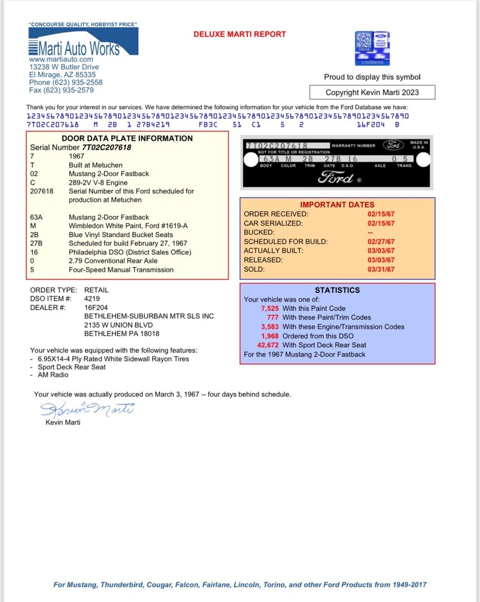 1967 Mustang fastback. I am the second owner of this factory 4 speed. All matching numbers on the engine and transmission and the rest of the drivetrain. Original interior. Only thing not original is the paint job. The original is Wimbledon white. Driver and passenger floor plans replaced. Have receipts, photos, documents. C-code, original California black plates. The original style tachometer and center console alone are valuable. Carb is dialed in with Air Fuel Mixture gauge.