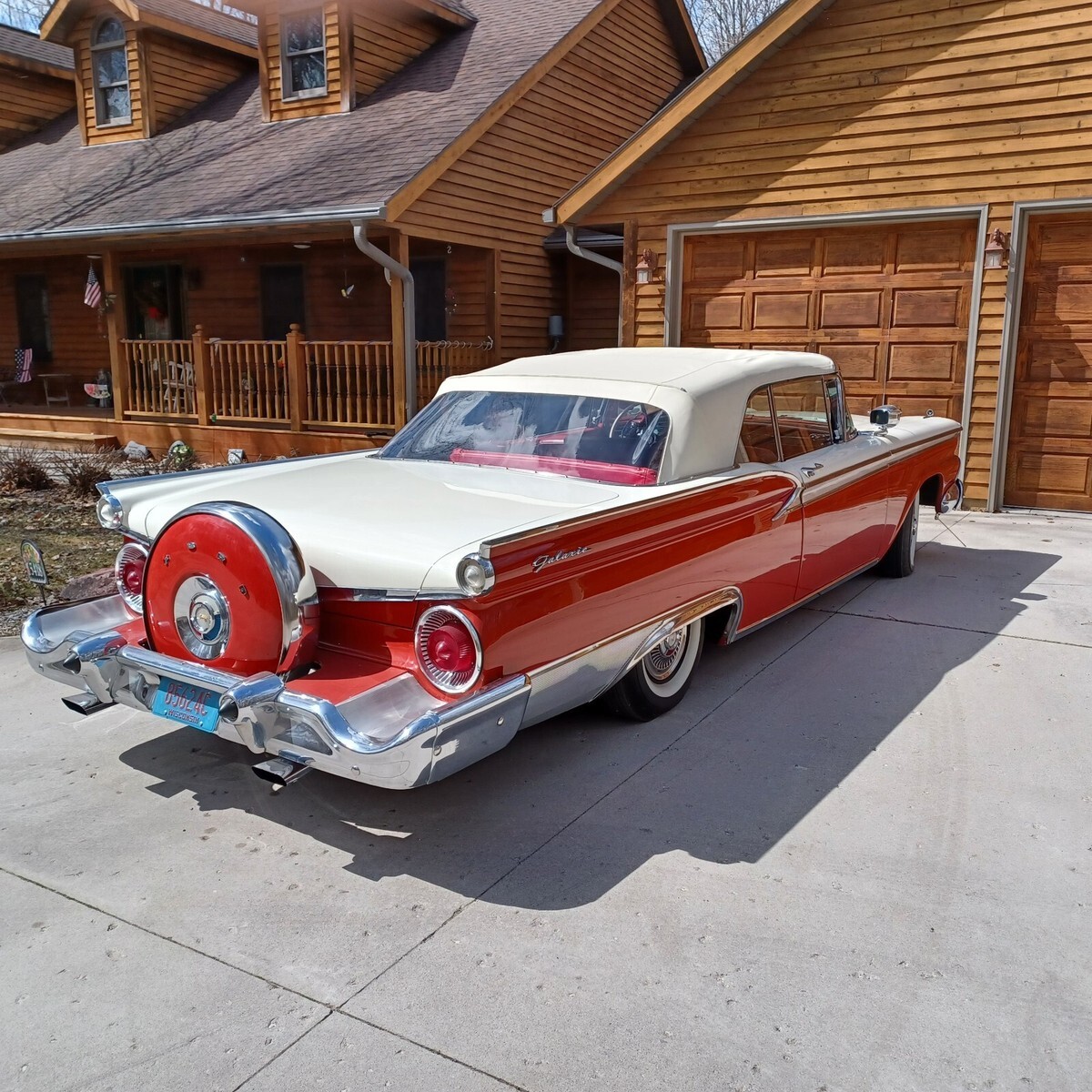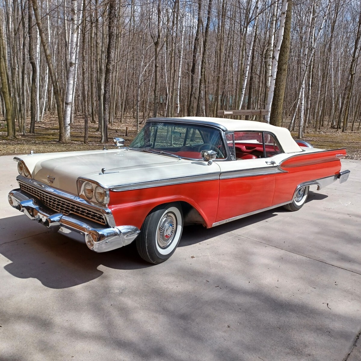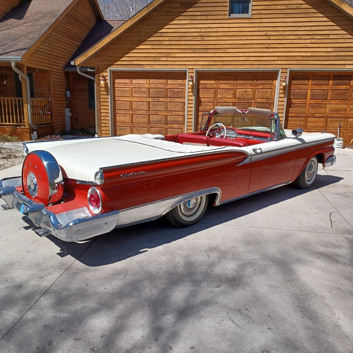 Experience the epitome of classic American automotive beauty with the 1959 Ford Galaxie, a symbol of a bygone era. This Galaxie model boasts a timeless red and white exterior and a red, white and black interior that is in excellent condition, that commands attention and evokes nostalgia. The convertible body type offers an open-top driving experience, perfect for sunny days on the road or leisurely cruising through the streets. Inside, the car comfortably seats four, allowing for an intimate drive. Under the hood lies a smooth-running 332 Thunder Bird Special Engine with a 3 speed automatic transmission. It has power steering and power brakes. It has factory added power windows, dual fender spot lights, continental kit, Front and rear bumper guards, SS fender skirts that will be in the trunk. Last year a new top and top seals was installed, new windshield and seal,new door and trunk seals.new window wiskers,new carpet,new seat belts,new mirror bracket,new rubber bumpers,doors, glove box, gas tank lid and hood. The odometer was also replaced, it was broken. It was replaced with a NOS one I found an ebay. I kept the old one so you can see the original millage. This Ford Galaxie is a rare find for collectors and enthusiasts alike so take a look at all the pictures and you judge this beauty. It comes with a clean vehicle title, ensuring a worry-free ownership.