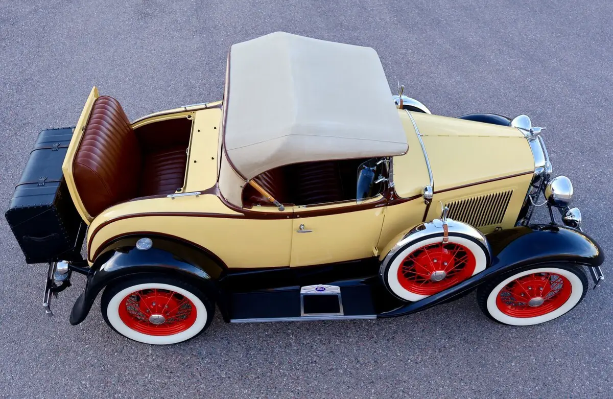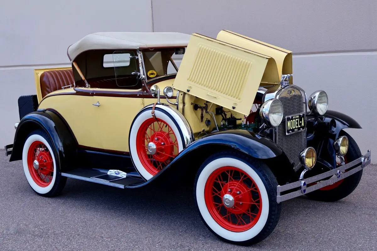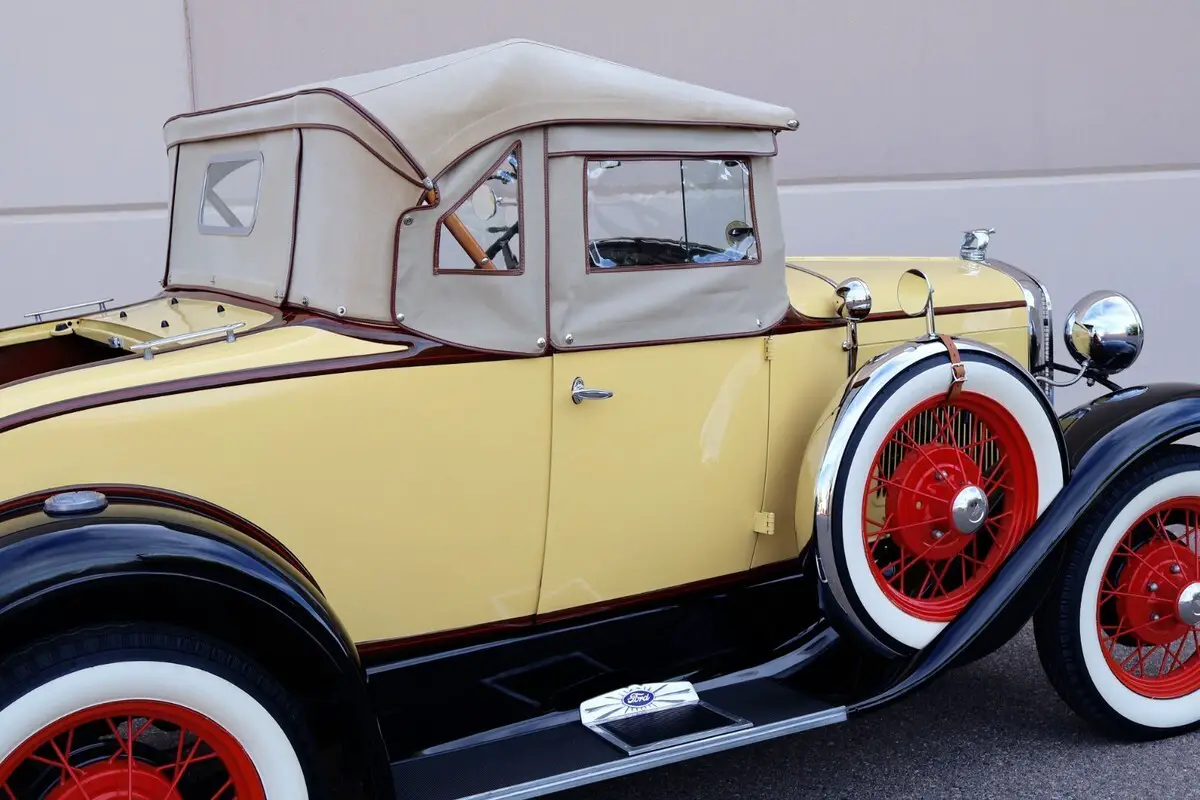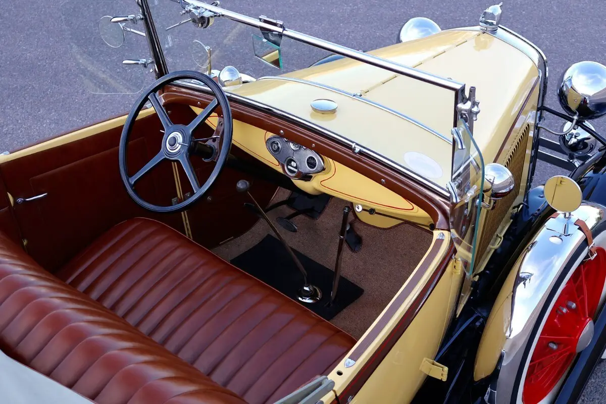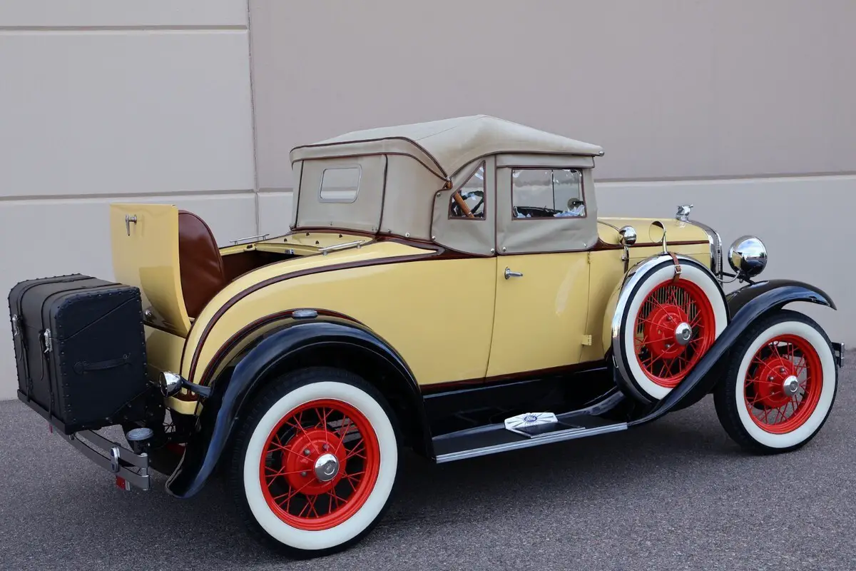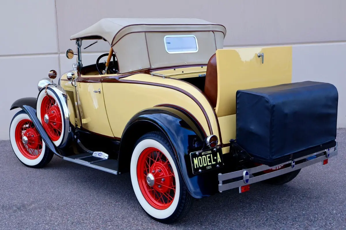 Up for sale we have the most sought after 1931 Model A Ford Roadster - Deluxe with Dual Spare, LeBaron - Bonney interior in like new condition, Super clean engine compartment and beautiful 4 tone color combination - Vintage Pale Yellow / Black Fenders / Brown Body Trim with Red Striping and Red Wire Wheels including 6 very good gangster style white wall tires + rare and hard to find chrome cover rings for the spare tires with leather strap side mirrors... that alone gives the car an expensive prewar look. This Model A features side curtains for those rainy days and a convertible top boot when the top is down, also a black vinyl dust cover over the rear leather trunk chest, Antique enamel Ford Logo running board step plates - driver and passenger side, cowl lamps and Flying Quail Radiator Cap / Hood Ornament, chrome grill stone guard, Oogah horn, windshield wind deflectors and chrome brackets, driver side wiper and a lot more to be mentioned .... options that makes this antique Ford a complete Model A . Nice folding windshield that will let extra air in the cockpit - this was actually the AC system back in the day, this rare roadster also features a rare cockpit leg heat system !!! Brand new 6V battery, vintage fog lights not connected, car runs and drives excellent, good brakes, manual transmission shifts very well, engine fires up every time within the first key !!! Clean title in hand, car is ready for parades and classic car shows, if you're looking for something like this please act now, once sold, will be hard to find another Model A Deluxe as nice as this one, previous owner was a Ford Model A Club member and he took the best care of his weekend toy.... restoring a Top of the Line '31 Ford Roadster as this one will exceed 100K these days .... thousands of hours of labor not included ! Please check the pictures in the listing, they'll talk for this highly collectible '31 Ford Roadster, you can see this special Vintage Pale Yellow in the sun but also in the shade, excellent color combination !