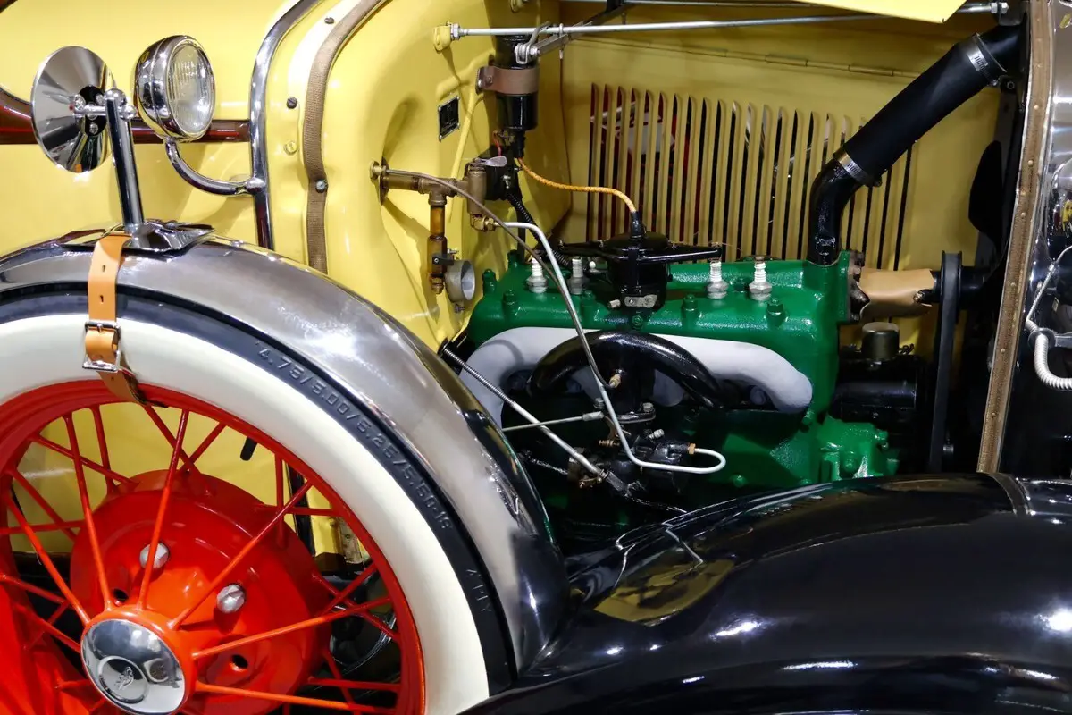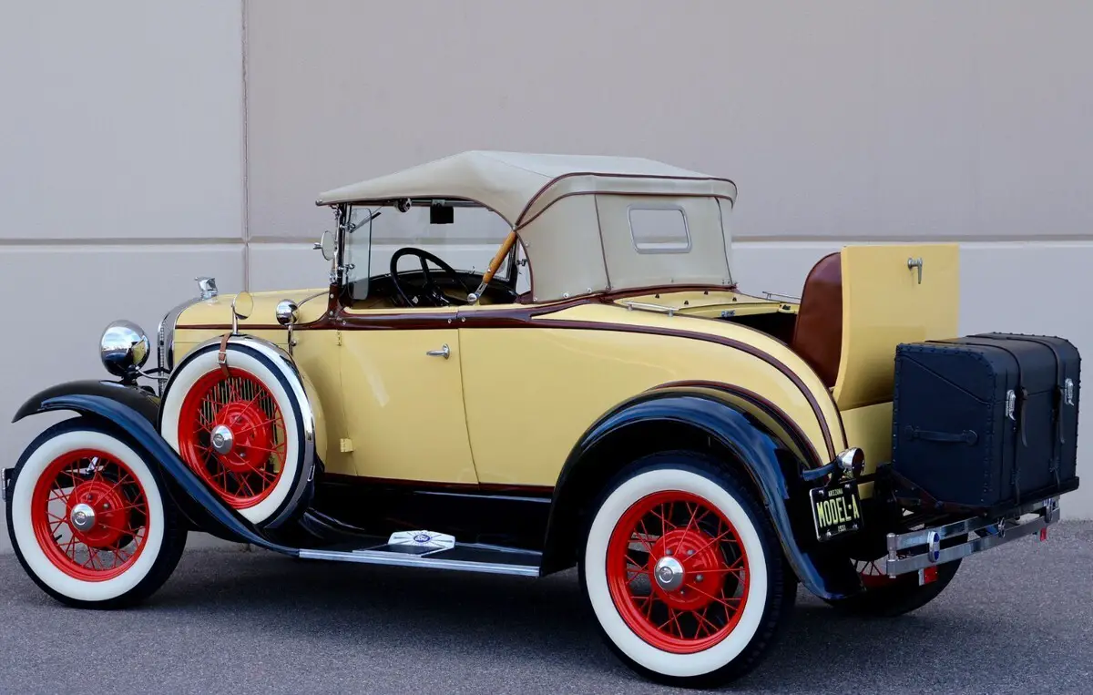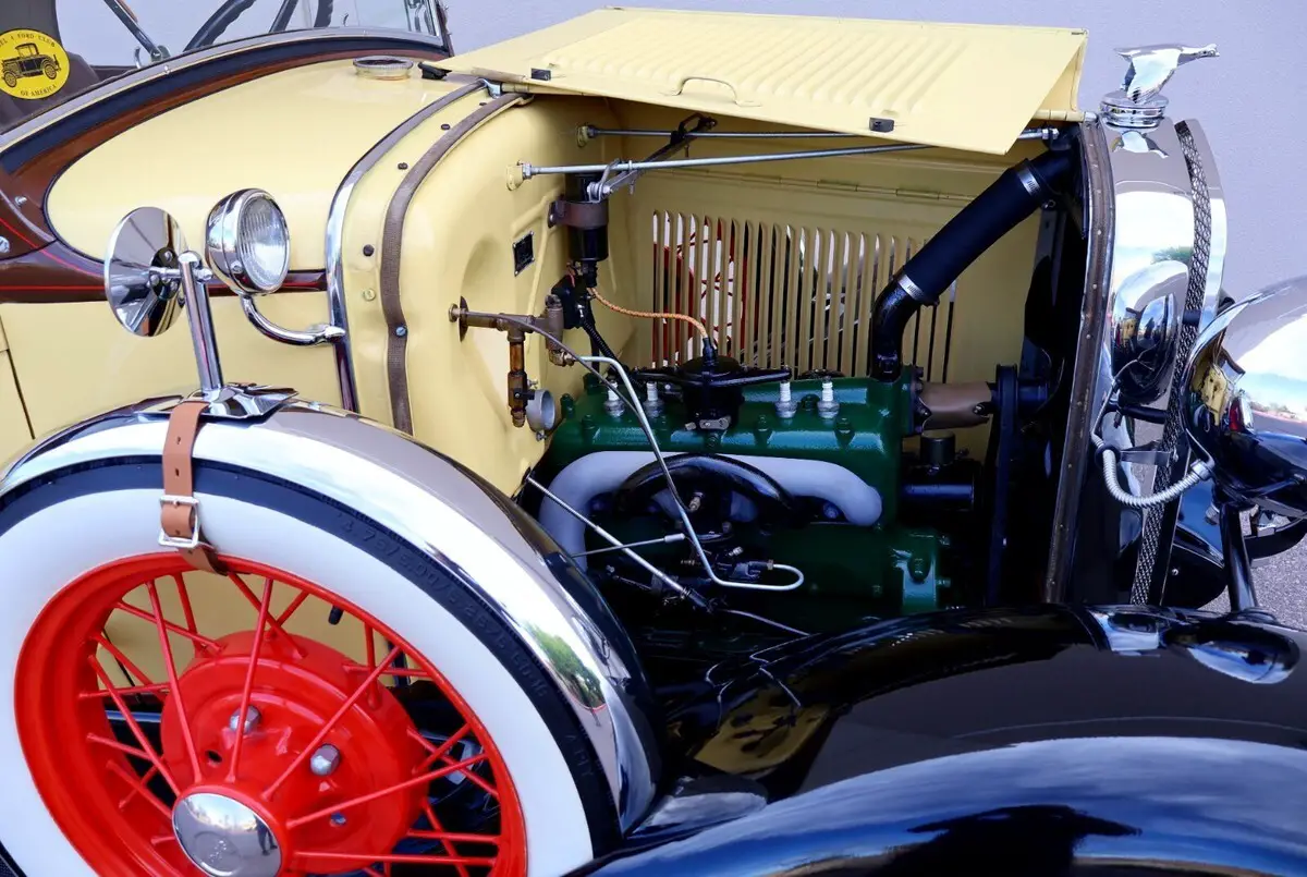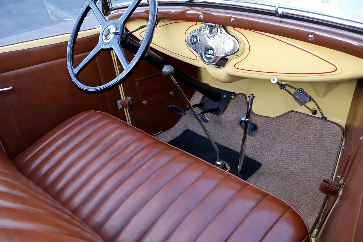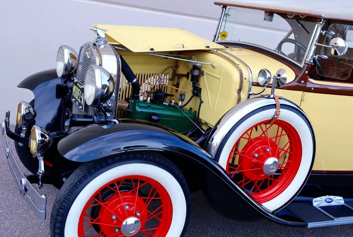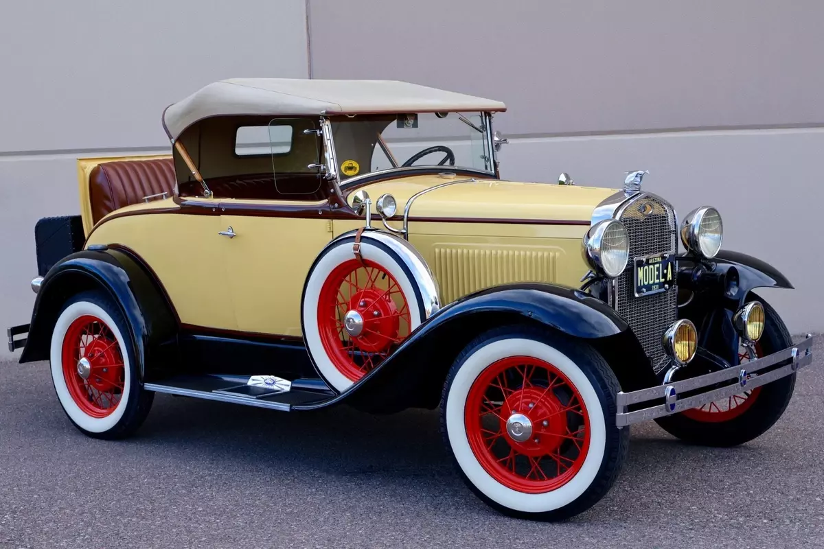 Up for sale we have the most sought after 1931 Model A Ford Roadster - Deluxe with Dual Spare, LeBaron - Bonney interior in like new condition, Super clean engine compartment and beautiful 4 tone color combination - Vintage Pale Yellow / Black Fenders / Brown Body Trim with Red Striping and Red Wire Wheels including 6 very good gangster style white wall tires + rare and hard to find chrome cover rings for the spare tires with leather strap side mirrors... that alone gives the car an expensive prewar look. This Model A features side curtains for those rainy days and a convertible top boot when the top is down, also a black vinyl dust cover over the rear leather trunk chest, Antique enamel Ford Logo running board step plates - driver and passenger side, cowl lamps and Flying Quail Radiator Cap / Hood Ornament, chrome grill stone guard, Oogah horn, windshield wind deflectors and chrome brackets, driver side wiper and a lot more to be mentioned .... options that makes this antique Ford a complete Model A . Nice folding windshield that will let extra air in the cockpit - this was actually the AC system back in the day, this rare roadster also features a rare cockpit leg heat system !!! Brand new 6V battery, vintage fog lights not connected, car runs and drives excellent, good brakes, manual transmission shifts very well, engine fires up every time within the first key !!! Clean title in hand, car is ready for parades and classic car shows, if you're looking for something like this please act now, once sold, will be hard to find another Model A Deluxe as nice as this one, previous owner was a Ford Model A Club member and he took the best care of his weekend toy.... restoring a Top of the Line '31 Ford Roadster as this one will exceed 100K these days .... thousands of hours of labor not included ! Please check the pictures in the listing, they'll talk for this highly collectible '31 Ford Roadster, you can see this special Vintage Pale Yellow in the sun but also in the shade, excellent color combination !
