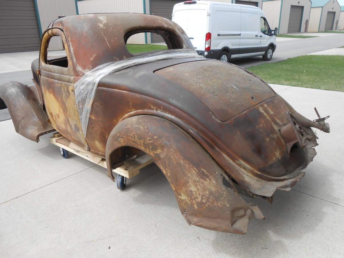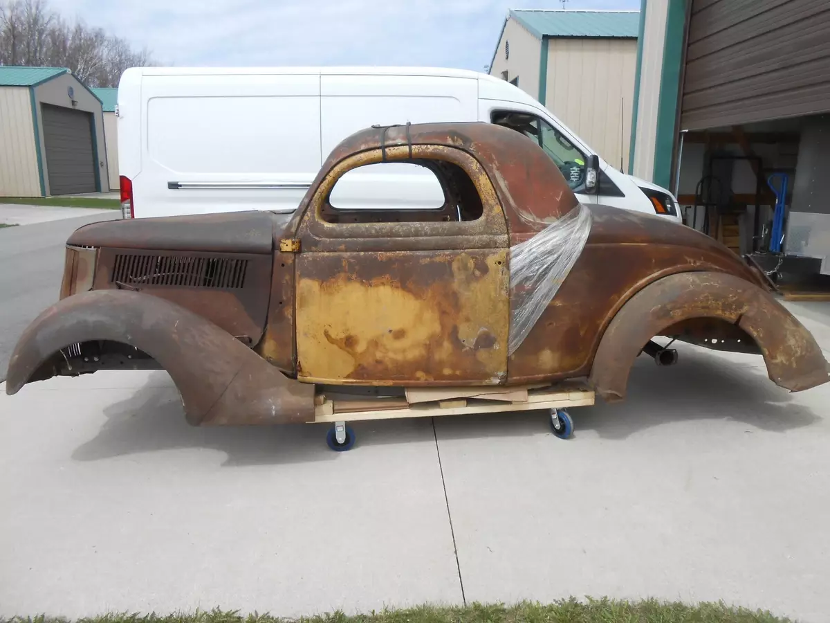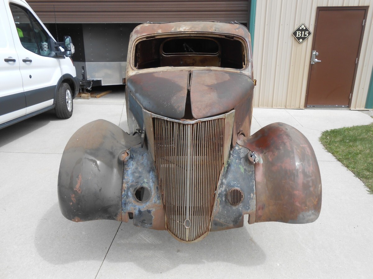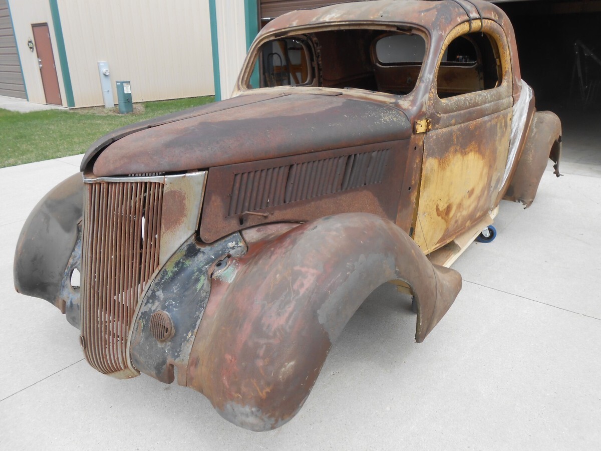 1936 Ford Three Window Steel CoupeIt has front fendersIt has rear fendersIt has a hoodIt has a grillIt has front fender bracesIt includes three front roof sections that can be used to fabricate as neededIt has a header panel above the front windshieldIt has a deck lidThis car is in need of a complete rebuildIt needs a complete floorIt needs all the usual cowl and quarter patchesIt will need a rear tail pan sectionThe B Pillar on the passenger side is rotted away and there is anew donor section from a 2 door sedan that would need to be fabricated in