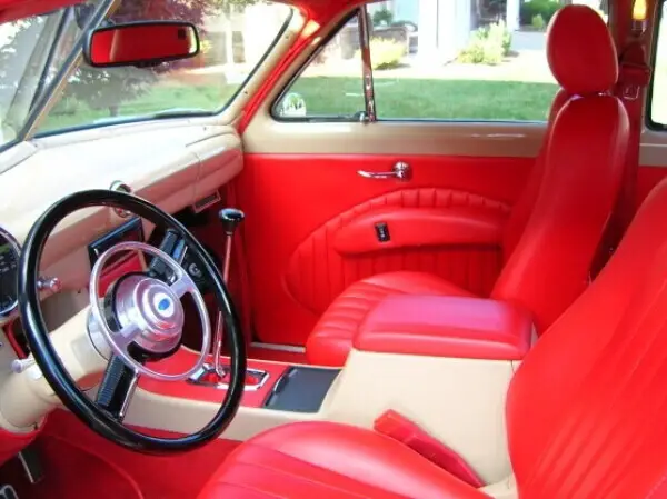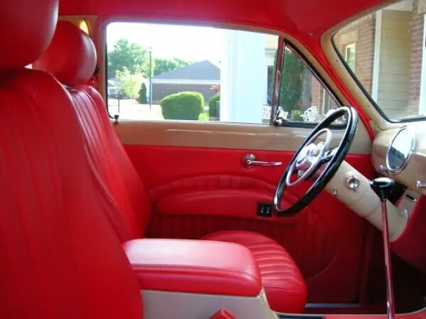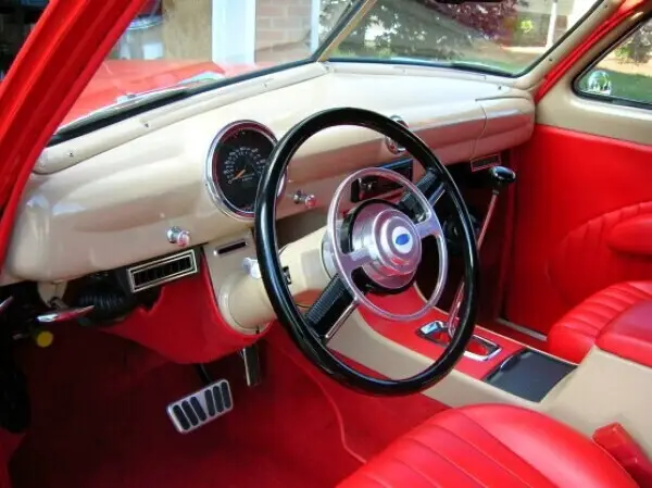 Finished in brilliant PPG “Ford Performance Red,” the car features frenched headlights and taillights, shaved hood and deck for a sleek look, and Hagen “Fatty” side mirrors. Rolling on new Diamond Back P205/75R15 narrow whitewall tires and period-correct smoothie hubcaps (the “Full Moons” we ran in 1950s SoCal), it has all the right vintage touches with modern flair. LED lighting all around improves visibility while retaining a classic look.