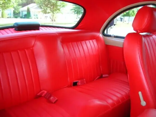 Step inside to find a custom red leatherette tuck and roll interior with matching headliner and carpet. Bucket seats with a center console and cup holders provide modern comfort; the driver’s seat is powered, and the passenger seat slides forward for rear access. Other features include a Le Carra steering wheel, GM tilt column, electric windows and locks, and a Dakota Digital rearview mirror with auto-dim, temperature, and directional display. Haneline gauges, Classic Auto Air heat and A/C, and a Kenwood CD/stereo system with four Sony speakers round out a very livable, enjoyable interior.