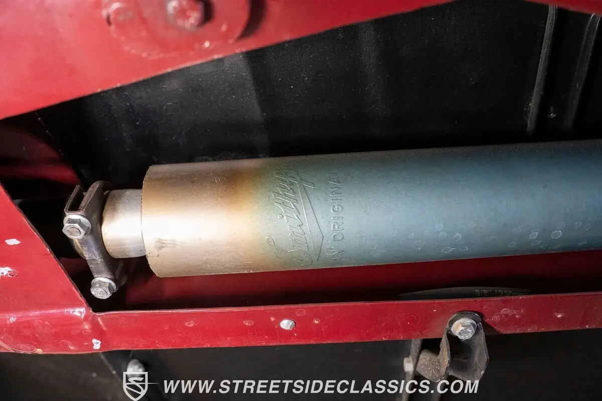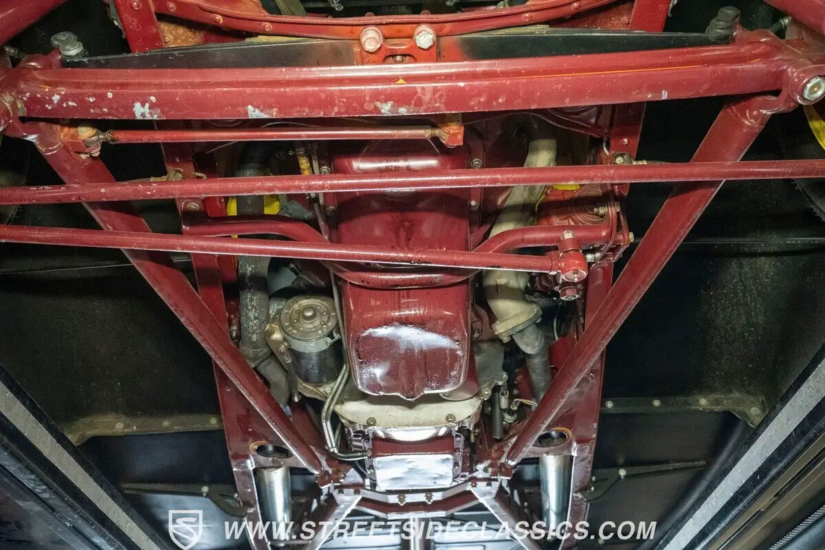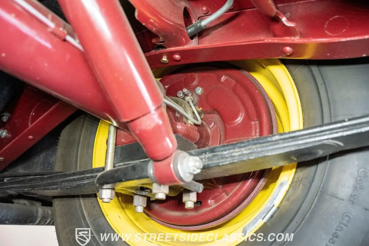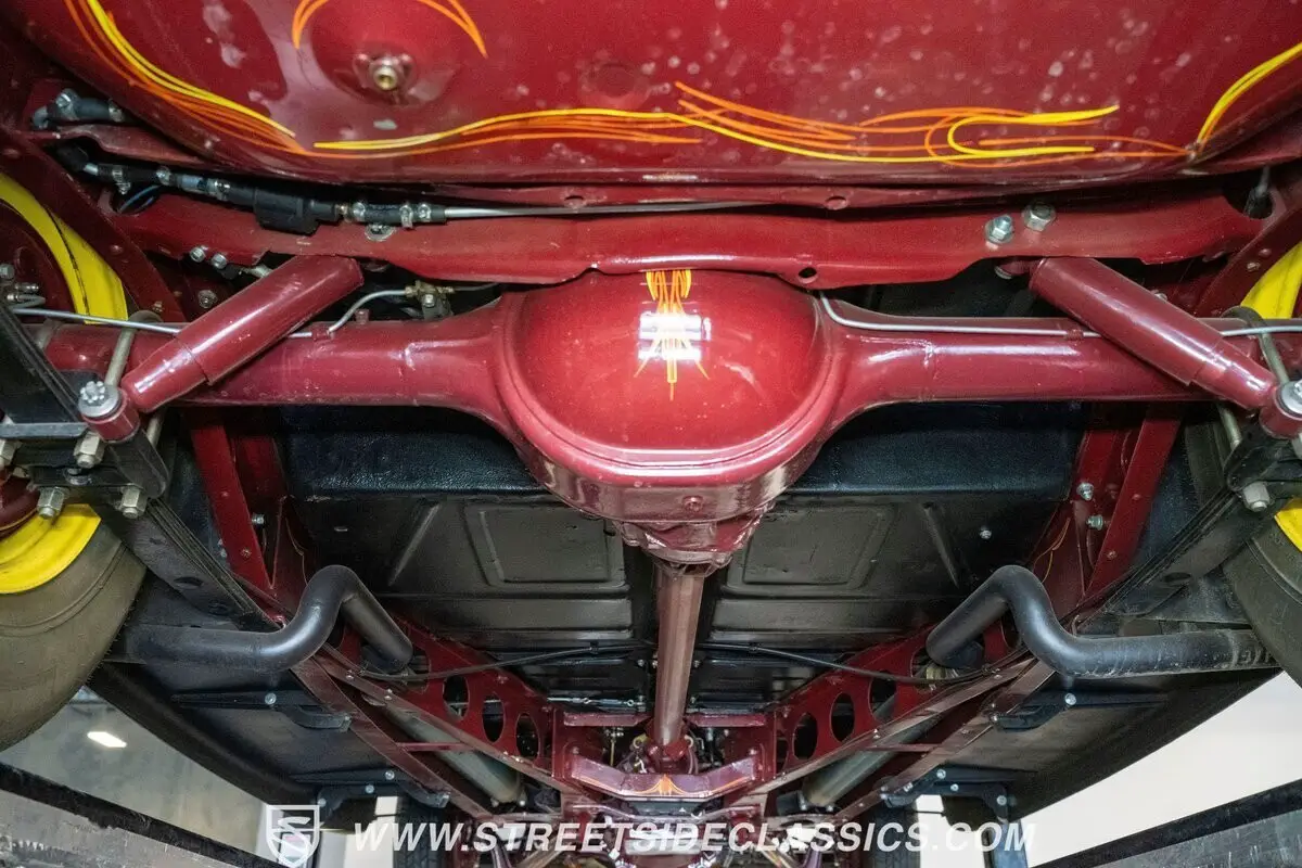 The Flathead V8 engine features aluminum Offenhauser heads and an Edelbrock intake manifold with a tri-power Ford carburetor setup. Fenton cast headers with Smithy's mufflers deliver a classic exhaust note through the dual exhaust system. A Vertex distributor manages spark delivery, while a large shrouded electric fan keeps things cool. The C4 3-speed automatic transmission delivers power to the 9-inch rear end. The front suspension uses an I-beam with mono leaf and shocks, while the rear utilizes a solid axle with leaf springs, creating a smooth-riding cruiser.
