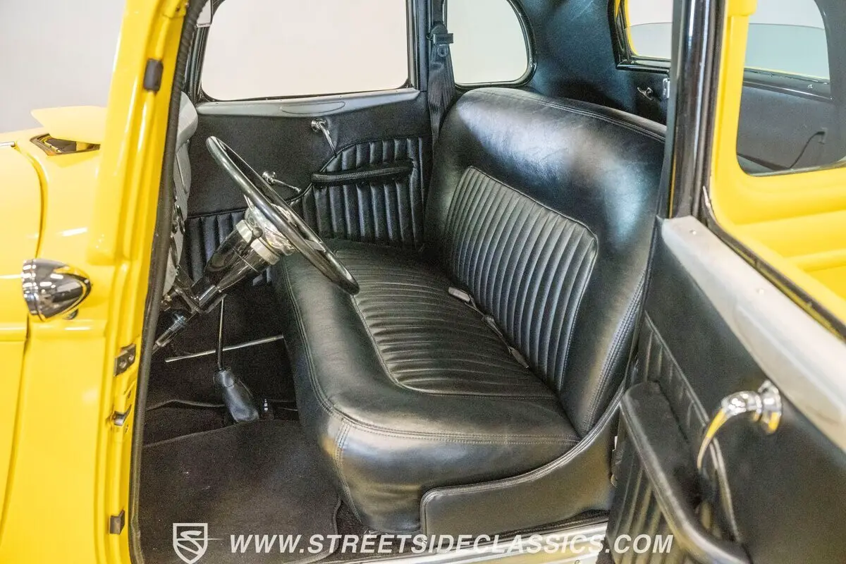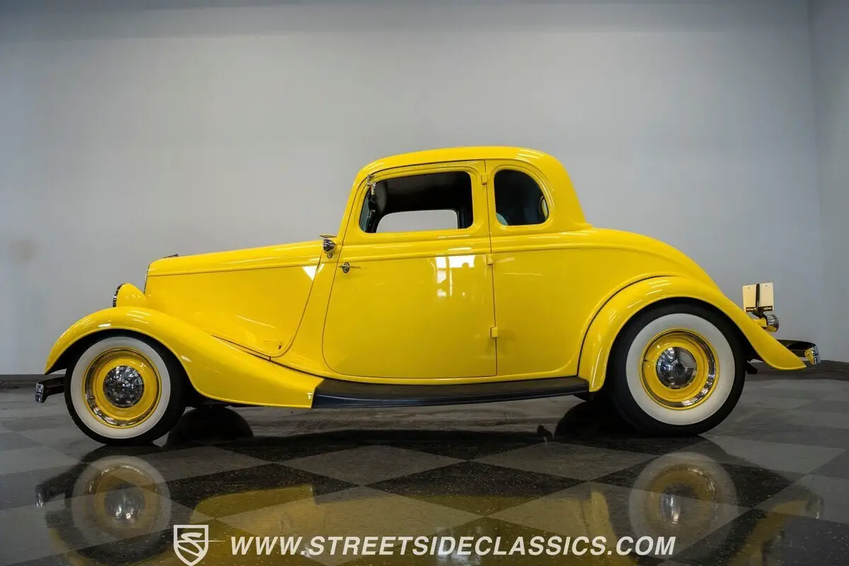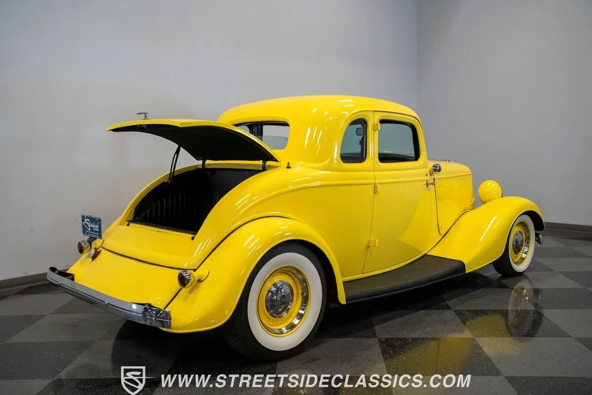 An all-steel 1934 Ford 5-Window with suicide doors sits ready for your garage in brilliant yellow finish. The classic profile is accentuated by chrome bumpers front and rear, with a gleaming chrome grille adding period-correct style. A functional cowl vent and fold-down rear window maintain authentic touches, while the steel wheels with beauty rings and center caps add a clean, timeless look. The single driver's side mirror and large headlights with side marker lights on the cowl complete the exterior presentation. Wide white 165R15 front and 235/75R15 rear radial tires provide the perfect look and stance.