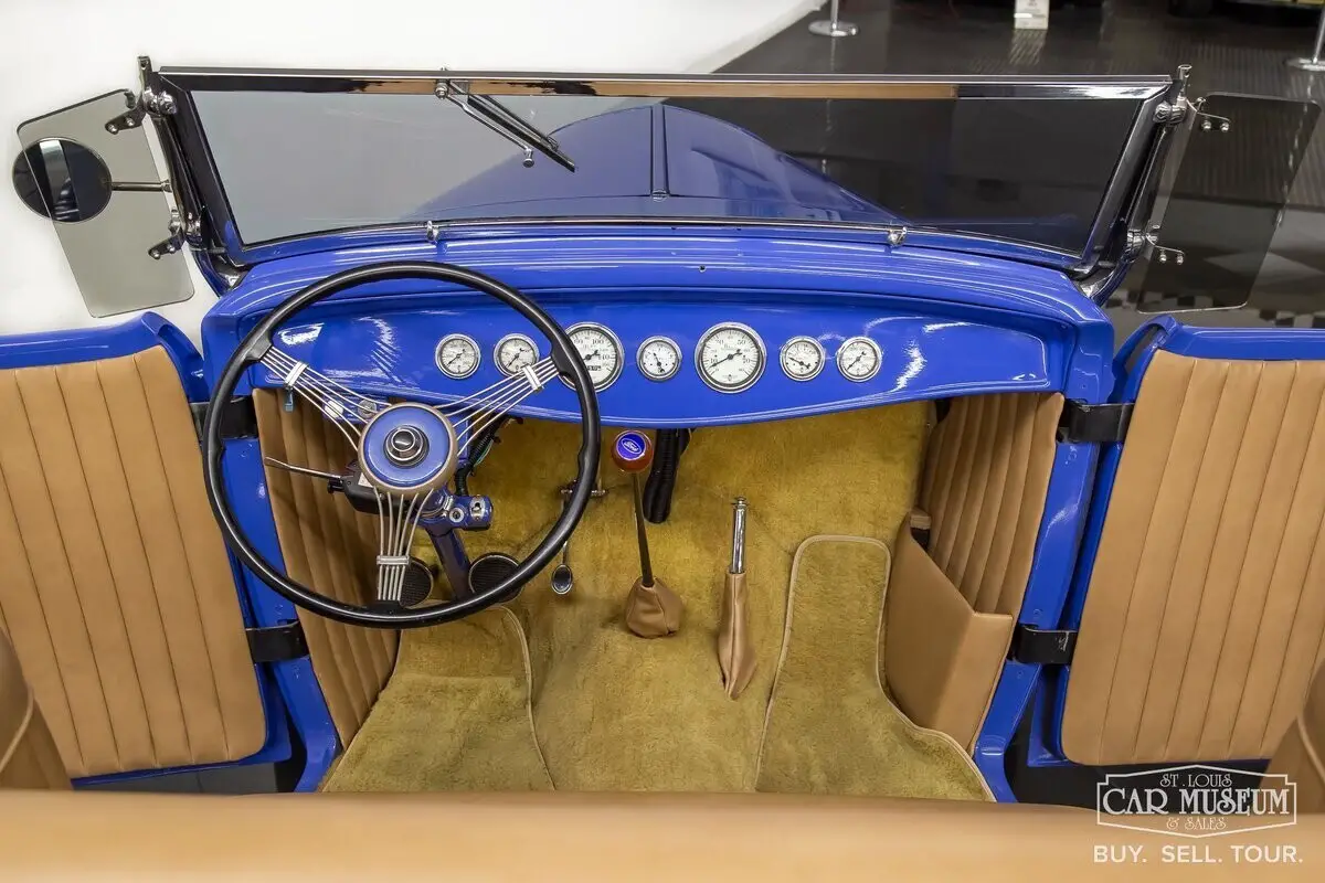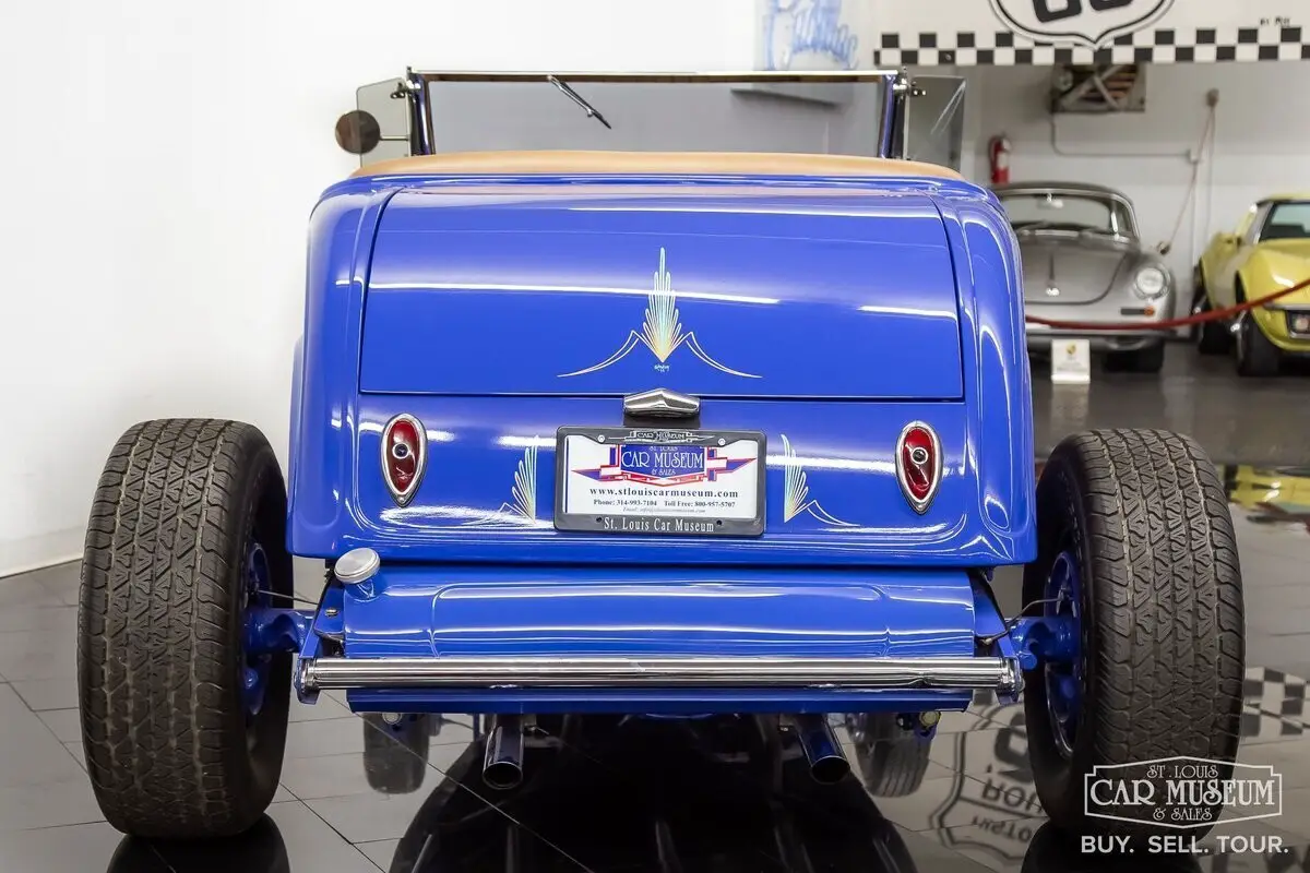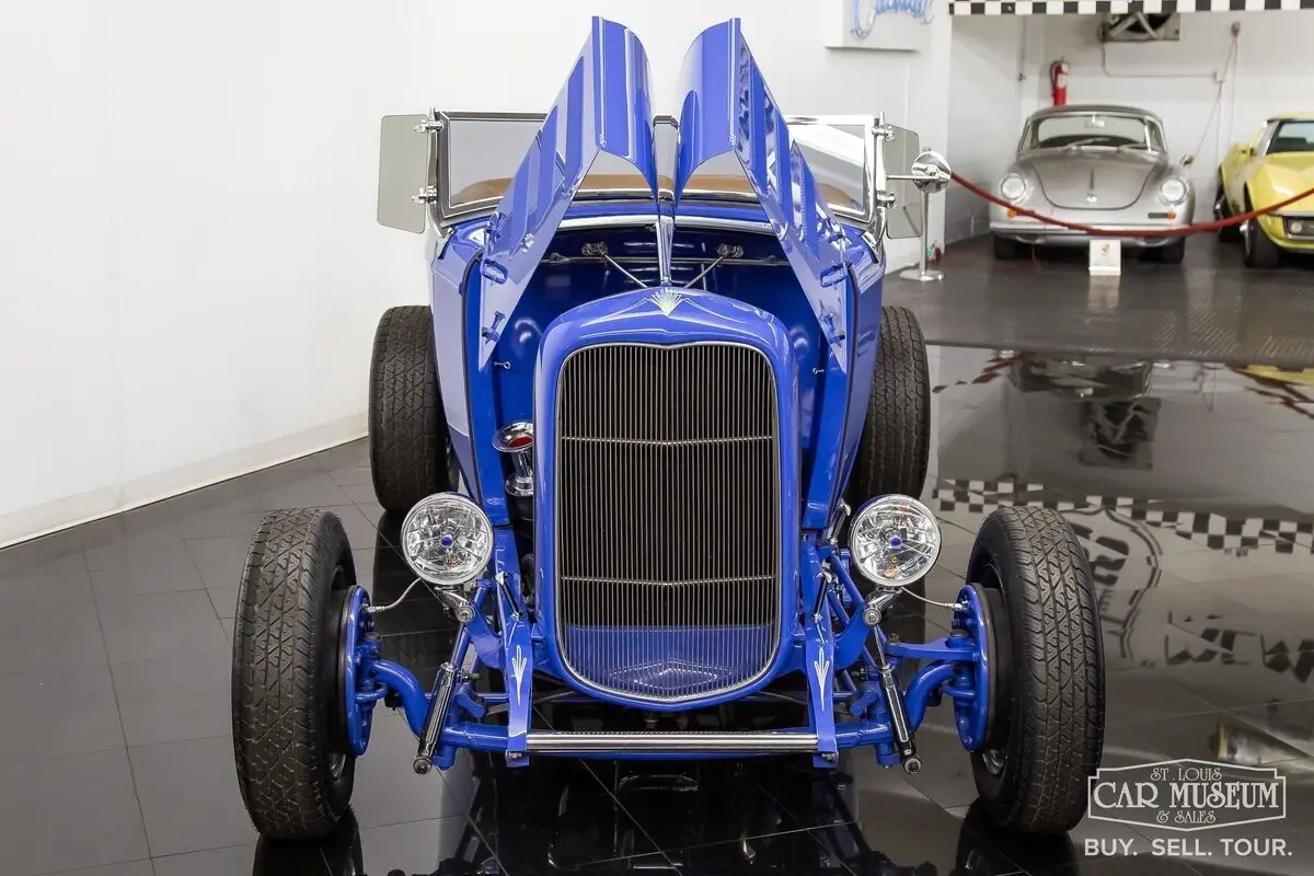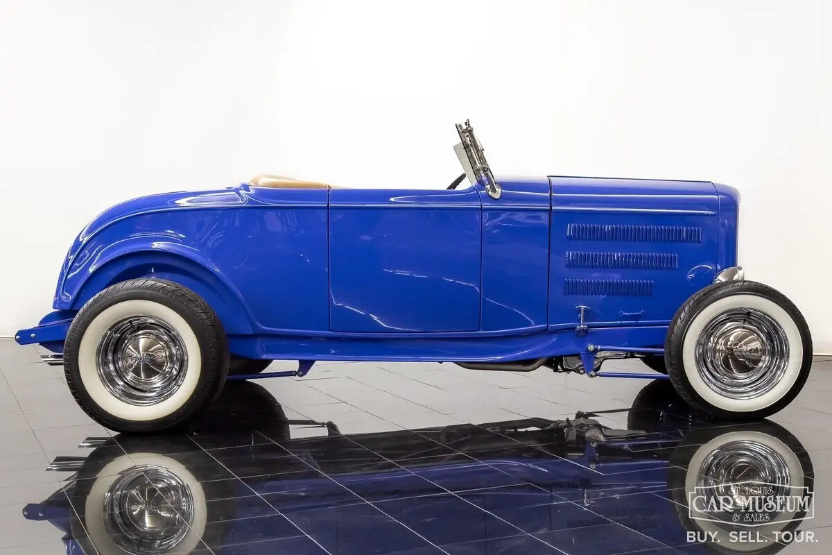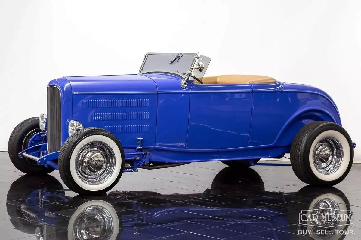 Vehicle Original VIN : 181846334Details About Our Available Ford Streetrod: On display and for sale at the St. Louis Car Museum is a 1932 Ford Highboy Roadster finished in a vibrant Blue with a Tan vinyl interior perfectly accented with Light Blue and Tan pinstriping! Power comes from an 8BA-generation 239ci Flathead V8 with earlier generation center port 59A Offenhauser finned aluminum 24-stud heads and an Offenhauser dual carb aluminum intake fitted with Ford 59 carburetors and Edmonds oval aluminum air cleaners. Spark delivery is provided with a Mallory dual-point distributor and coil with a billet heat shield. Ceramic-coated exhaust headers feed twin Smitty mufflers for an outstanding hot rod sound! Cooling efficiency is provided by a Brassworks radiator up front. Power output is now estimated at 125 horsepower and delivered through a floor-shifted 3-speed manual transmission and Ford 9" rear axle. Beginning this build in the mid 1990's, a new 1932 style roadster chassis was modified and reinforced with a front & rear 4-link parallel suspension with horizontal leaf springs. The front received a 4" tubular drop axle with a manual steering box; along with drum brakes, braided stainless steel brake lines, and Pete & Jake's chrome shock absorbers at all four corners. The fiberglass Roadster body was supplied from Downs Industries which was expertly molded with wood & steel reinforcements, hidden door & trunk hinges, and a cockpit that was stretched 2" to provide more cabin leg room for occupants. It was painted an eye-catching shade of blue and carefully pinstriped by artist, Shakey, in 1998 upon completion with a combination of blue and tan! It will come with a complete steel hood assembly already painted to match, with only the upper hood in use presently. The sides are shown in the photographs. Inside the cockpit, you will see the full array of Stewart Warner instrumentation, turn signals, banjo steering wheel, tinted windshield + wind wings, wood shift knob, and carpeted floor mats. All new 12-volt wiring with a new fuse panel installed in the process. On the ground are 15" chrome wheels/hubcaps wrapped in BF Goodrich Silvertown Radial whitewall tires measuring 165R15 up front and 255/70R15 at the rear. The results are quite striking! Its full combination of all-Ford components provides for a truly traditional street rod that will speak to the hearts of the classic 1950's era of early Ford customizers! Don't miss this opportunity to own a terrific era-correct custom Ford Roadster that is genuinely fun to drive! It is titled as a 1932 Ford. Call 855-586-3413 to schedule a test drive or to ask about financing and/or shipping this Custom Classic! History About Ford's Early V8 styles: Early Ford body designs have been a notoriously popular platform for customization into street rods for many years. Particularly the Model A and early Ford V8 styles of the 1930's. A great number of designers and builders have captured the attention of classic car enthusiasts with their more appealing high horsepower drivetrains along with sculpted body lines and typical wild paint jobs! Each one different than the next, owning a custom 1930's Ford is a great way to add an individual touch to your collection! Questions about this 1932 Ford for sale? Contact Jon Faust at 855-586-3413 or email