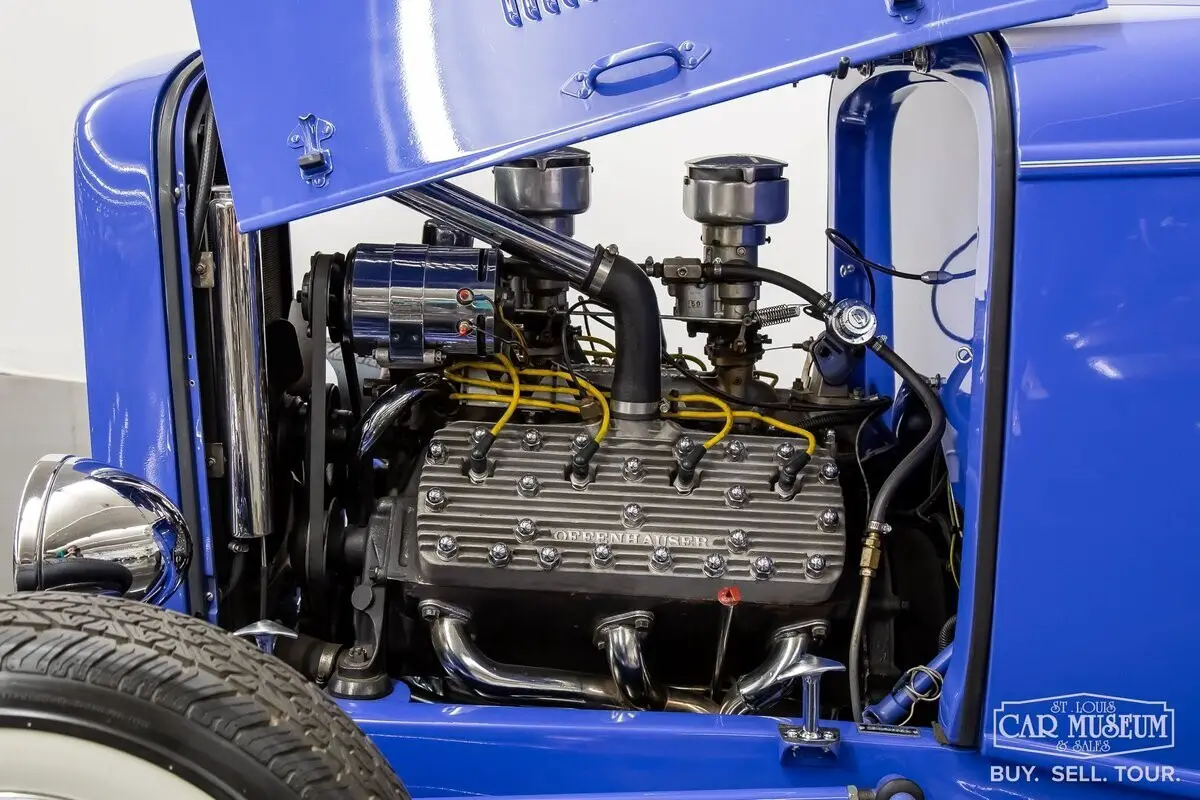 On display and for sale at the St. Louis Car Museum is a 1932 Ford Highboy Roadster finished in a vibrant Blue with a Tan vinyl interior perfectly accented with Light Blue and Tan pinstriping! Power comes from an 8BA-generation 239ci Flathead V8 with earlier generation center port 59A Offenhauser finned aluminum 24-stud heads and an Offenhauser dual carb aluminum intake fitted with Ford 59 carburetors and Edmonds oval aluminum air cleaners. Spark delivery is provided with a Mallory dual-point distributor and coil with a billet heat shield. Ceramic-coated exhaust headers feed twin Smitty mufflers for an outstanding hot rod sound! Cooling efficiency is provided by a Brassworks radiator up front. Power output is now estimated at 125 horsepower and delivered through a floor-shifted 3-speed manual transmission and Ford 9" rear axle.