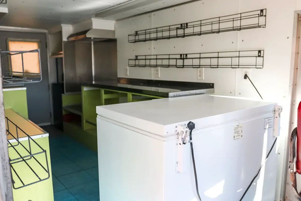 The aluminum body adds lightweight durability, while the service window and roof-mounted air conditioning unit make it ideal for mobile food service. Inside, you'll find a stainless steel kitchen sink, a 30-gallon water tank, a refrigerator, a freezer, and a Southern Snow shaved ice machine, all designed to streamline your operations. Wall-mounted storage and a vented hood enhance practicality and organization.