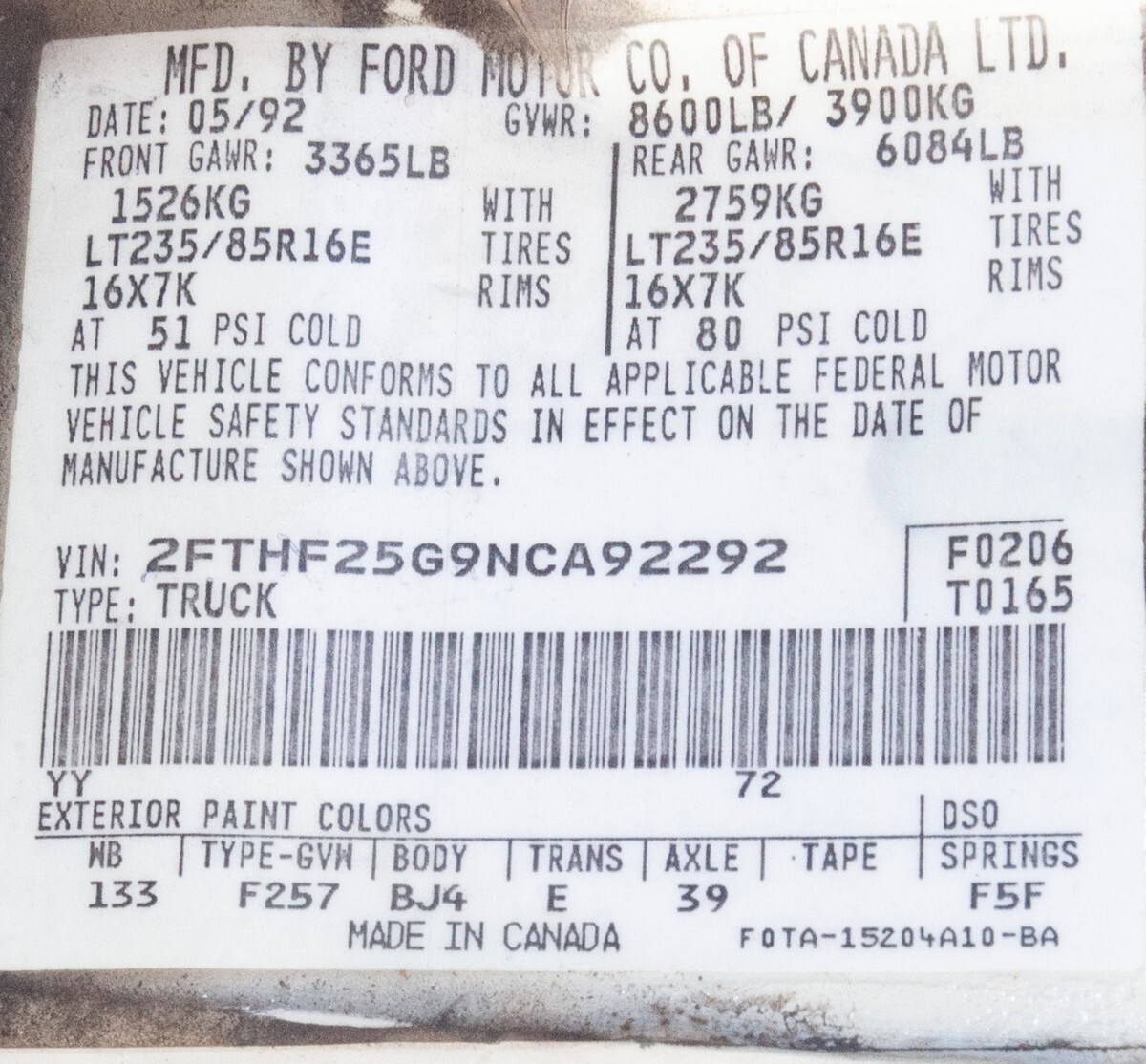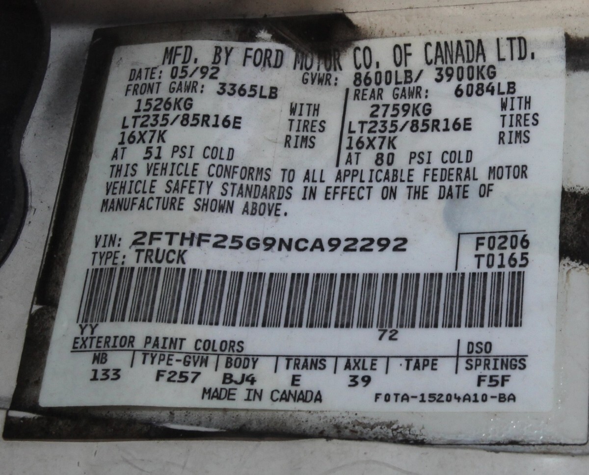 | VIN: | 2FTHF25G9NCA92292 |