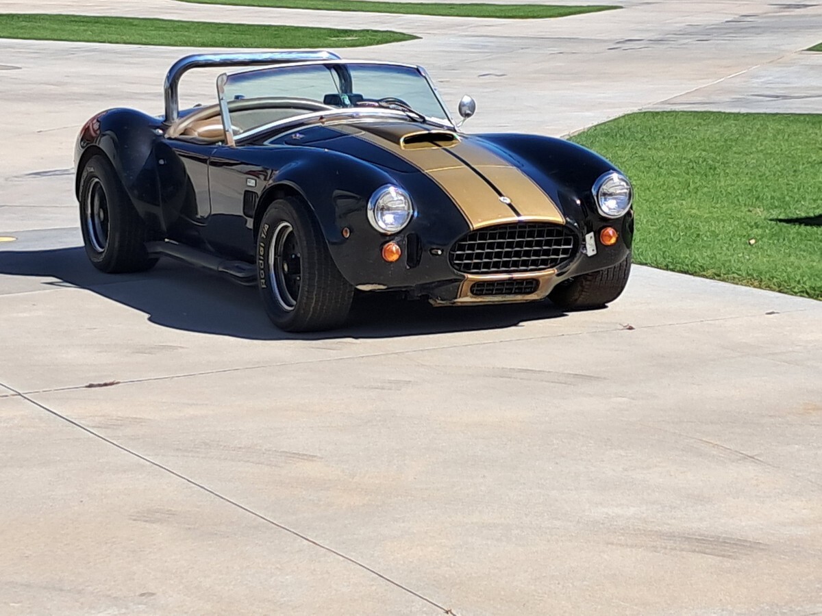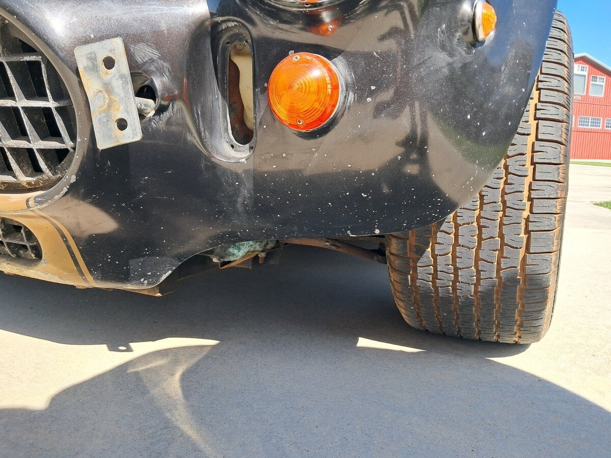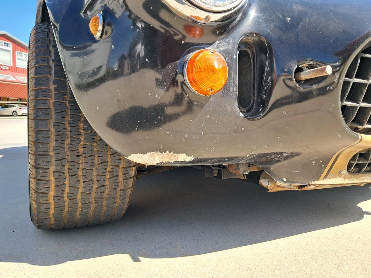 Some gauges are inoperative, and there is no A/C. Heating is minimal—just engine warmth and a good jacket in the winter. Included are the convertible top frame, bumpers (in need of work), various spare parts, the original sales brochure, and a genuine Shelby Cobra jacket. The original gold aluminum wheels have been painted matte black, as have the exhaust pipes. The upholstery appears to be intact for its age, and the fiberglass body is notably thick and solid. Chrome components will need extensive polishing or re-chroming, and the wipers, horn, some gauges, and lights require attention.