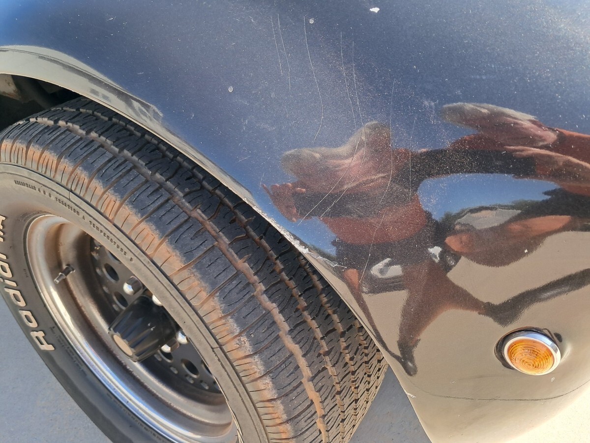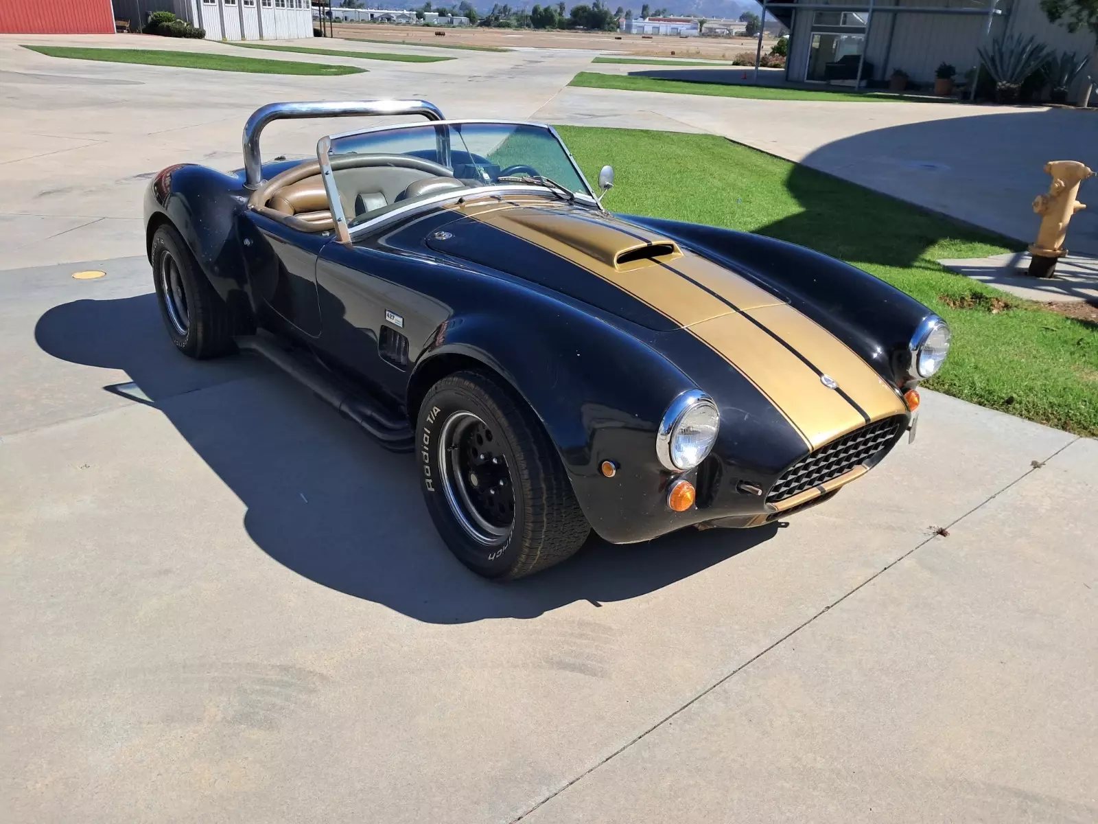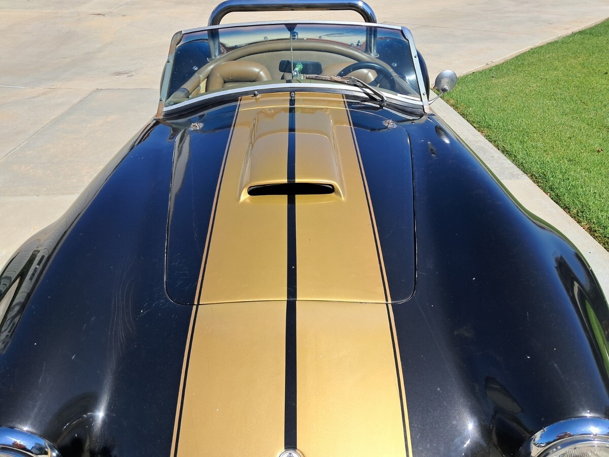 Some gauges are inoperative, and there is no A/C. Heating is minimal—just engine warmth and a good jacket in the winter. Included are the convertible top frame, bumpers (in need of work), various spare parts, the original sales brochure, and a genuine Shelby Cobra jacket. The original gold aluminum wheels have been painted matte black, as have the exhaust pipes. The upholstery appears to be intact for its age, and the fiberglass body is notably thick and solid. Chrome components will need extensive polishing or re-chroming, and the wipers, horn, some gauges, and lights require attention.