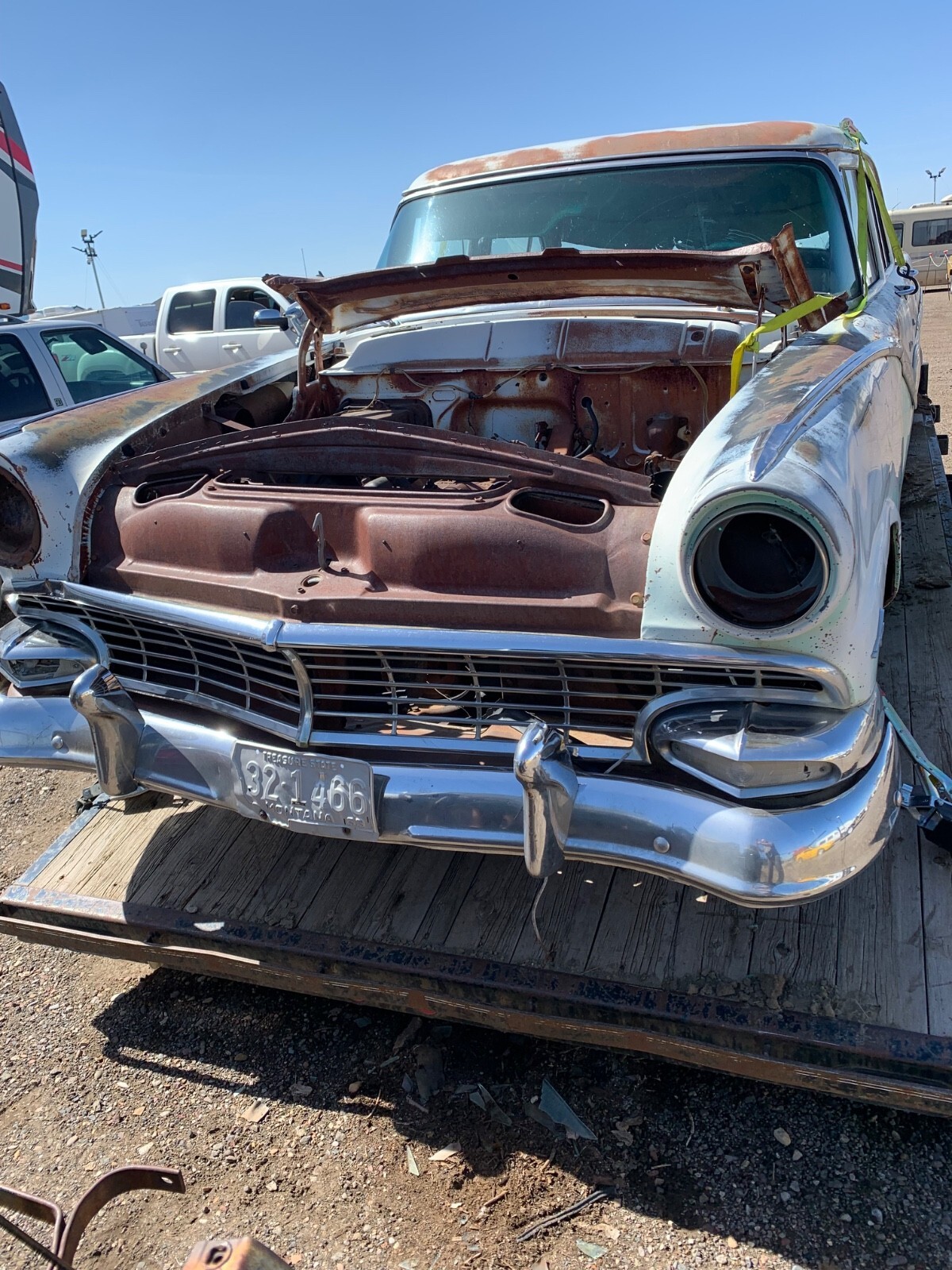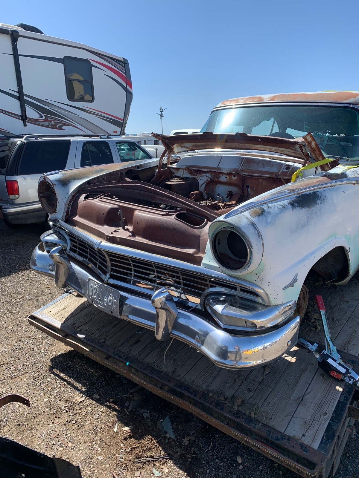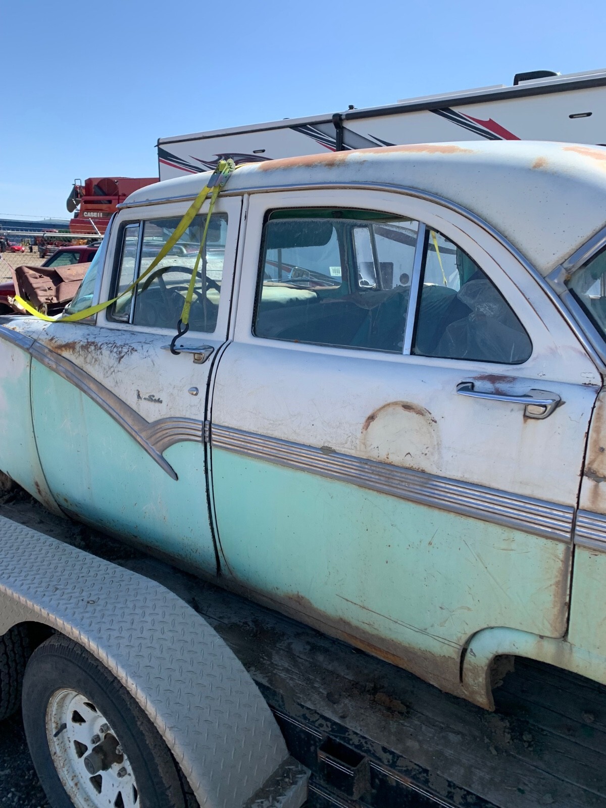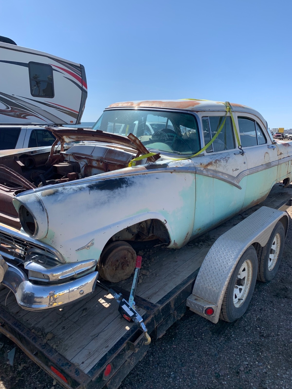 1956 Ford 4 door town sedan, good solid car to restore-very little rust. no hood it doesn't have the original rearend. THERE IS A REAR END INSTALLED SO IT IS A ROLLER. I believe the engine is a 312. all glass is good. Good for parts but I would like to see this car saved. I will help load for transport. NO TITLE. Sold with a notarized bill of sale. will only accept payment with cashiers, personal check or money wire.