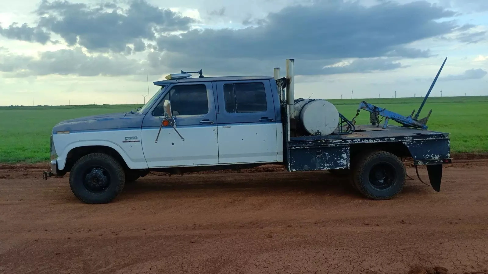 1985 F350 crew cab, 2wd, w/'93 5.9L 12-valve Cummins Diesel engine, 5-speed main, converted t-case into 2-speed transmission, 4.11 limited slip rear, hydro boost brakes, 105 gallon tank, 8' flatbed, air ride front end, new batteries.