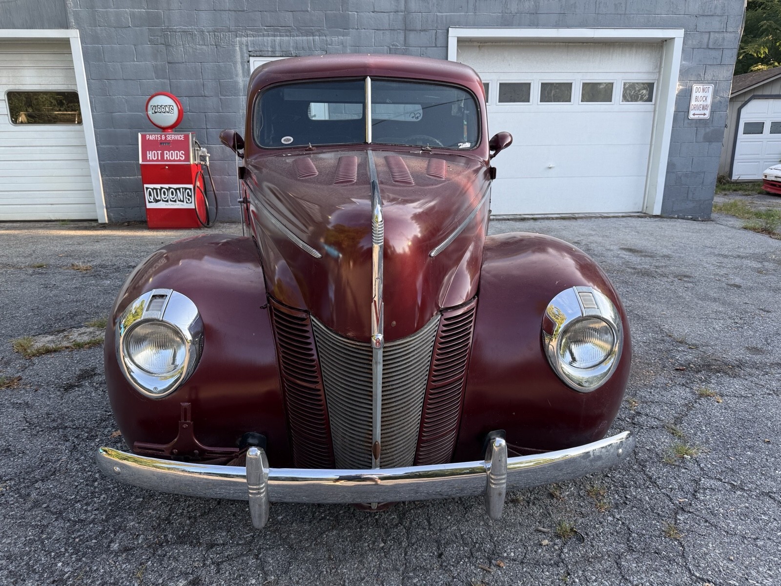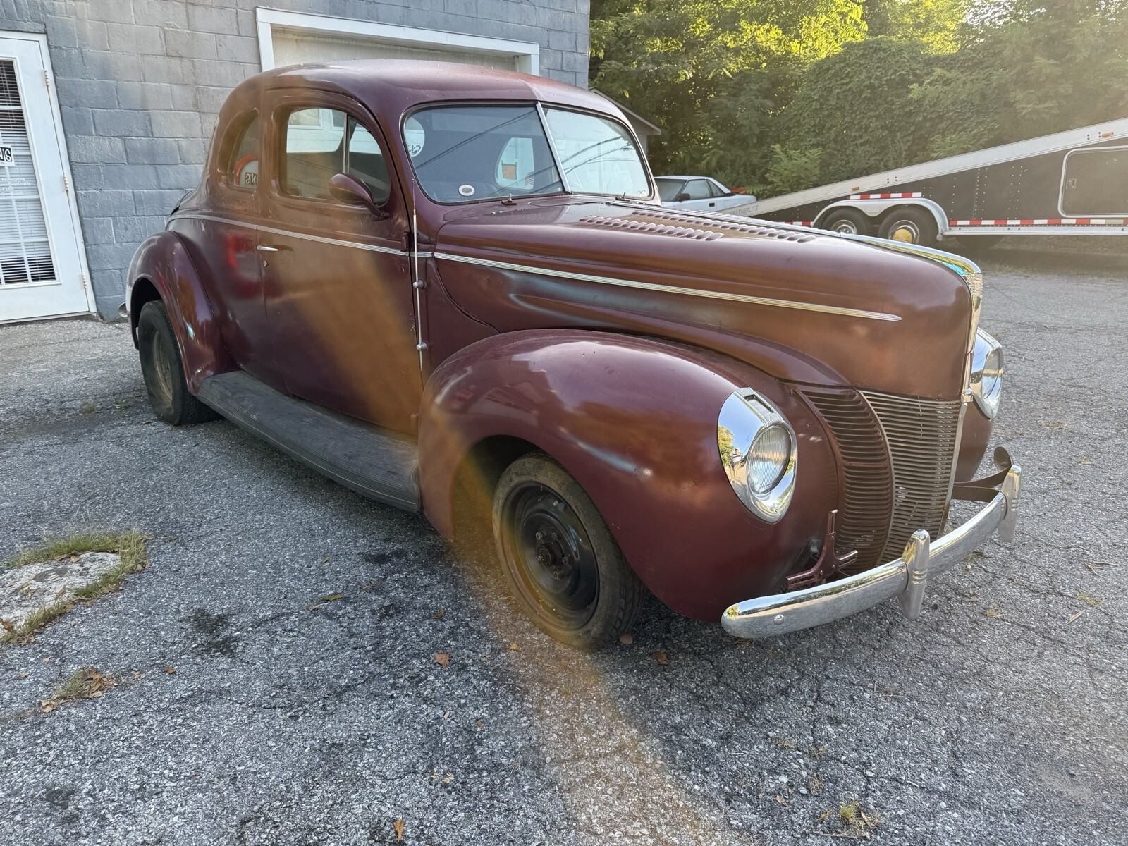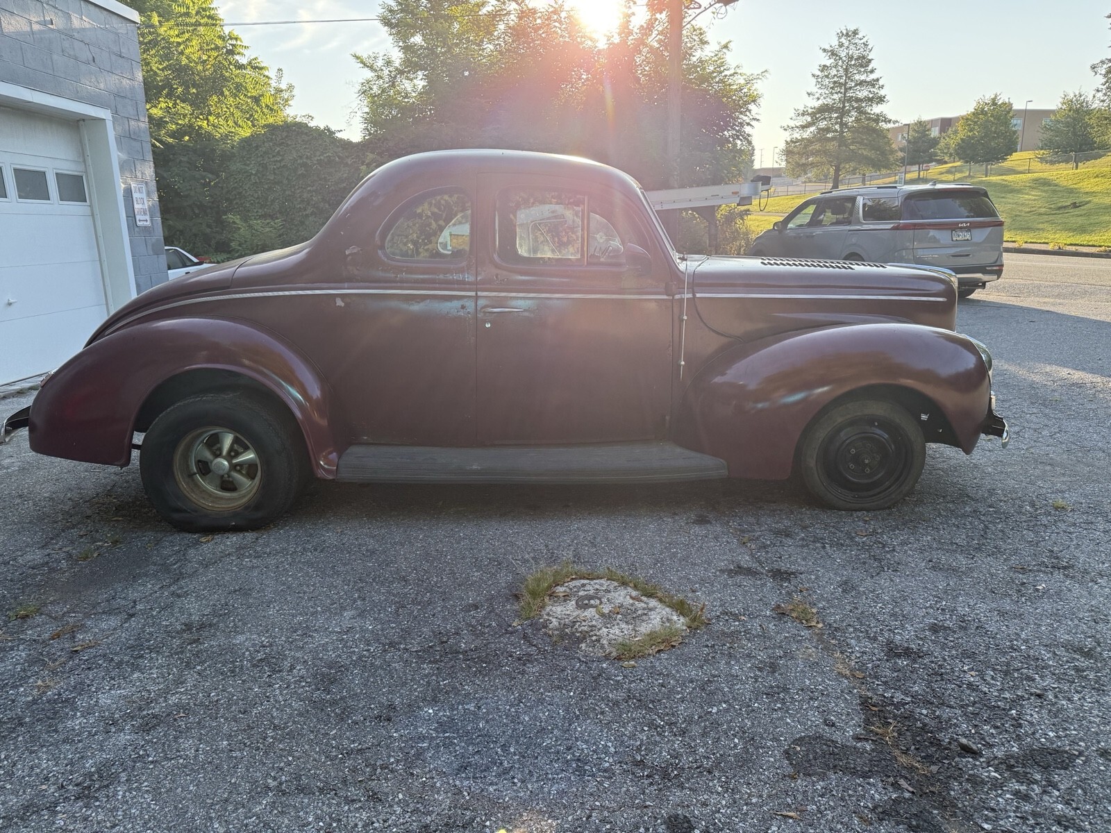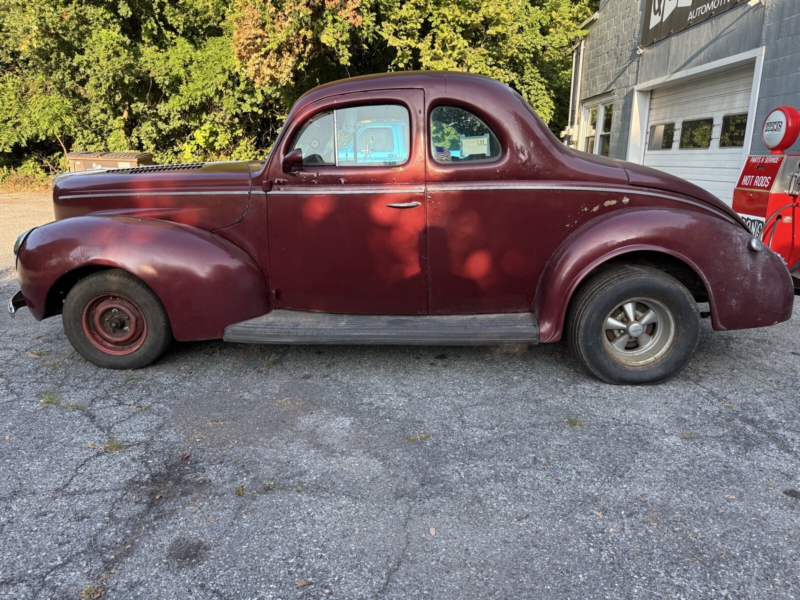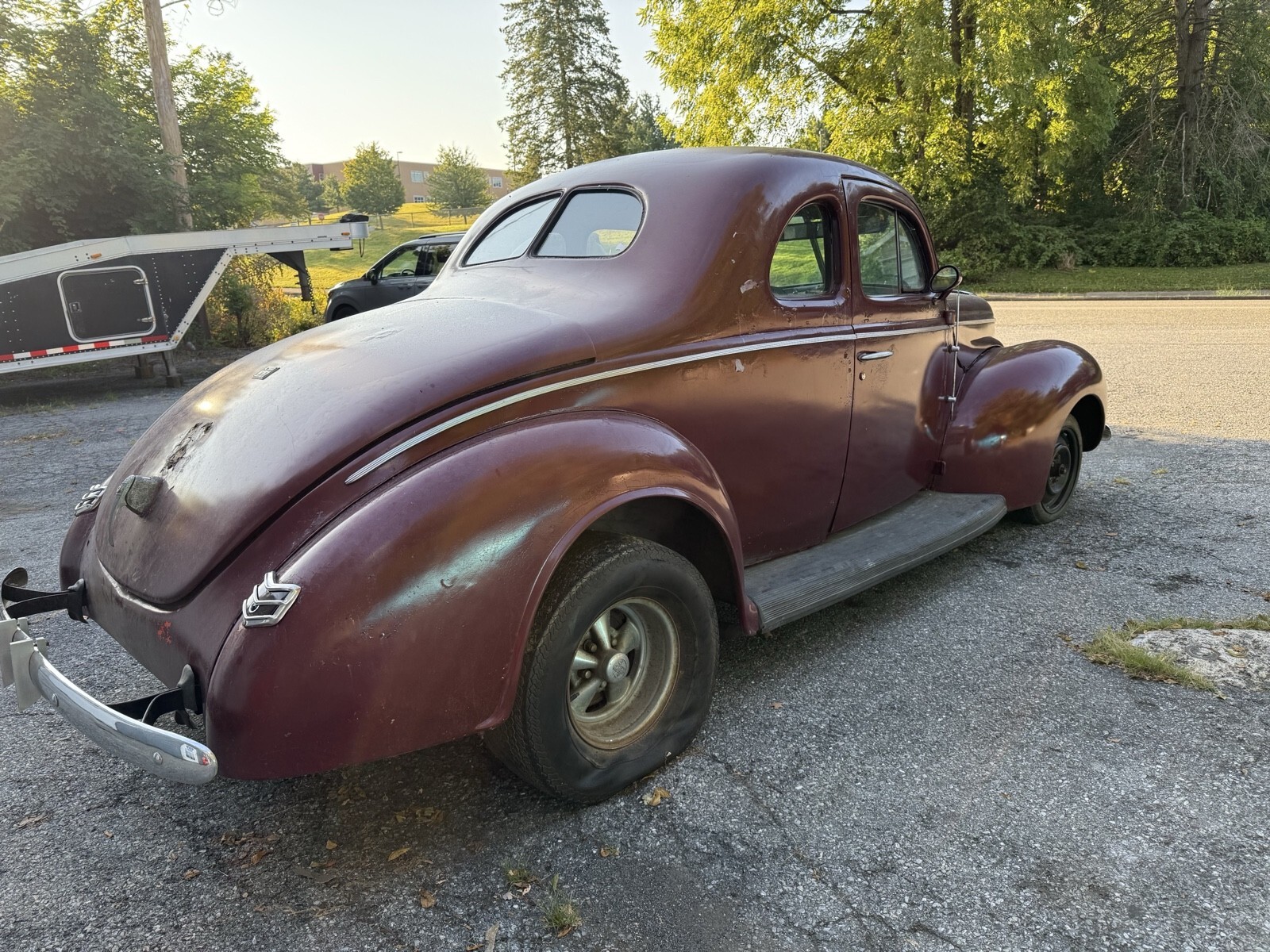 1940 Ford Deluxe coupe. Old hot rod that has been in storage for many years. In as-found condition. Ran when parked according to the estate. Small block Chevy V8, most likely a 283 or 327 2 barrel engine. Automatic transmisison, appears to be a Powerglide. Olds rear with parellel leaf springs. Stock front axle and suspension with original sway bar, tube shocks and disc brakes. Running condition unknown but engine turns over freely by hand.