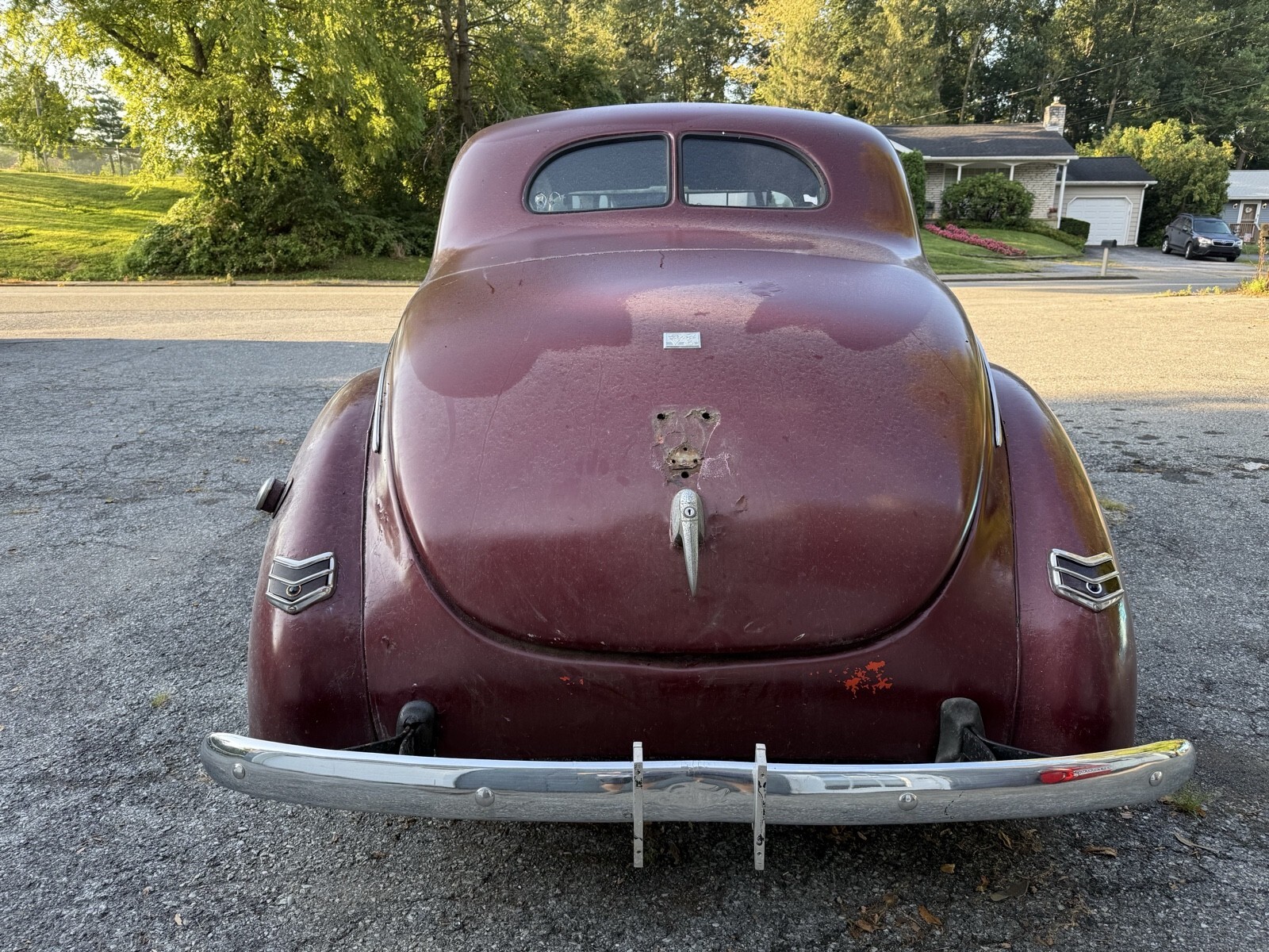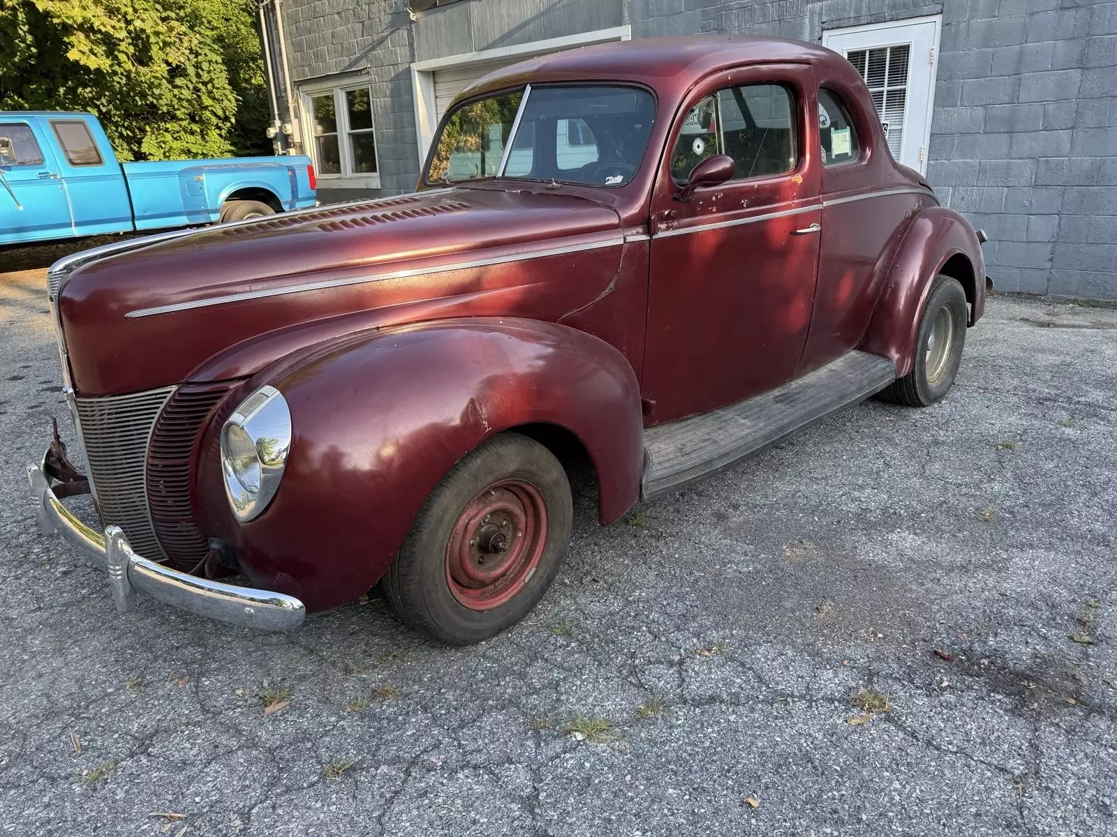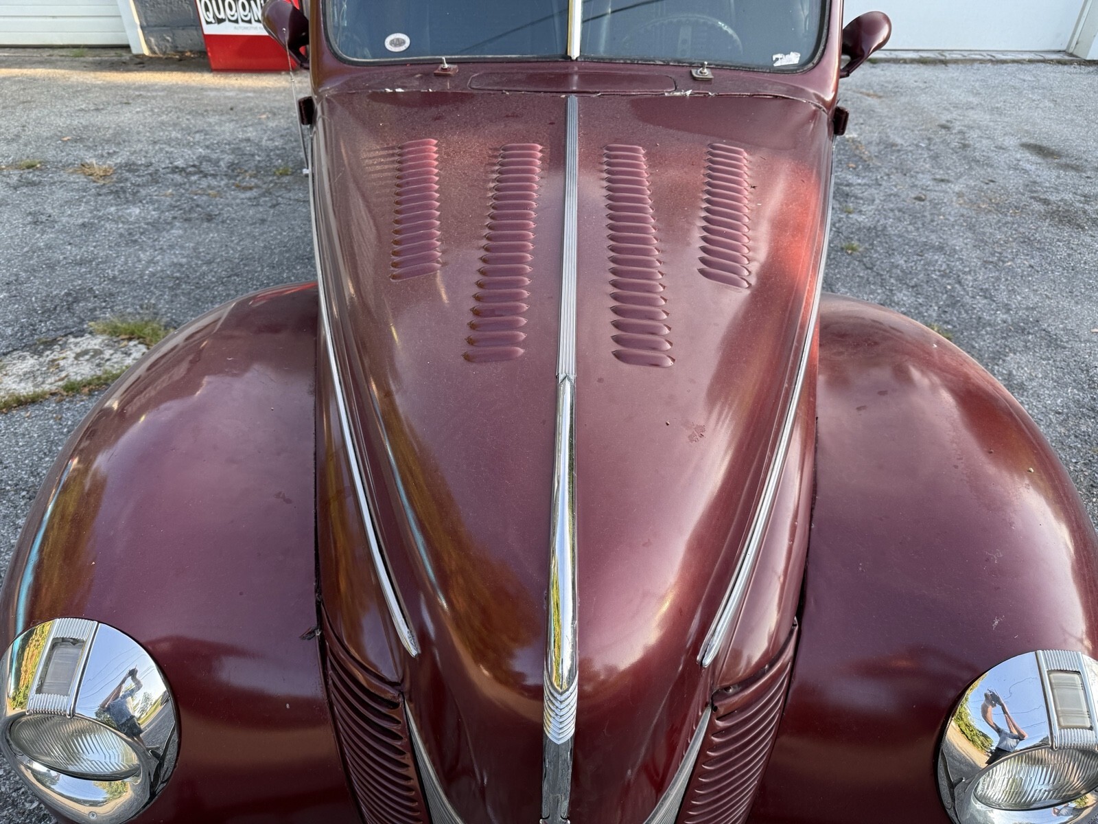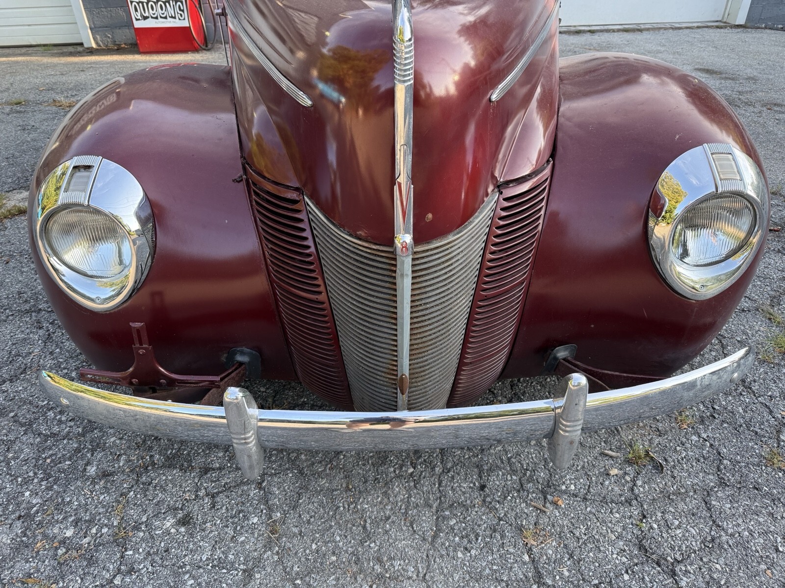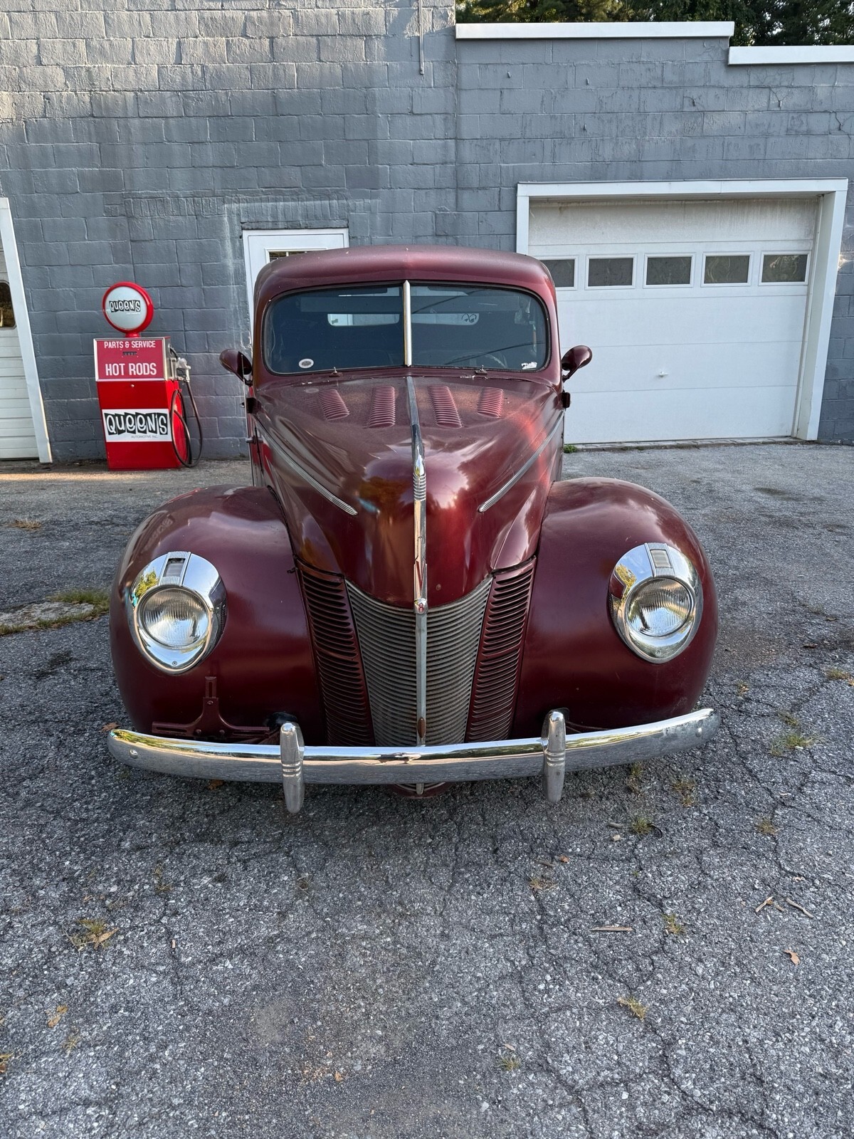 1940 Ford Deluxe coupe. Old hot rod that has been in storage for many years. In as-found condition. Ran when parked according to the estate. Small block Chevy V8, most likely a 283 or 327 2 barrel engine. Automatic transmisison, appears to be a Powerglide. Olds rear with parellel leaf springs. Stock front axle and suspension with original sway bar, tube shocks and disc brakes. Running condition unknown but engine turns over freely by hand.