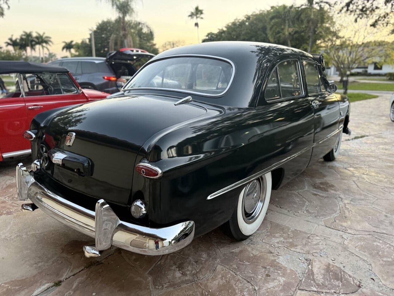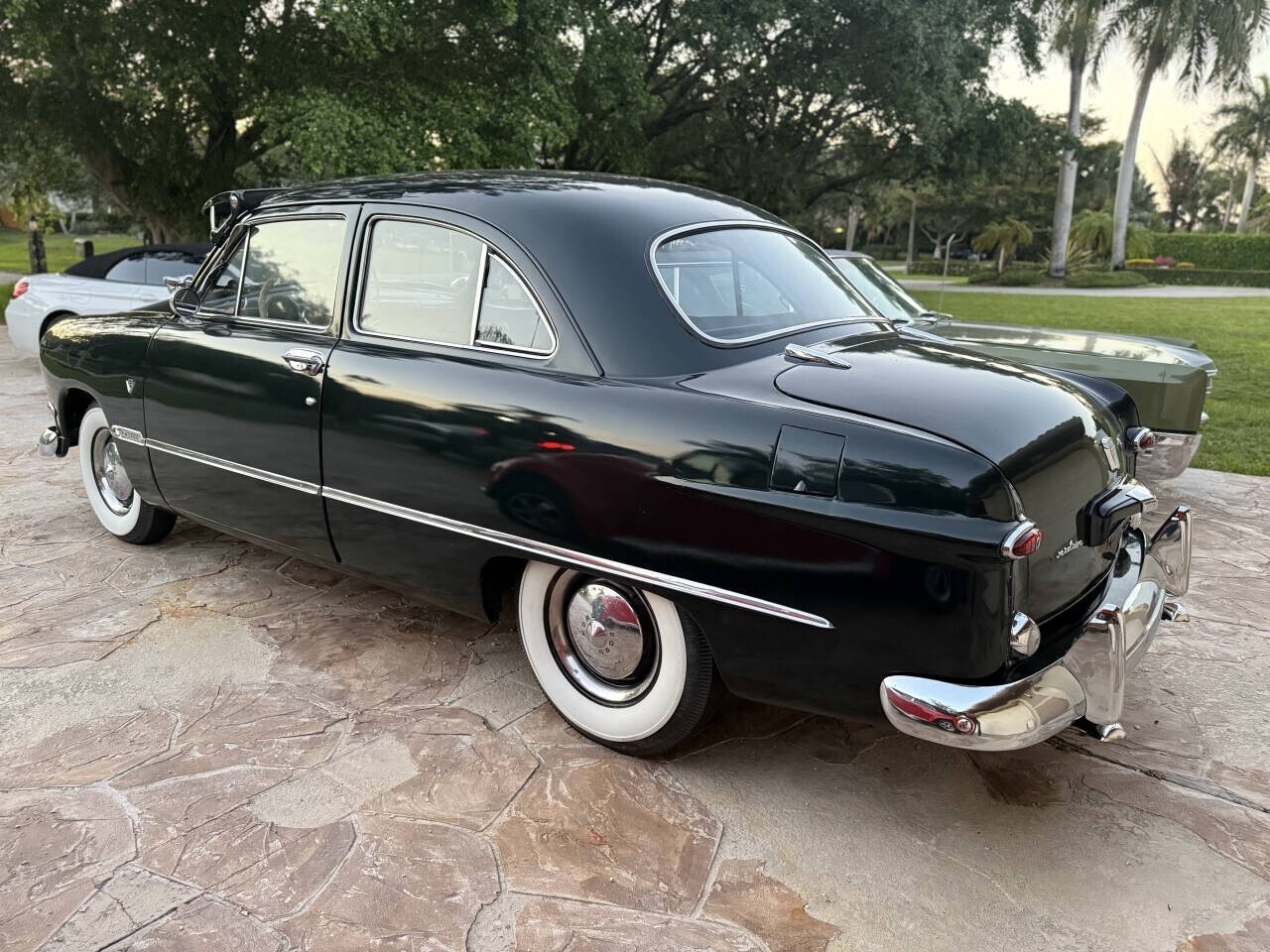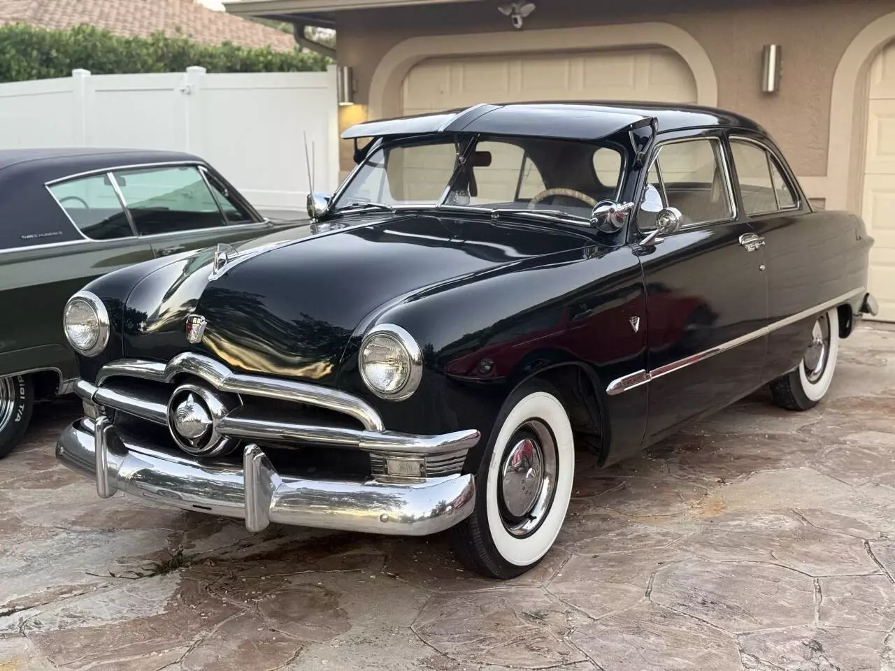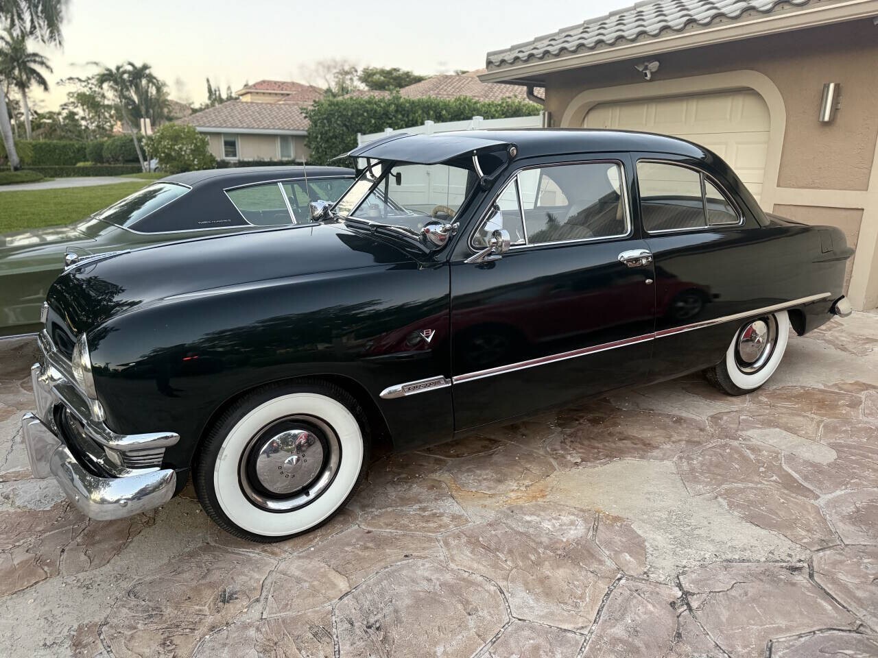 Very nice 1950 Ford 2 door Coupe Shoebox, It has the original Flathead V-8 engine that was rebuilt & Sounds Great. It starts up easily every time, strong runner, runs smooth and cool. It has a nice clean and detailed engine bay with newer 12 Volt battery. It has the original 3 on the tree manual transmission. It shifts nice and smooth! It has new clutch, pressure plate & throw out bearing when engine was overhauled. It has approximately 2000 miles on since resto according to previous owner. The paint is a very dark green color-almost black. The paint is nice & shiny & was done 5 years ago. It has a solid body with no patches or bond. Solid undercarriage that is nice & clean. It has nice sun visor & matching painted fenders skirts included. The glass is all good. The window roll up & down nicely. The car has its original interior that is in very nice shape. This car has dual spotlights. Chrome & stainless trim is all very nice. The dual exhaust sounds nice. It has nice unmolested dash & gauges. Has newer aluminum radiator. The original size bias-ply WWW tires have excellent tread. Clean & Clear title In Hand Ready For New Owner.