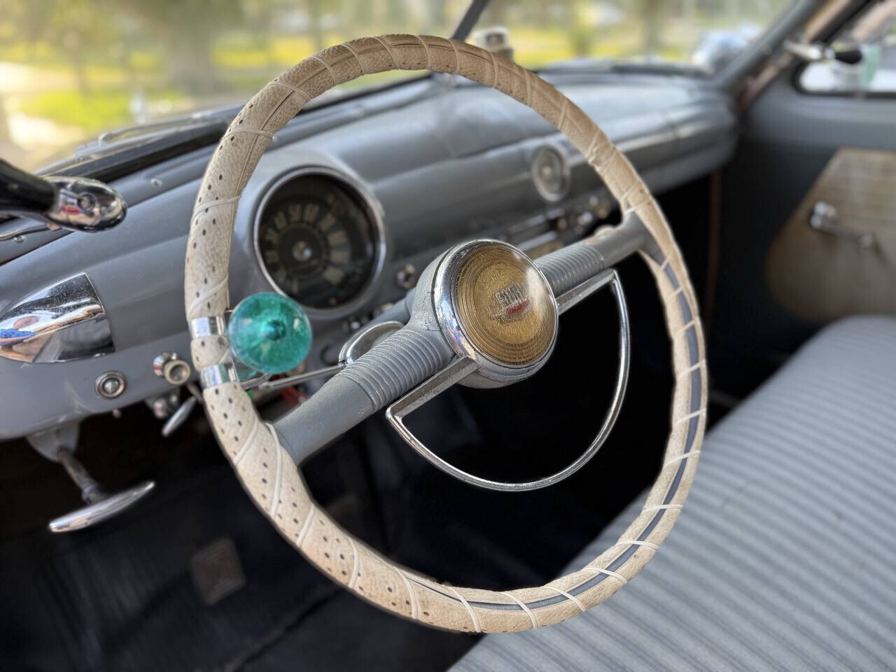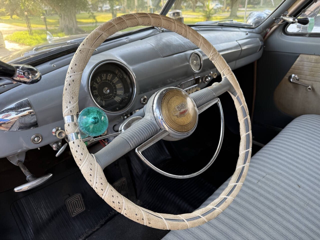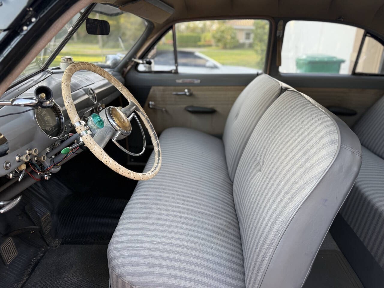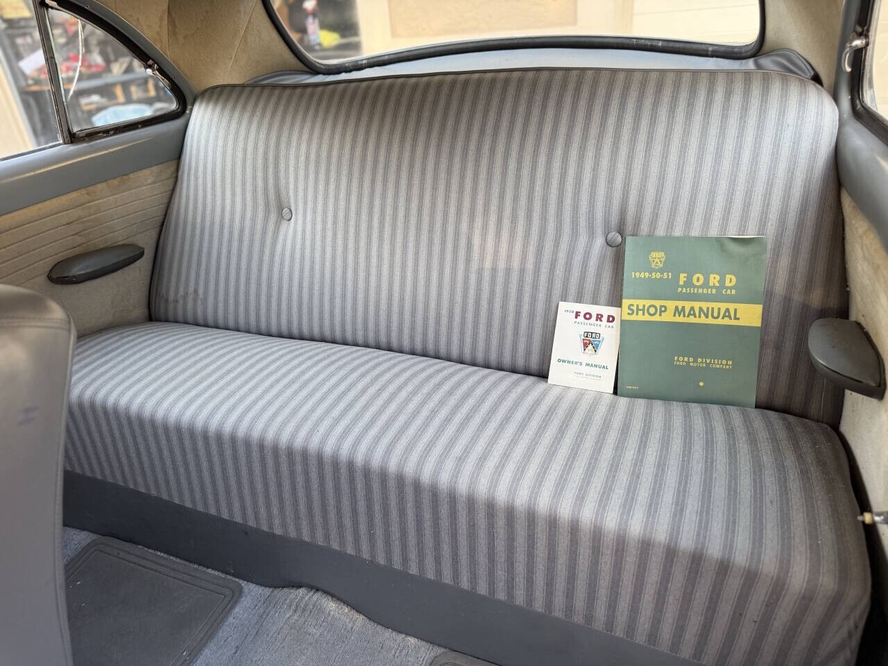 Very nice 1950 Ford 2 door Coupe Shoebox, It has the original Flathead V-8 engine that was rebuilt & Sounds Great. It starts up easily every time, strong runner, runs smooth and cool. It has a nice clean and detailed engine bay with newer 12 Volt battery. It has the original 3 on the tree manual transmission. It shifts nice and smooth! It has new clutch, pressure plate & throw out bearing when engine was overhauled. It has approximately 2000 miles on since resto according to previous owner. The paint is a very dark green color-almost black. The paint is nice & shiny & was done 5 years ago. It has a solid body with no patches or bond. Solid undercarriage that is nice & clean. It has nice sun visor & matching painted fenders skirts included. The glass is all good. The window roll up & down nicely. The car has its original interior that is in very nice shape. This car has dual spotlights. Chrome & stainless trim is all very nice. The dual exhaust sounds nice. It has nice unmolested dash & gauges. Has newer aluminum radiator. The original size bias-ply WWW tires have excellent tread. Clean & Clear title In Hand Ready For New Owner.