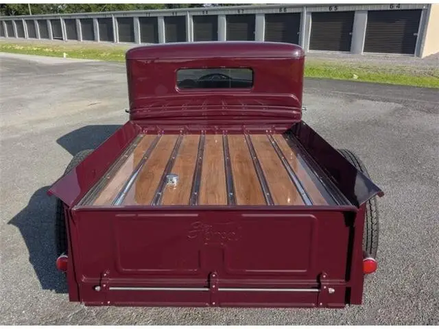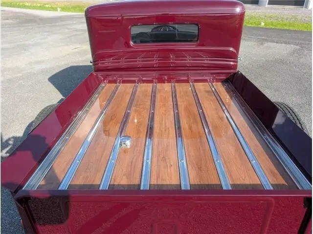 This all-steel body has been chopped and channeled 4 inches and dressed in rich maroon paint with a '32 Ford grille shell and custom wood bed. B-L-C headlamps, a functional cowl vent, roll-out windshield, and ‘39 Chevy tail lights add vintage flair.