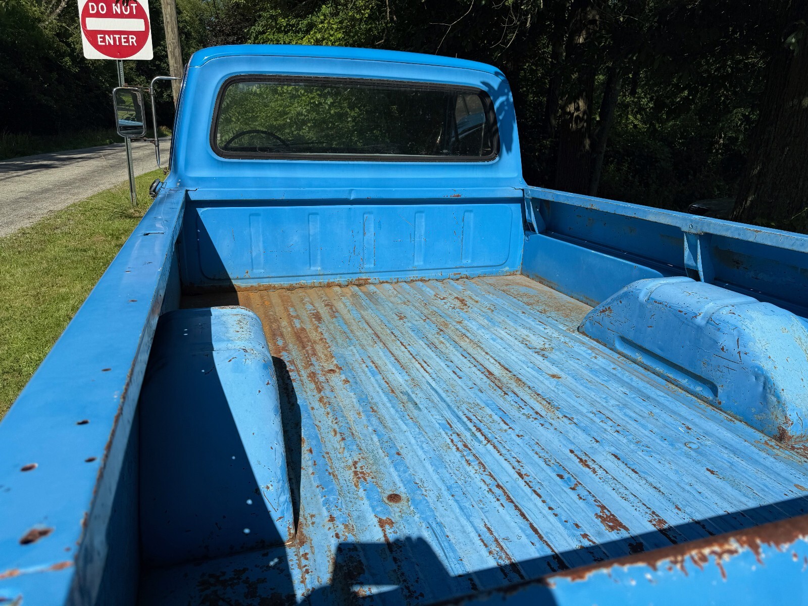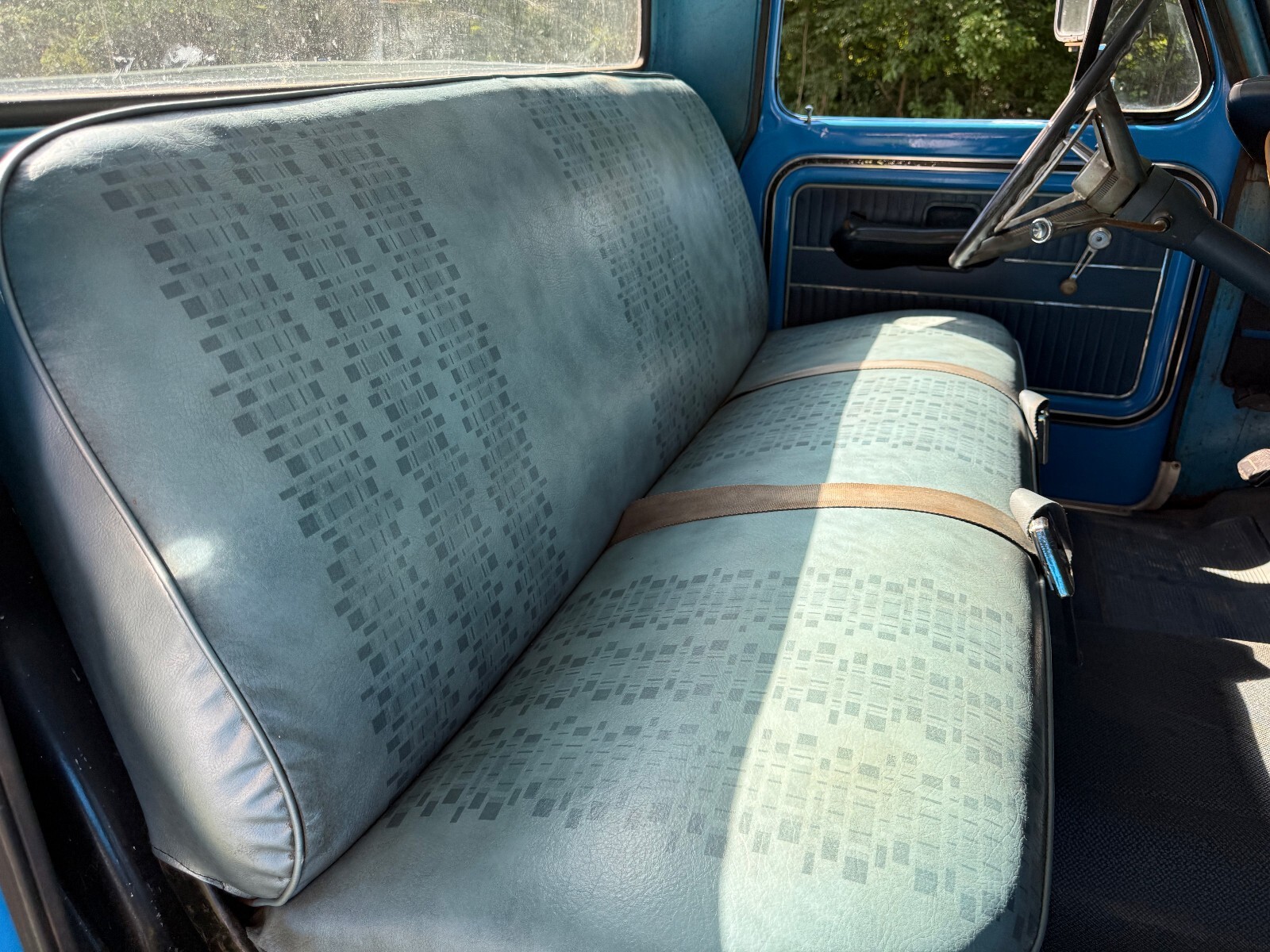Condition is very original with the 302 cubic inch V8 and 3-speed manual transmission. The odometer shows 26409 miles but true mileage is unknown (TMU) and the Antique registration states “mileage exempt”. The Styleside 8 foot bed is in good condition and the gate closes easily and latches securely. The doors also close properly as well (Built Ford Tough!). Overall this truck is in solid condition...the inner fenders and cab corners which typically rust on these trucks are rock solid, the only place that rust-through has occurred is beneath the battery box (see photo below). The electrical system has been gone through with new battery, new alternator, new voltage regulator to insure proper charging.