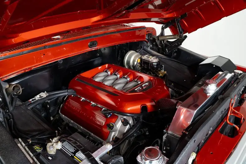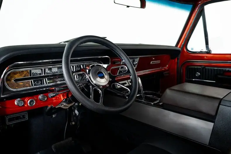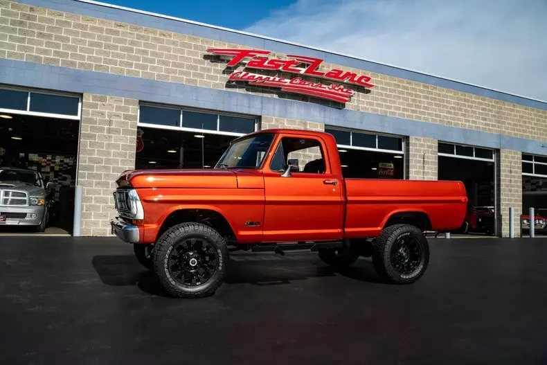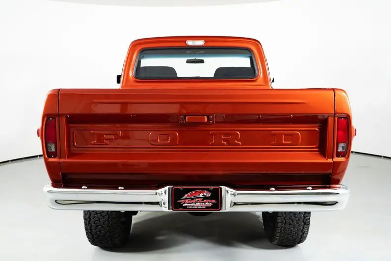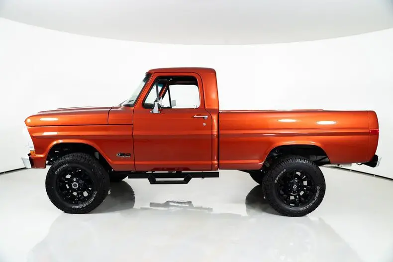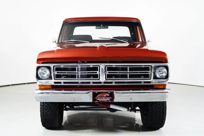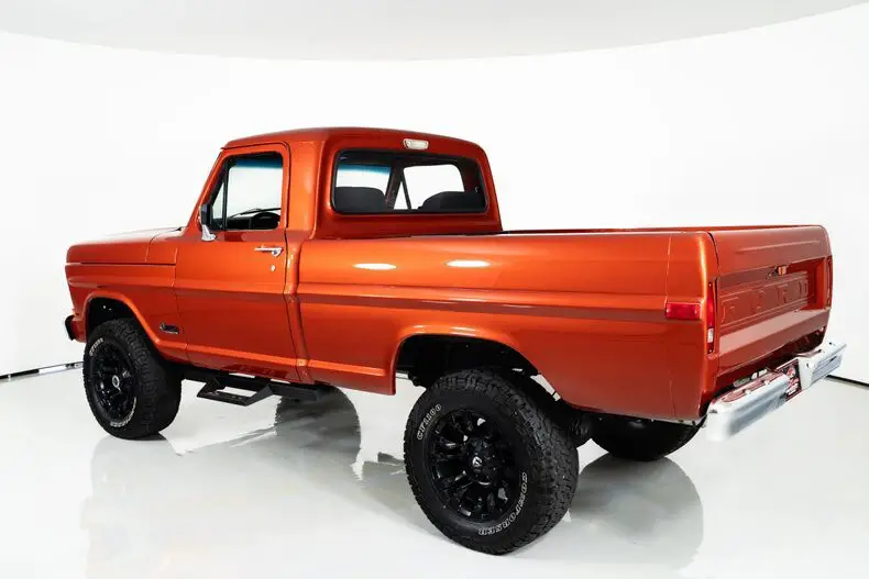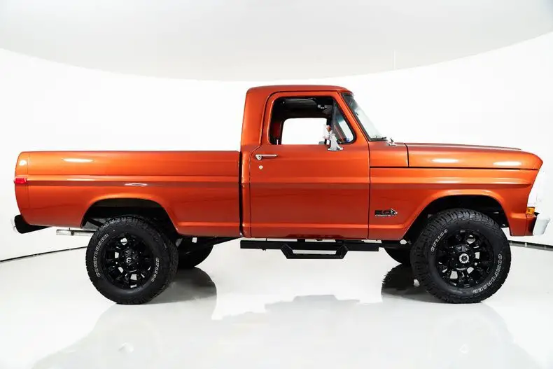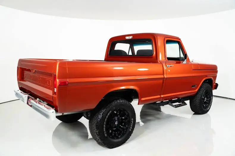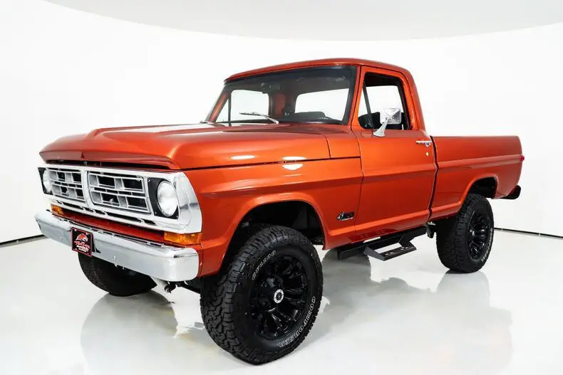 This 1971 Ford F100 4x4 Resto-Mod Pickup for sale has a 5.0 Coyote V8, Automatic Overdrive Transmission, Burnt Orange Exterior, Short Bed, W/ Spray-In Liner, 31x12.50 R18 LT Tires, Black Cloth Bucket Seat Interior, Air Conditioning, Power Steering, Power Brakes, All the Good Looks of a '71 F100 with a 5.0 Coyote!!