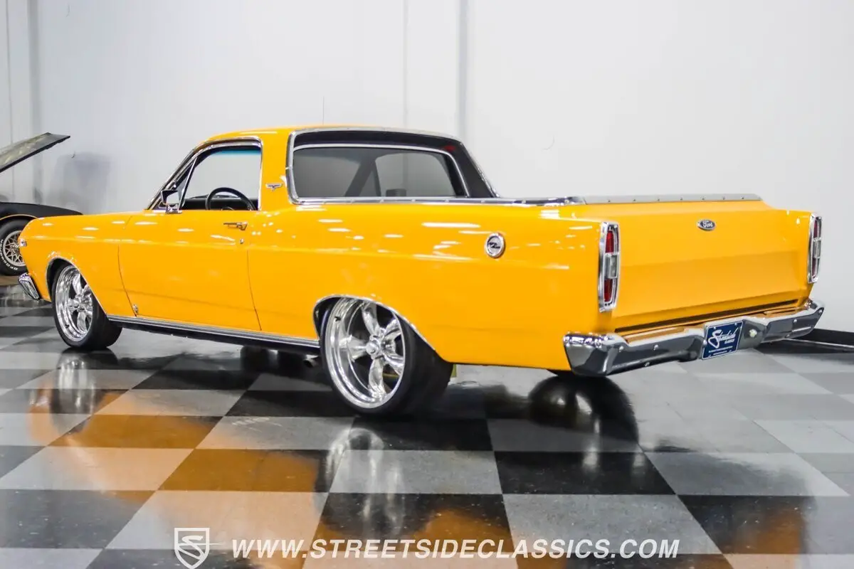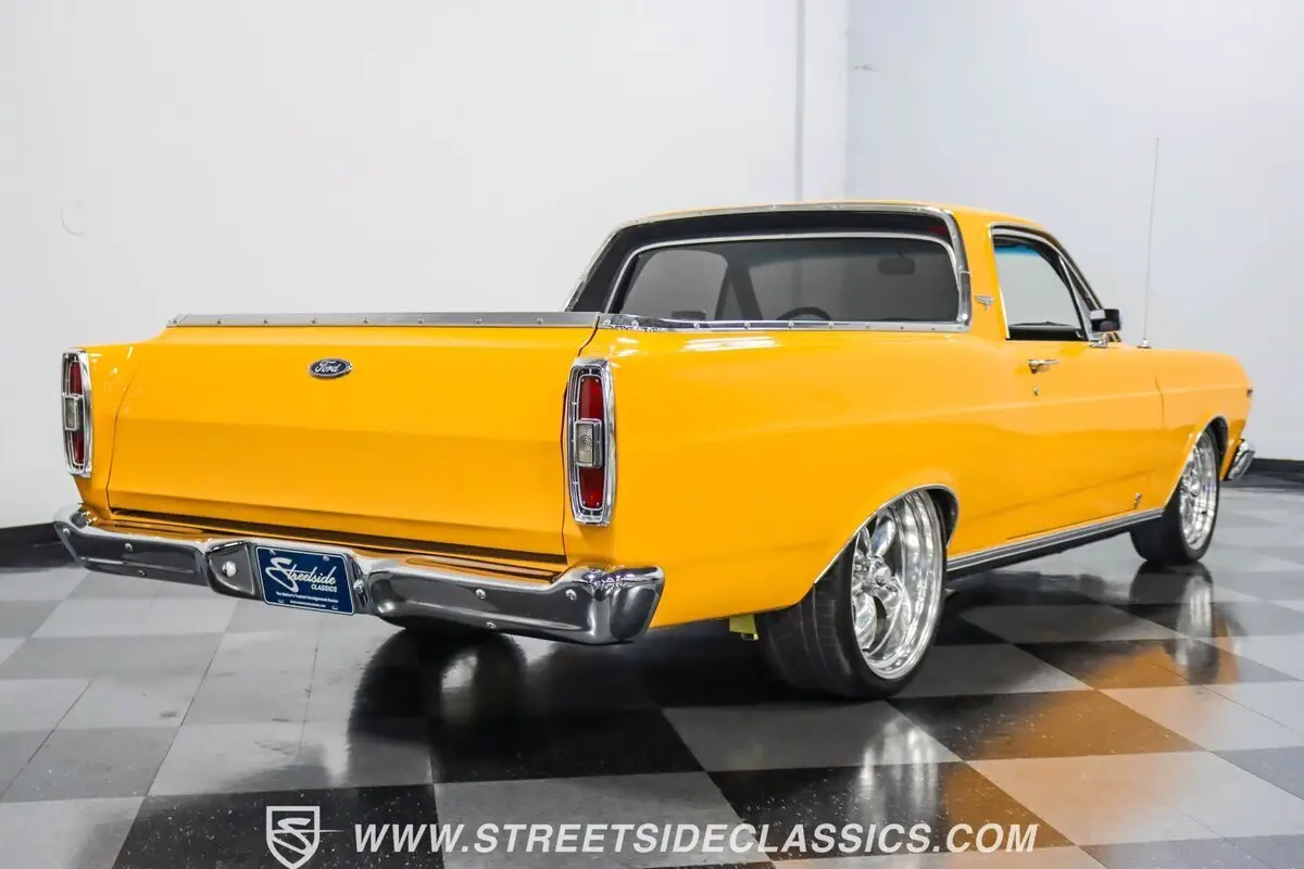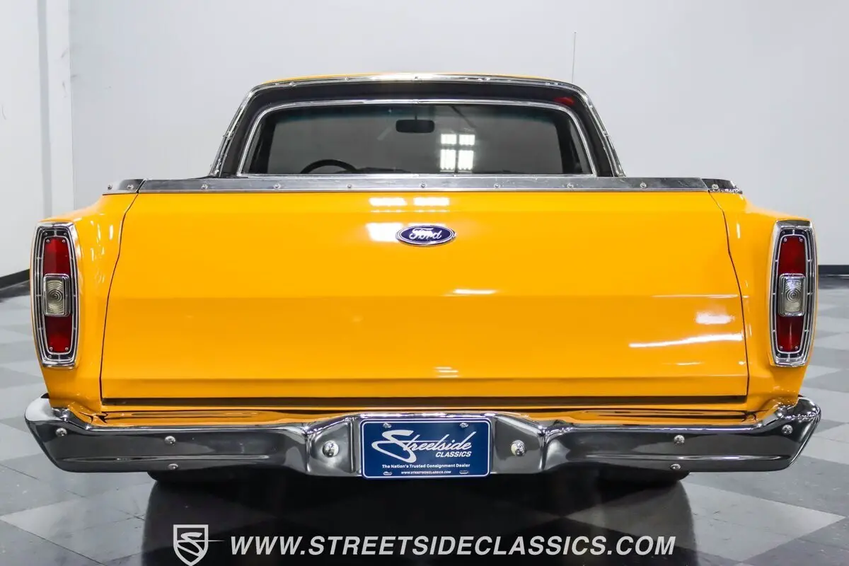 A 1966 Ford Ranchero is a rare find, and finding one in this condition is even rarer. The Ranchero was restyled for 1966 and would be the last year the Ranchero would have Falcon style front sheet metal. In 1967 Ford styled the cars to look more like a Fairlane, making the 1966 model unique and sought-after by collectors today. This sharp-looking Ranchero in finished handsomely in Wheatland Yellow with white hood stripes that showcase a custom installed non-functional hood scoop. Additionally, this classic has been enhanced with upgraded tri-bar headlights, dark tinted glass and a quality Craftec hatch-style tonneau cover with no snaps that lifts up to reveal a beautiful custom-made oakwood bed floor cover that looks amazing. A set of polished American Racing wheels with tires staggered 225/40ZR18 front and 285/30ZR20 rear give this classic Ford a great looking stance.