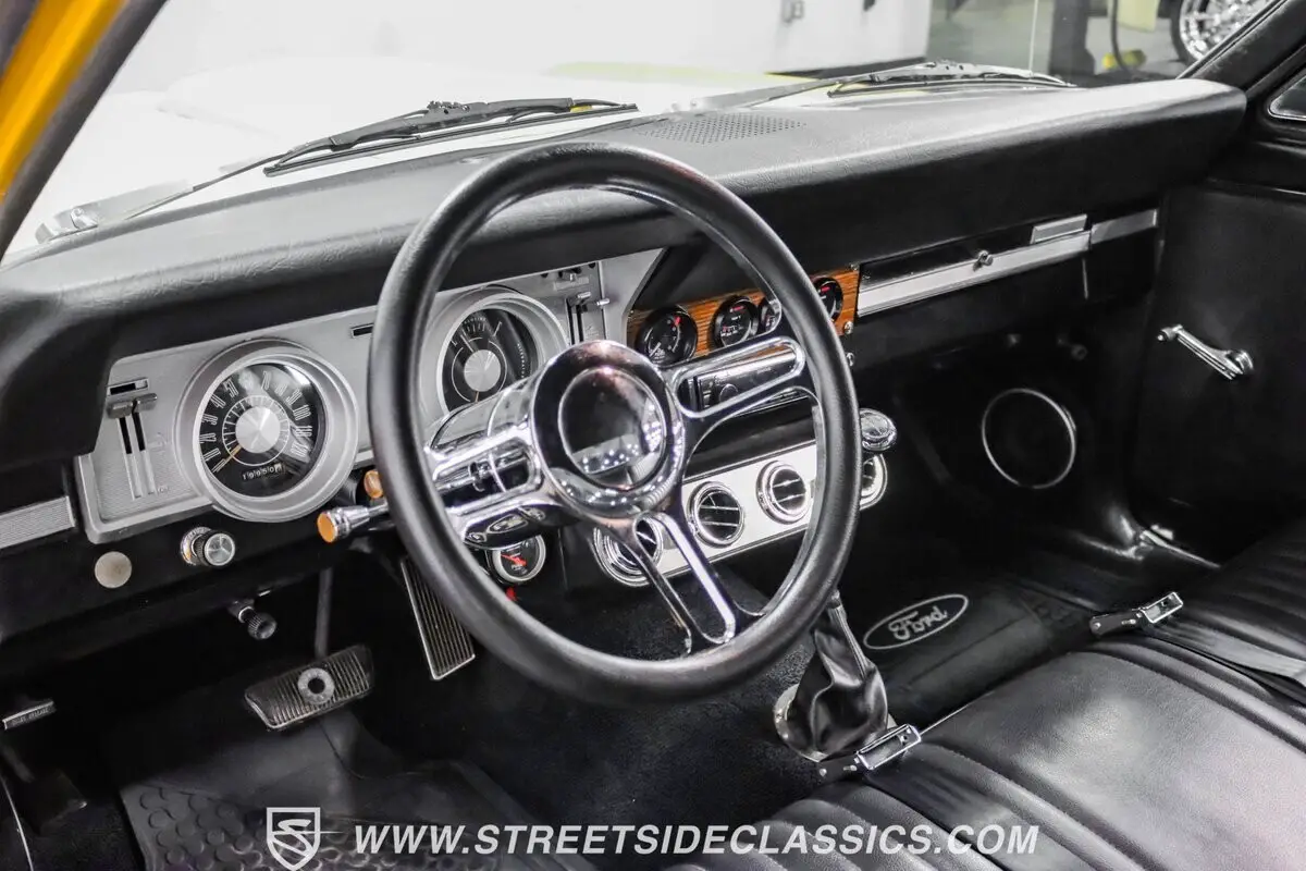Under the hood is a healthy 302 cubic inch engine mated to a C4 automatic transmission that sends power back to a 9-inch Ford rear end with traction bars. The engine looks as great as it runs, with an Edelbrock aluminum intake manifold topped with a Holley carburetor, Edelbrock finned aluminum valve covers with matching air cleaner, MSD ignition, aluminum radiator with electric fans and power brakes with front discs. A set of long-tube headers rumble back through gas pack style mufflers that exit just before the rear wheels on both sides.