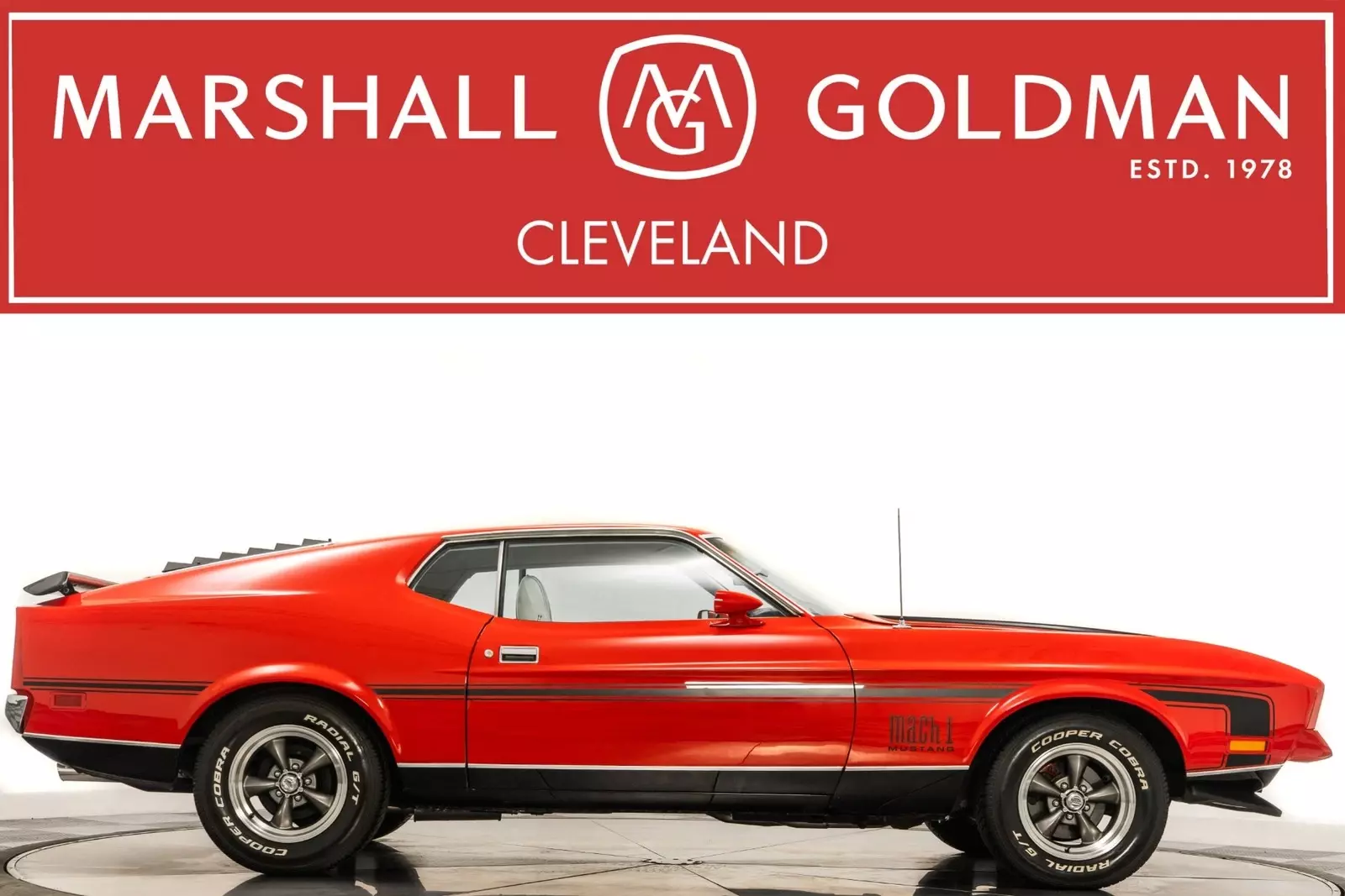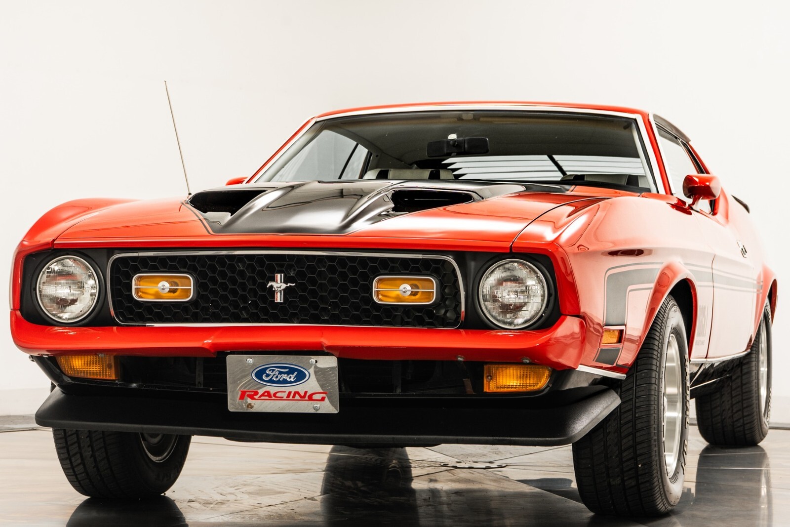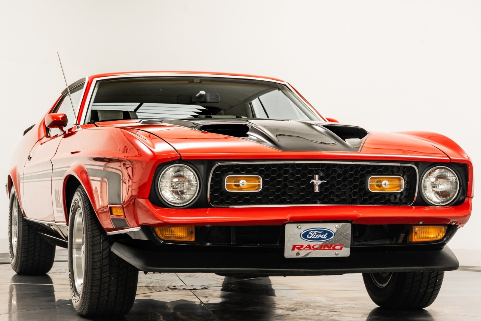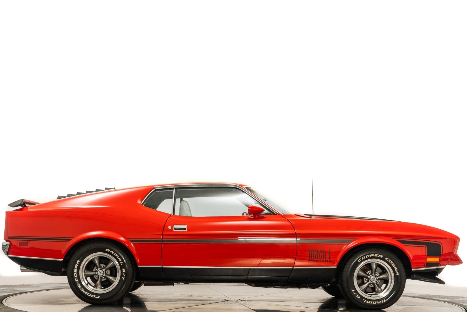 1971 Ford Mustang Mach 1 in Bright Red over White Corinthian vinyl interior showing 6,618 miles since refurbishment. This beautiful Mach 1 is loaded with a 351 2V Cleveland V8, 3 speed FMX automatic transmission, 15 inch American Racing Torq Thrust D wheels, dual exhaust, rear spoiler, rear window louvers, front air dam, color keyed front bumper, front disc brakes, 3.00:1 rear gear ratio, JVC audio hidden in the center console and much more.