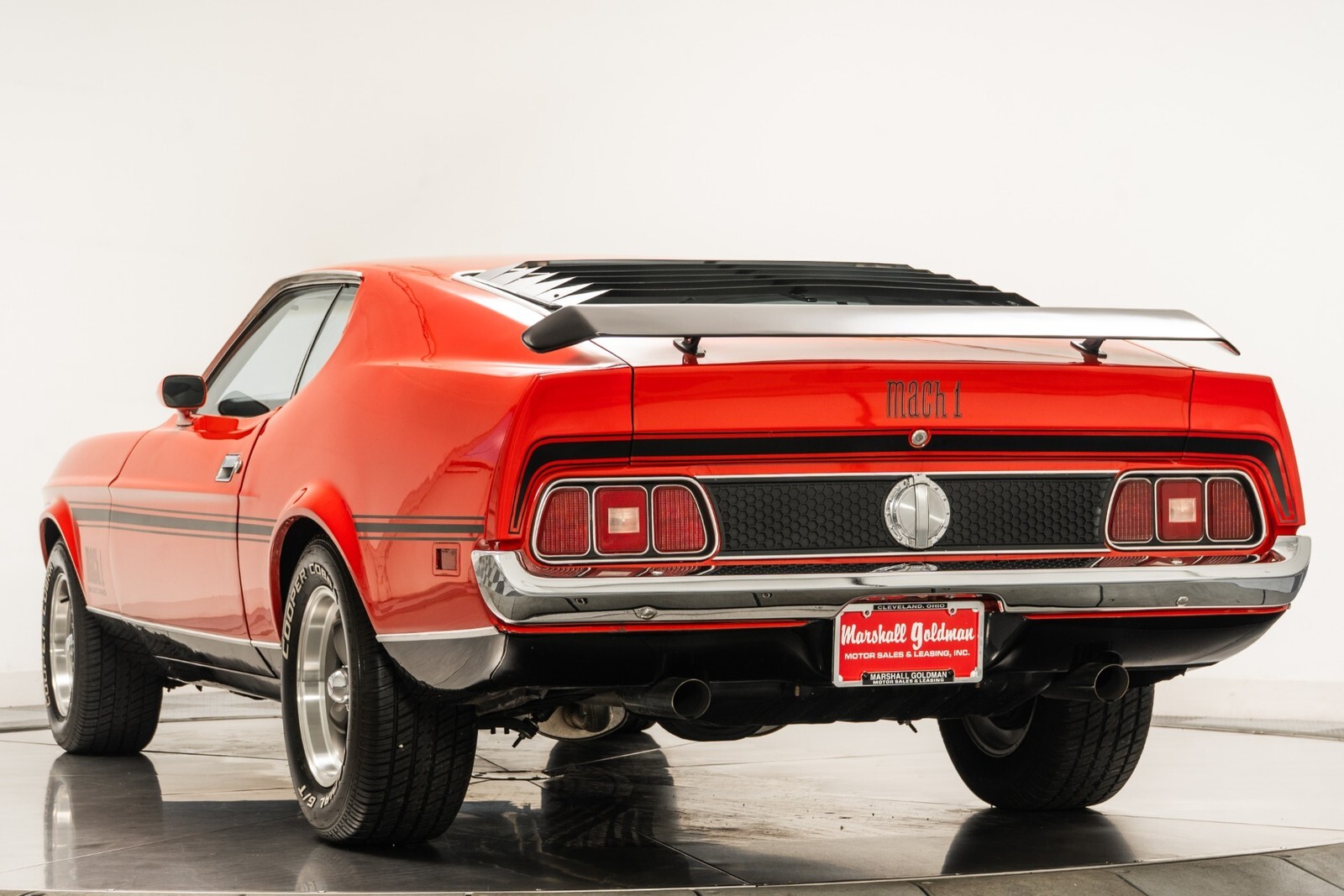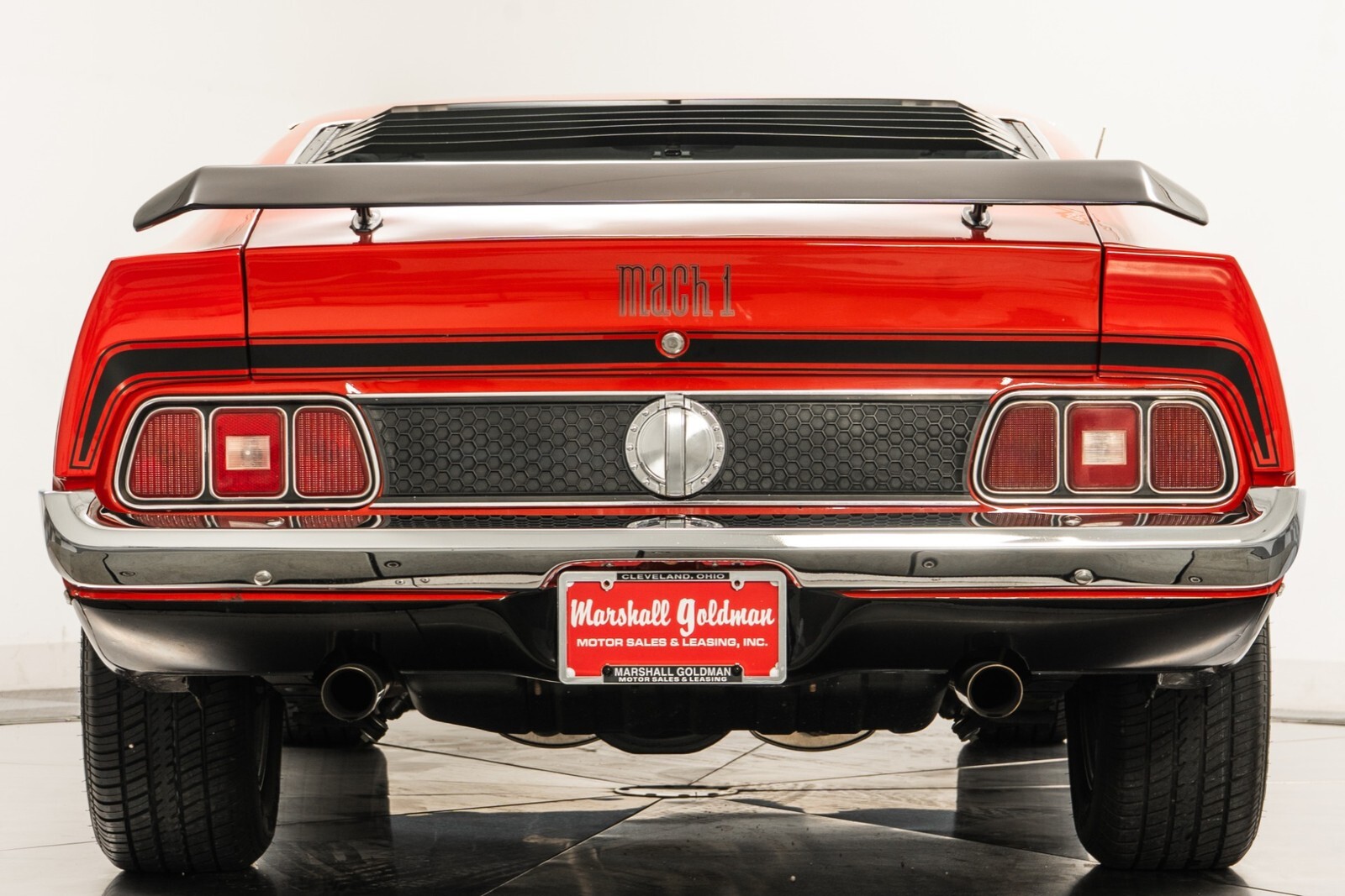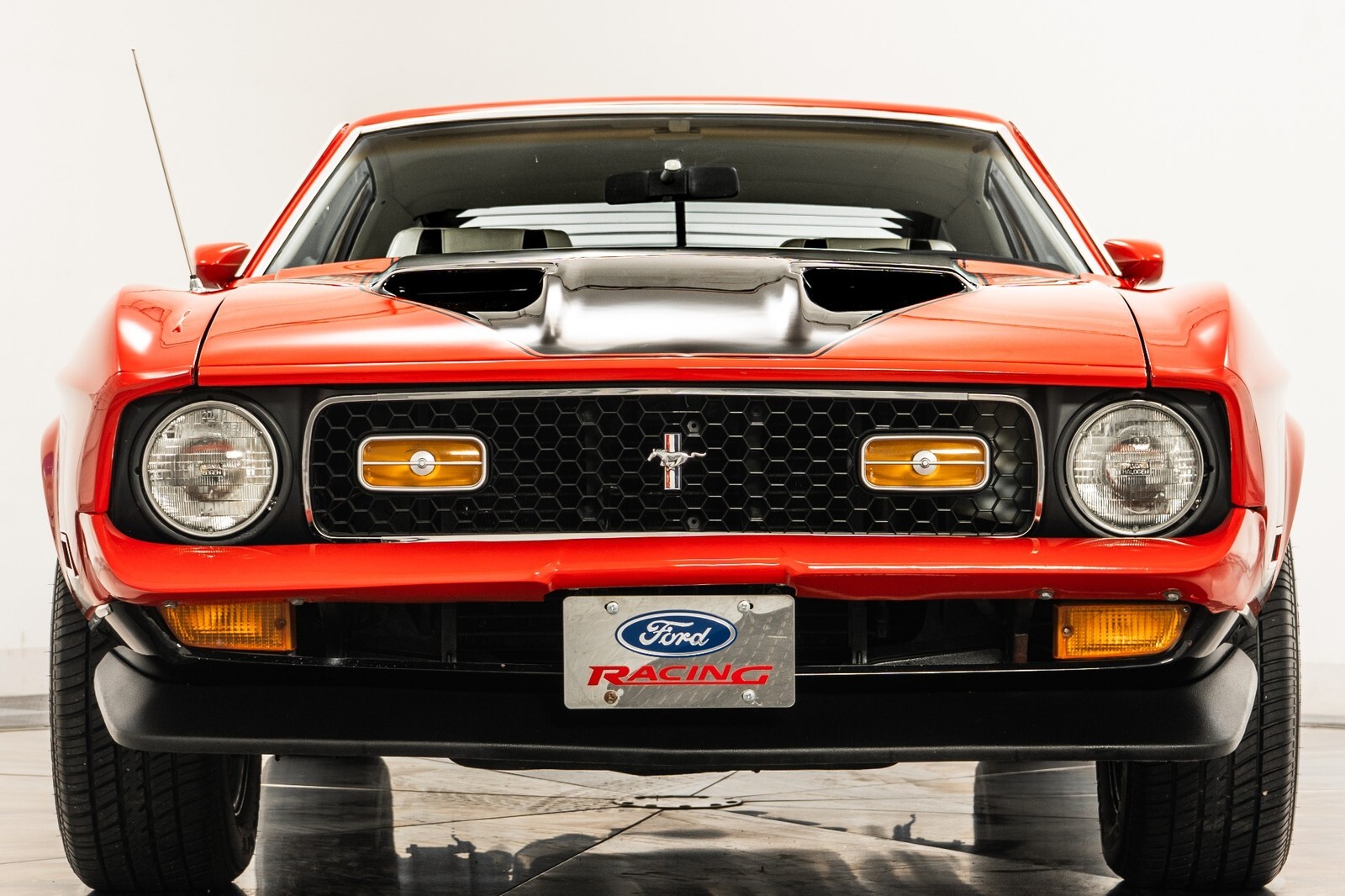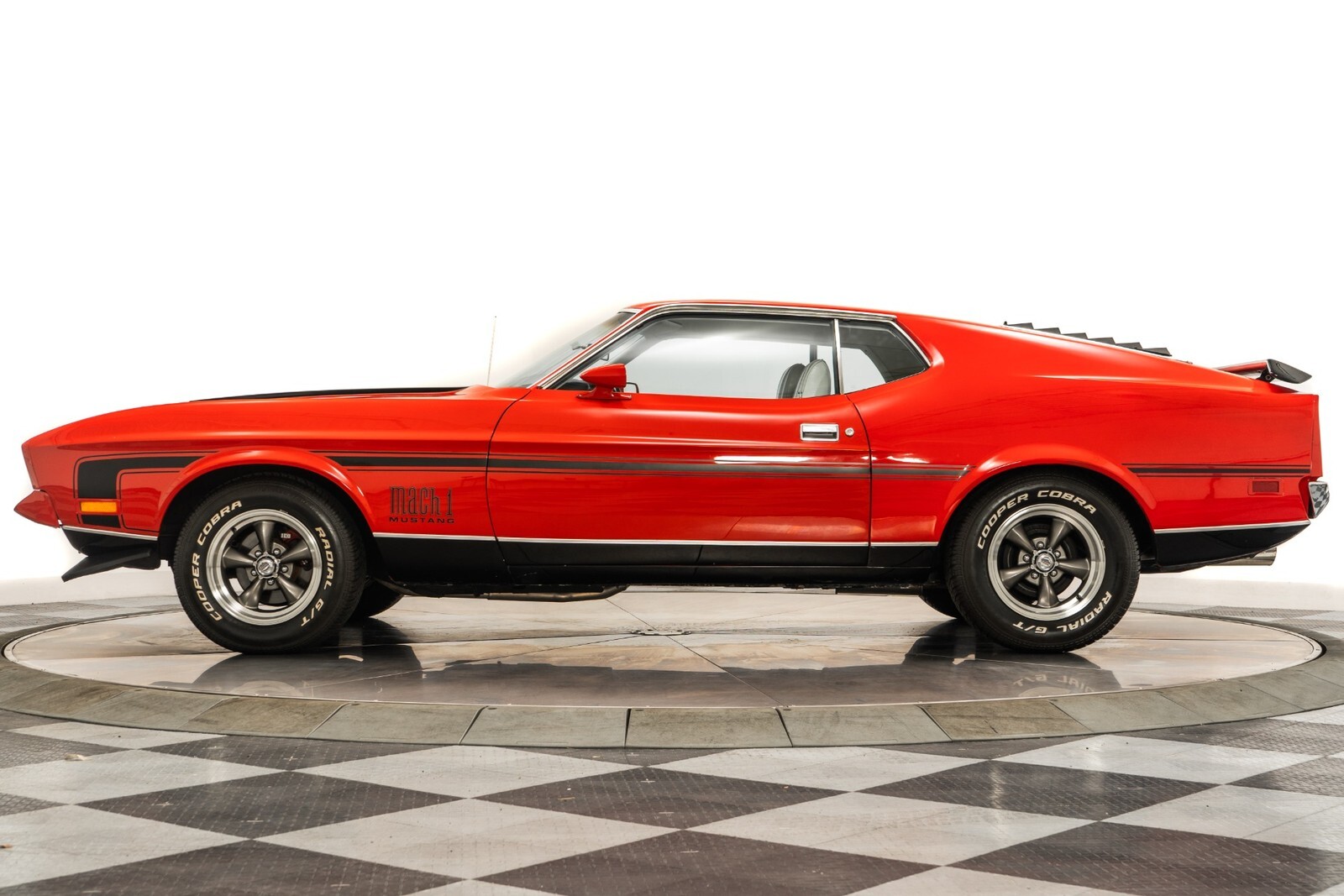 1971 Ford Mustang Mach 1 in Bright Red over White Corinthian vinyl interior showing 6,618 miles since refurbishment. This beautiful Mach 1 is loaded with a 351 2V Cleveland V8, 3 speed FMX automatic transmission, 15 inch American Racing Torq Thrust D wheels, dual exhaust, rear spoiler, rear window louvers, front air dam, color keyed front bumper, front disc brakes, 3.00:1 rear gear ratio, JVC audio hidden in the center console and much more.