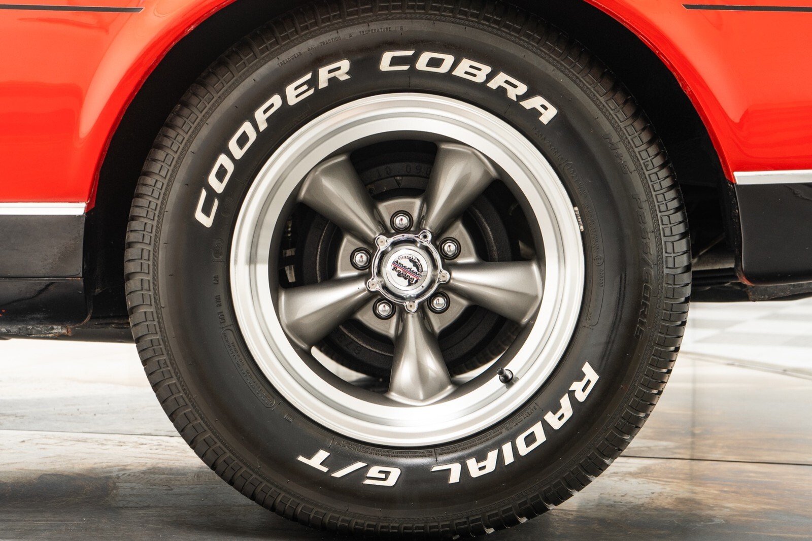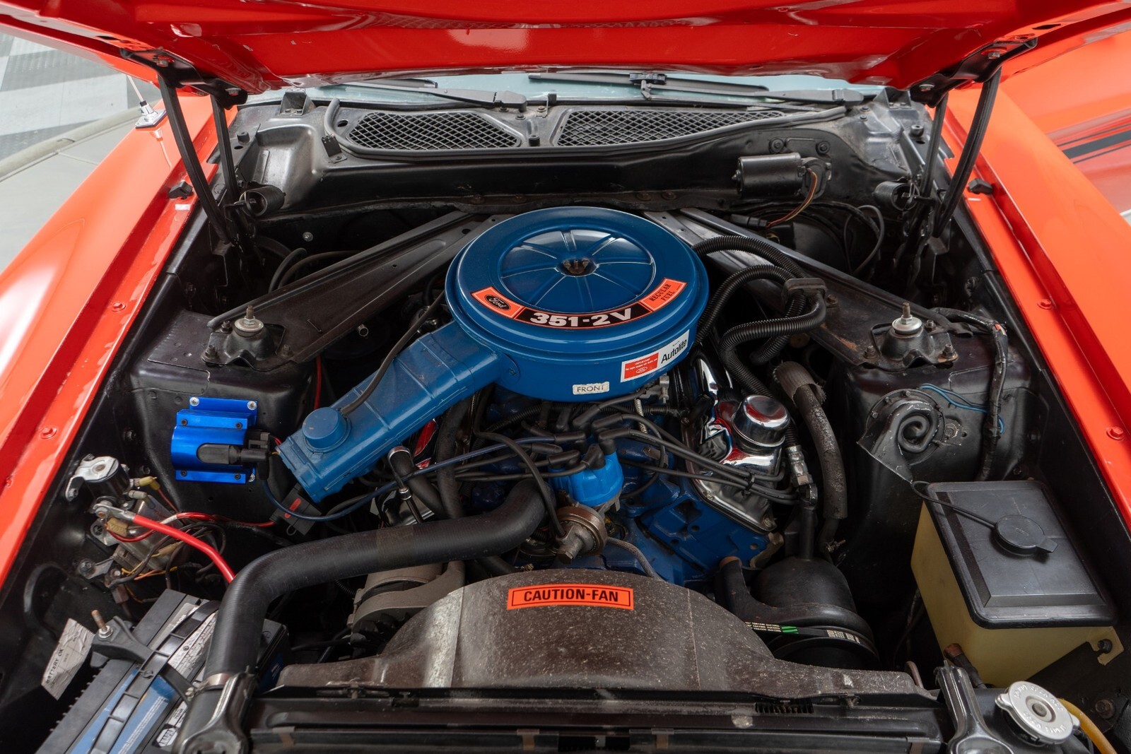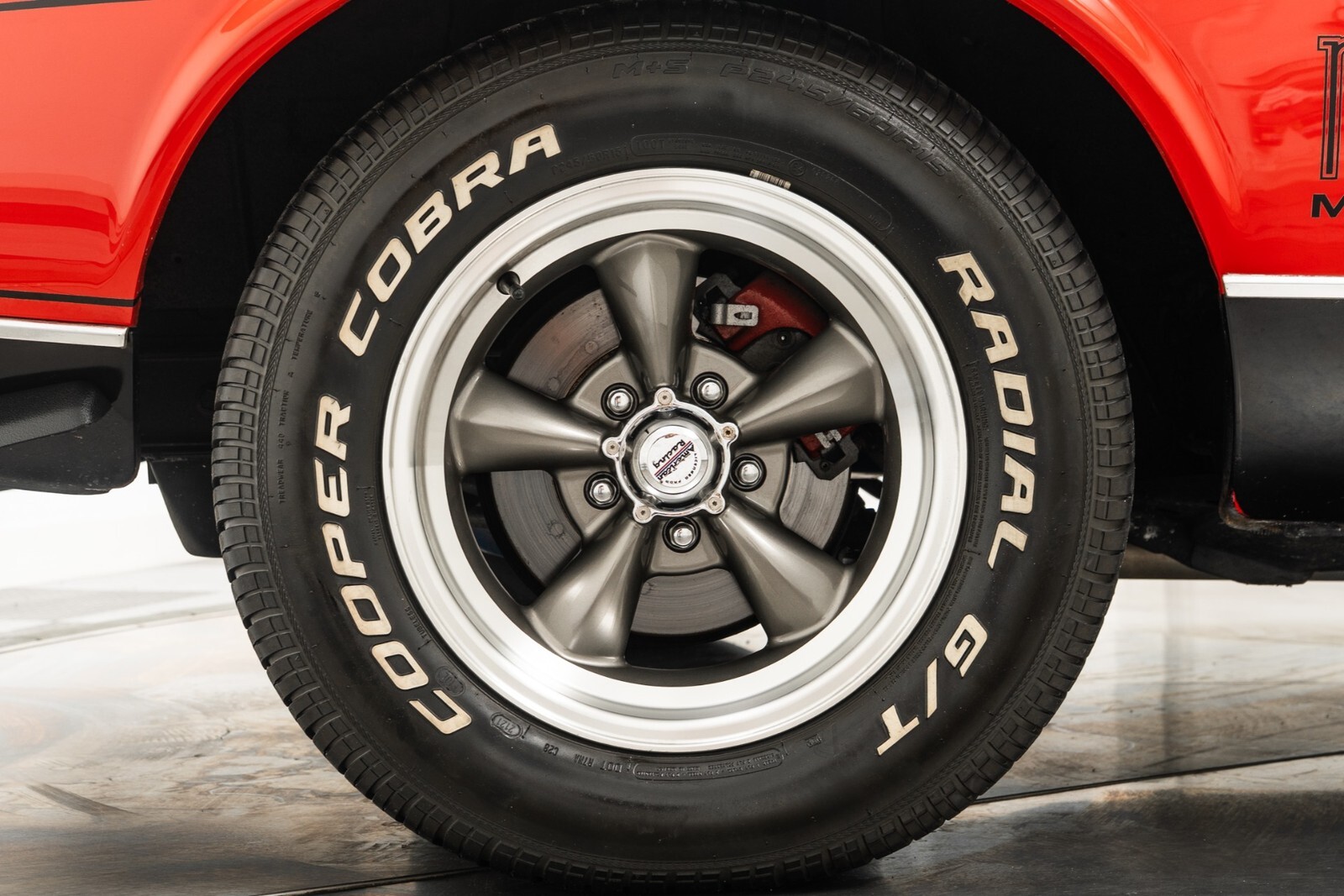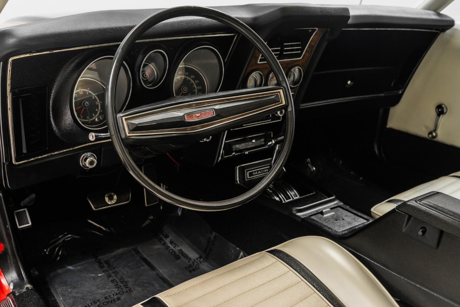 1971 Ford Mustang Mach 1 in Bright Red over White Corinthian vinyl interior showing 6,618 miles since refurbishment. This beautiful Mach 1 is loaded with a 351 2V Cleveland V8, 3 speed FMX automatic transmission, 15 inch American Racing Torq Thrust D wheels, dual exhaust, rear spoiler, rear window louvers, front air dam, color keyed front bumper, front disc brakes, 3.00:1 rear gear ratio, JVC audio hidden in the center console and much more.