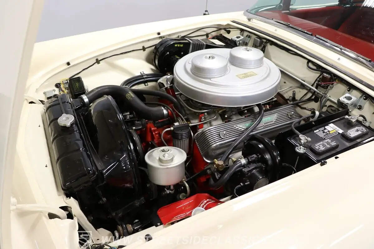 Since the red hardtop looks so distinct, we're especially glad you can remove it and have a full red interior. There are nice features like plush carpeting, power windows, a grippy color-matched steering wheel, and side wind wings, and the dash light greets you when you open the door. It's such a vintage feeling that even the AM radio is there for display. Plus, Thunderbird fans always love to see the premium Dial O Matic seat. It lets you know that a memory power seat isn't just something you find in a modern Mercedes! We especially like the '57 T-Bird because of the sporty feeling of the layout. The machine-turned dash was always a nice feature, and this year also got a revised gauge layout that put everything right in front, including the handy tach.